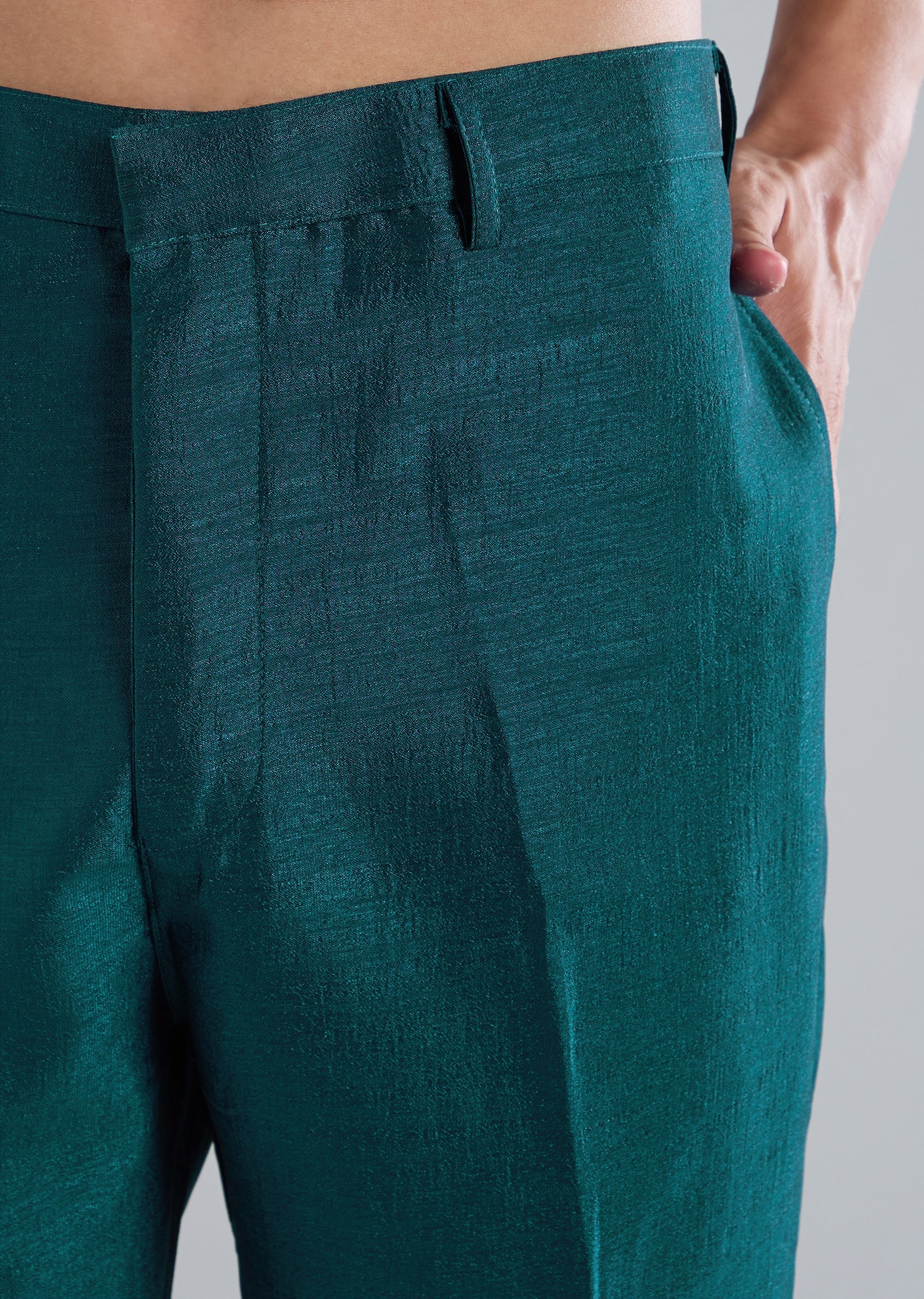 Vibrant and festive, this peacock blue kurta jacket set is perfect for mehendi or sangeet celebrations. Crafted with silk as the primary fabric and cotton as the secondary base, it... More Product Details