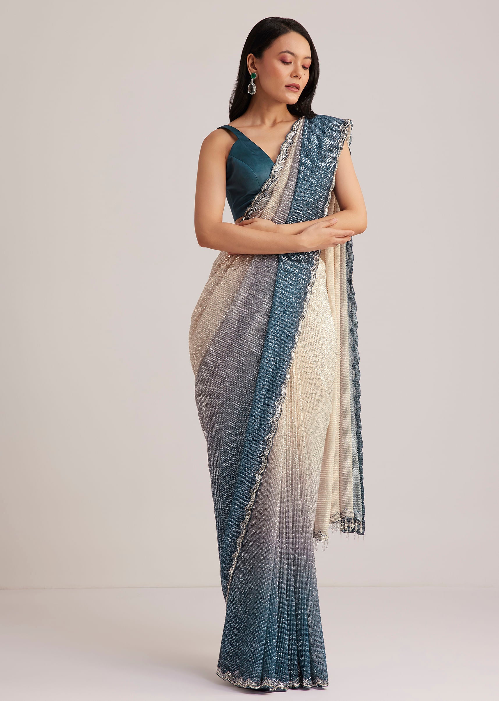 Peacock Blue Ombre Sequins Saree With Scalloped Embroidered Border