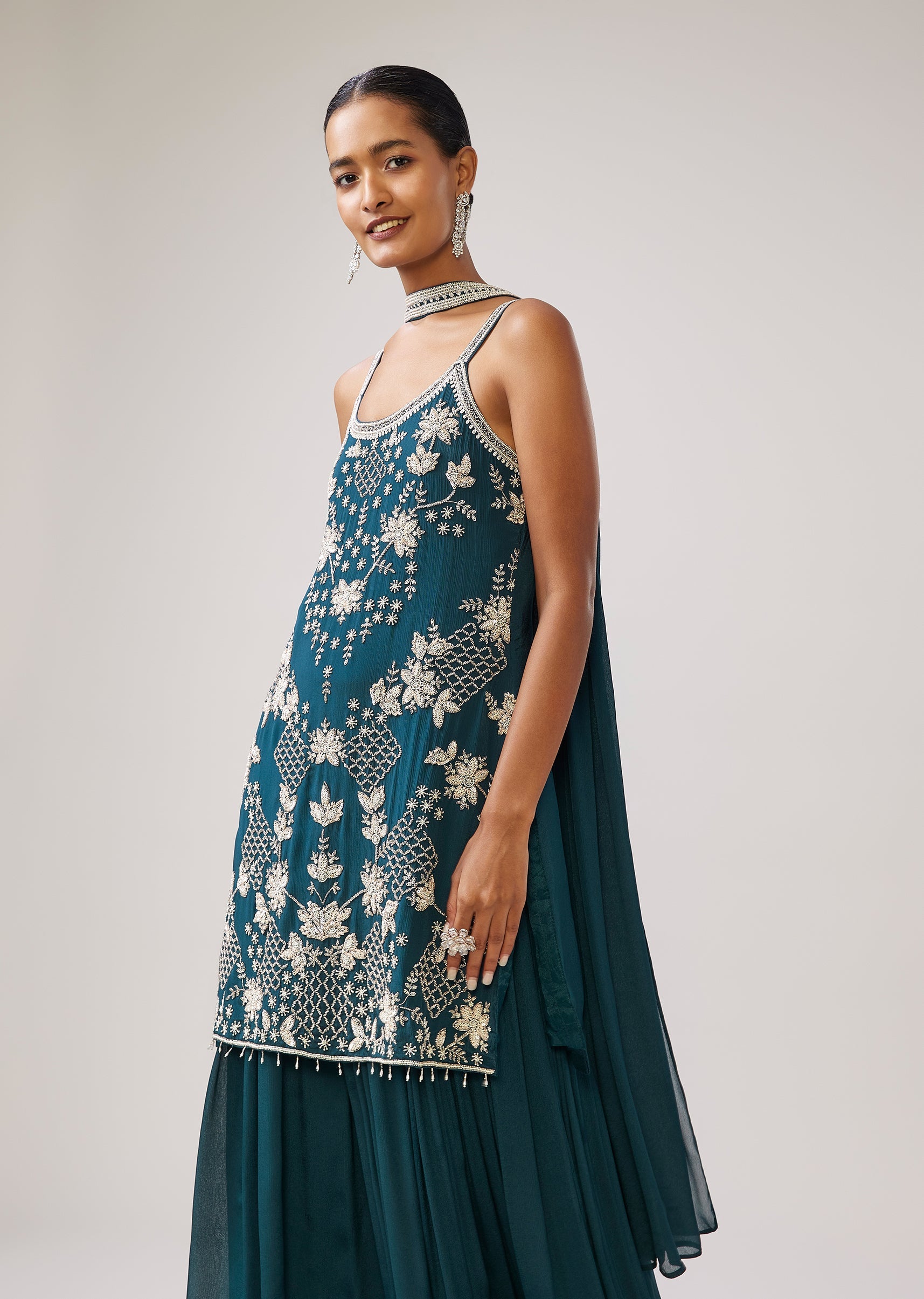Peacock Blue Sequin Strap Kurta Palazzo Set With Dupatta