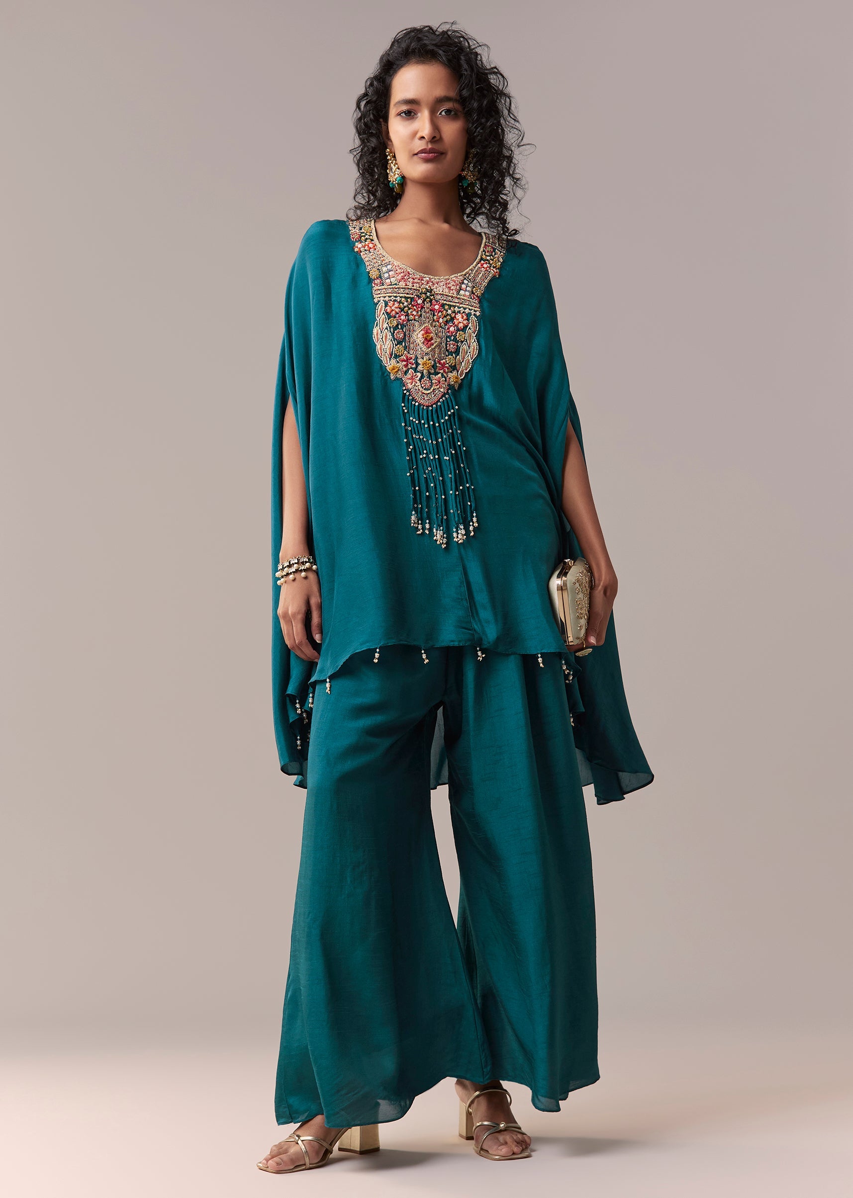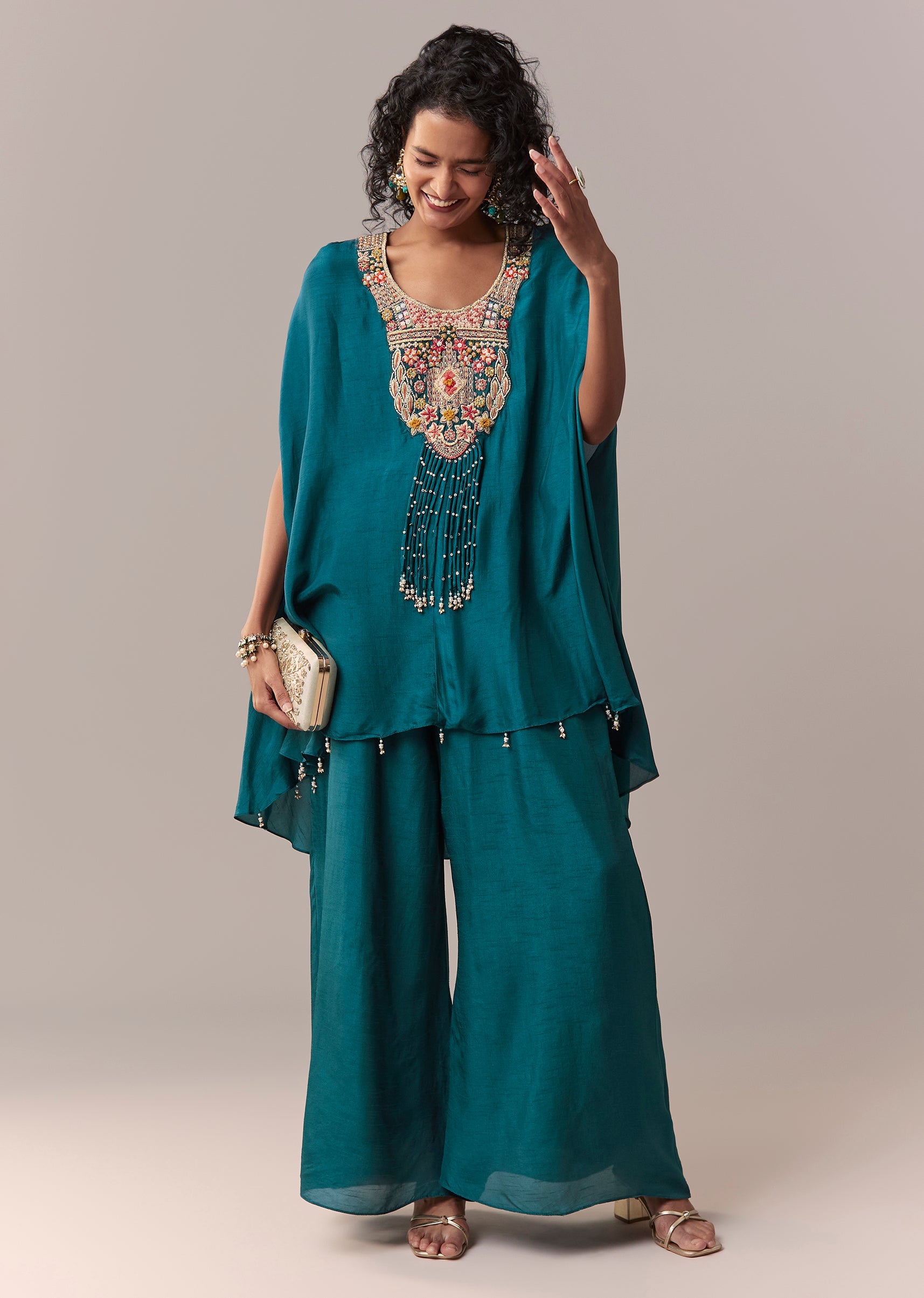 This contemporary co-ord set is crafted in smooth dola silk and designed to make a statement. Featuring a thread and moti embroidered cape layered over a matching inner, it is paired with wide palazzo pants for effortless movement. The round neckline and clean construction give it a polished festive appeal, while the elasticated waist ensures comfort. Awarded as the Most Trusted Brand, we're delivering styles you love, just as promised.