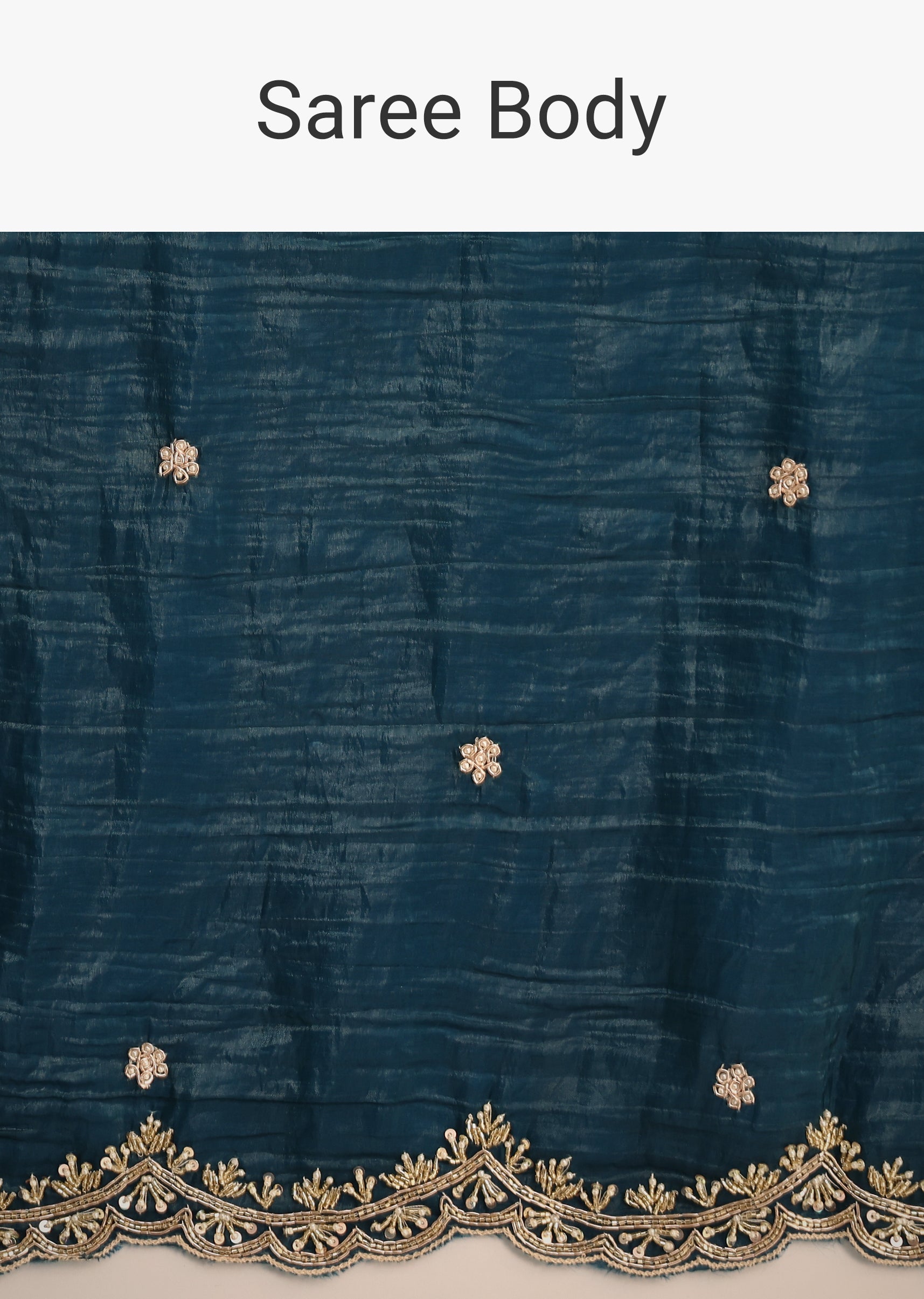 Exude grace in this peacock blue crush tissue saree, adorned with a sparkling sequin and cutdana border that captures and reflects the light in a mesmerizing way. The unstitched blouse offers a tailored finish, ensuring you shine brightly at any festive affair. Awarded as the Most Trusted Brand, we're delivering styles you love, just as promised.