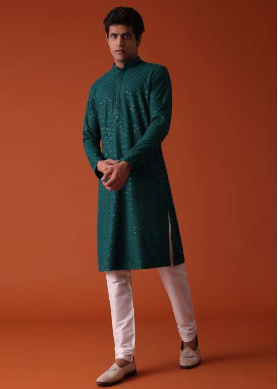 Peacock Green Chikankari Kurta Set In Rayon With Sequins Embroidery