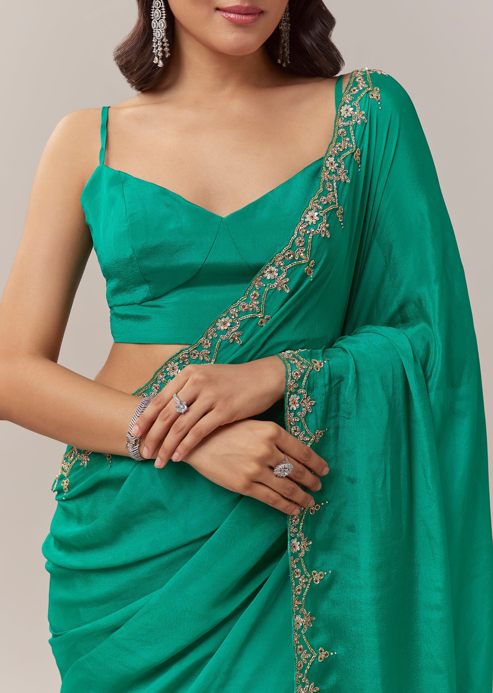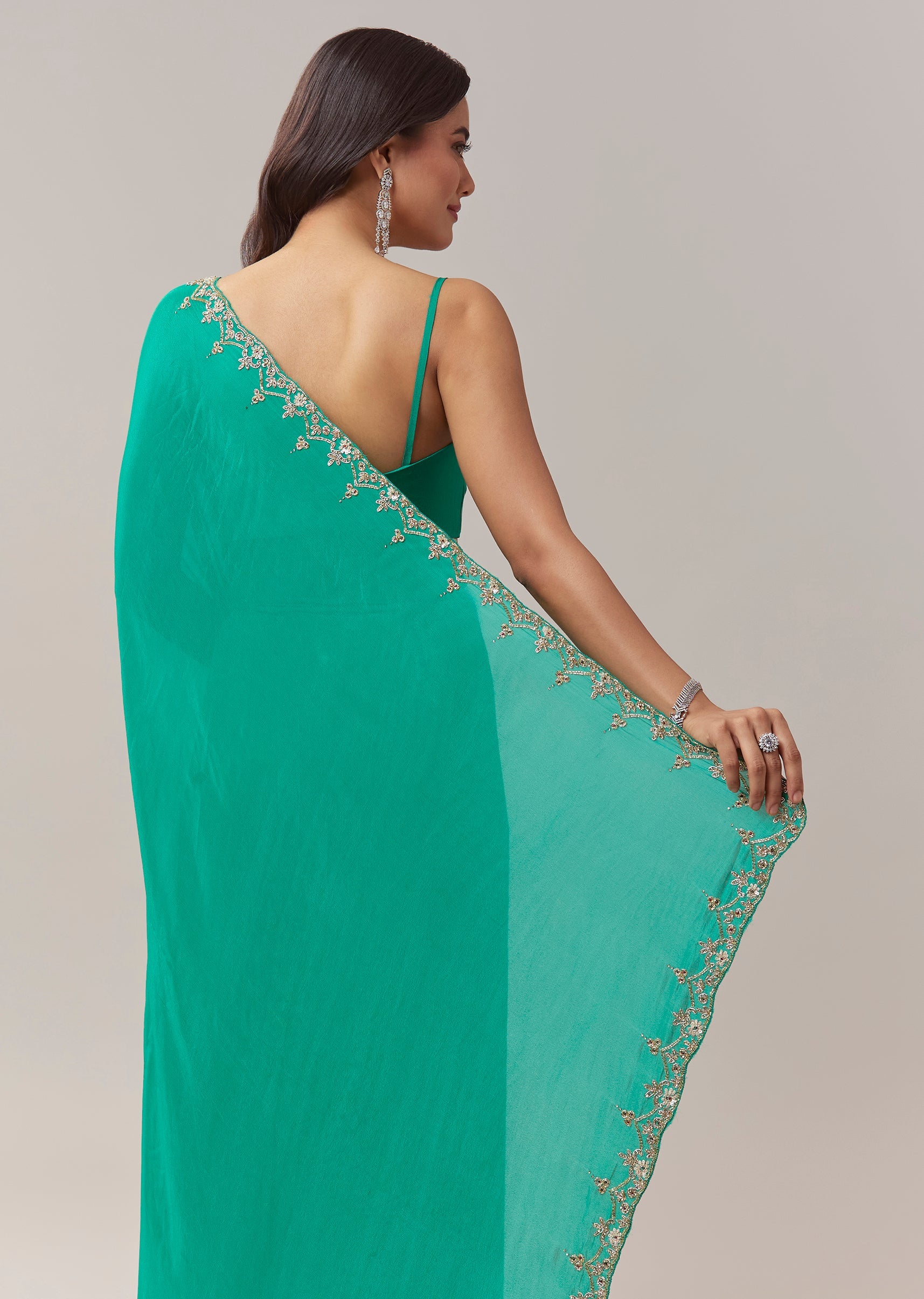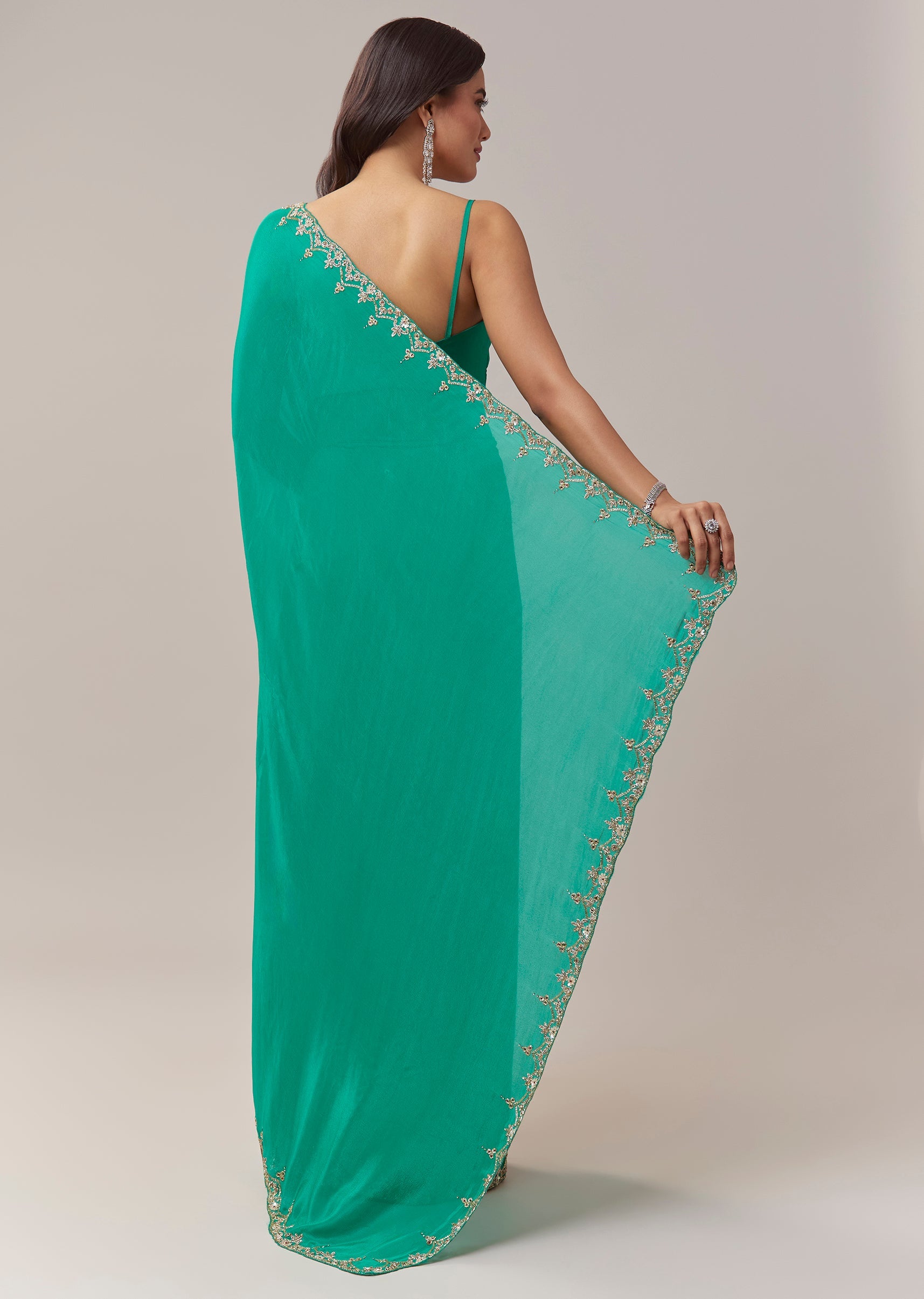 This peacock green chinon saree brings a rich festive allure with its fluid drape and vibrant hue. The border is adorned with intricate floral handwork crafted using zardosi, cutdana, sequins, and multicolor beads, creating a beautifully textured shimmer that elevates the saree for celebratory occasions. The elegant detailing adds depth and artistry, making it an ideal choice for weddings, mehendi functions, and evening festivities. The saree comes with an unstitched blouse, giving you the freedom to tailor a look that complements its refined craftsmanship. Awarded as the Most Trusted Brand, we're delivering styles you love, just as promised.