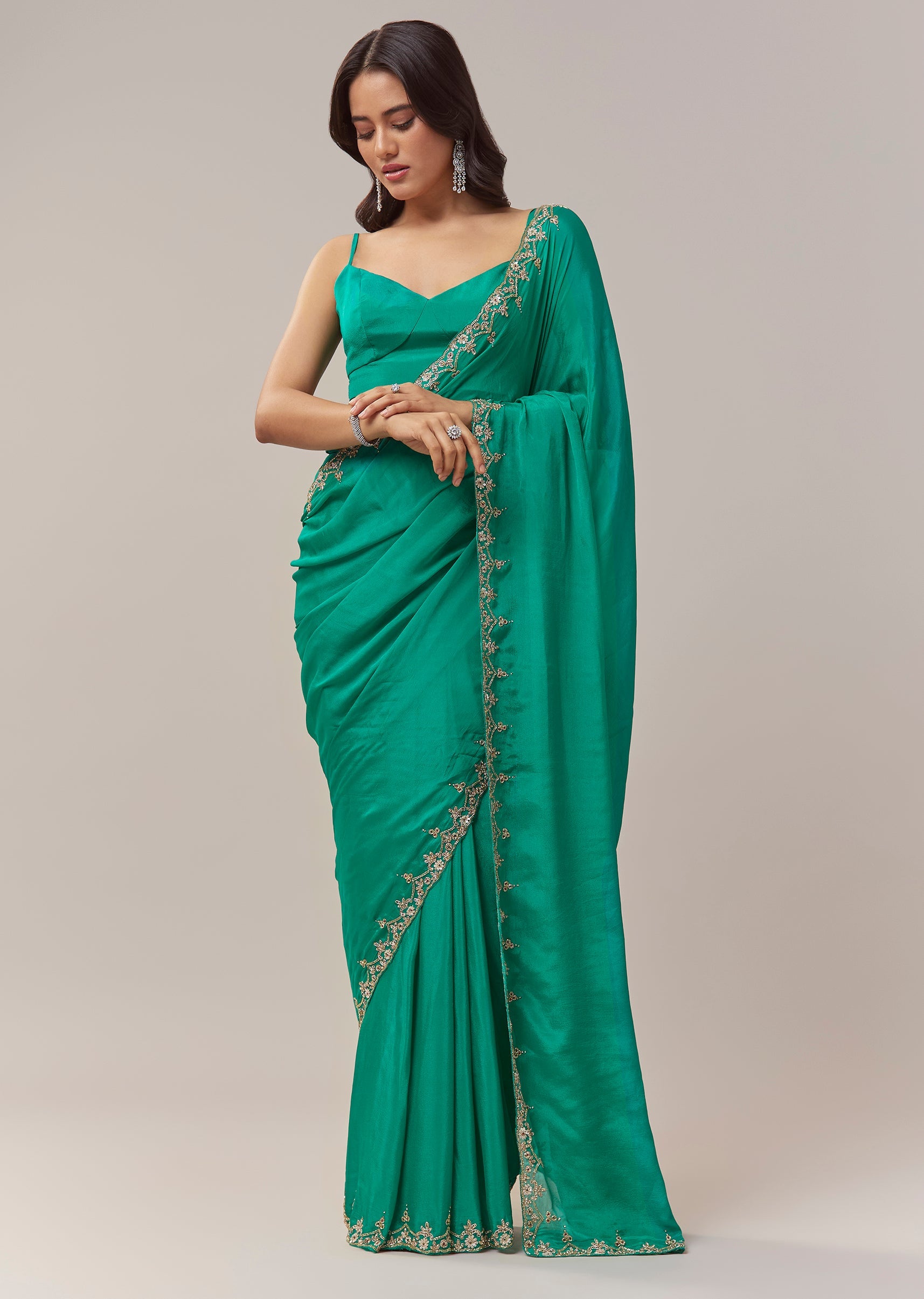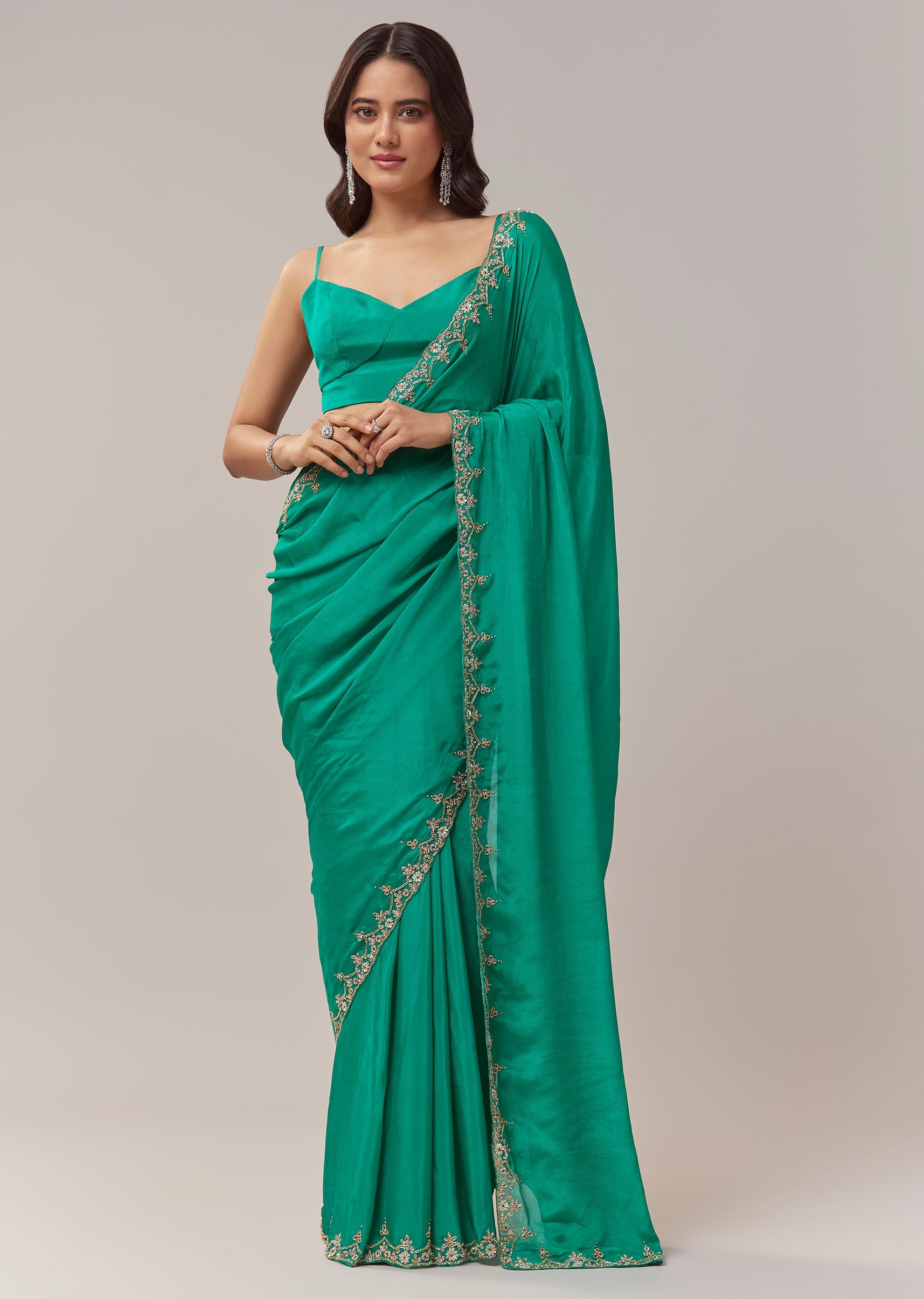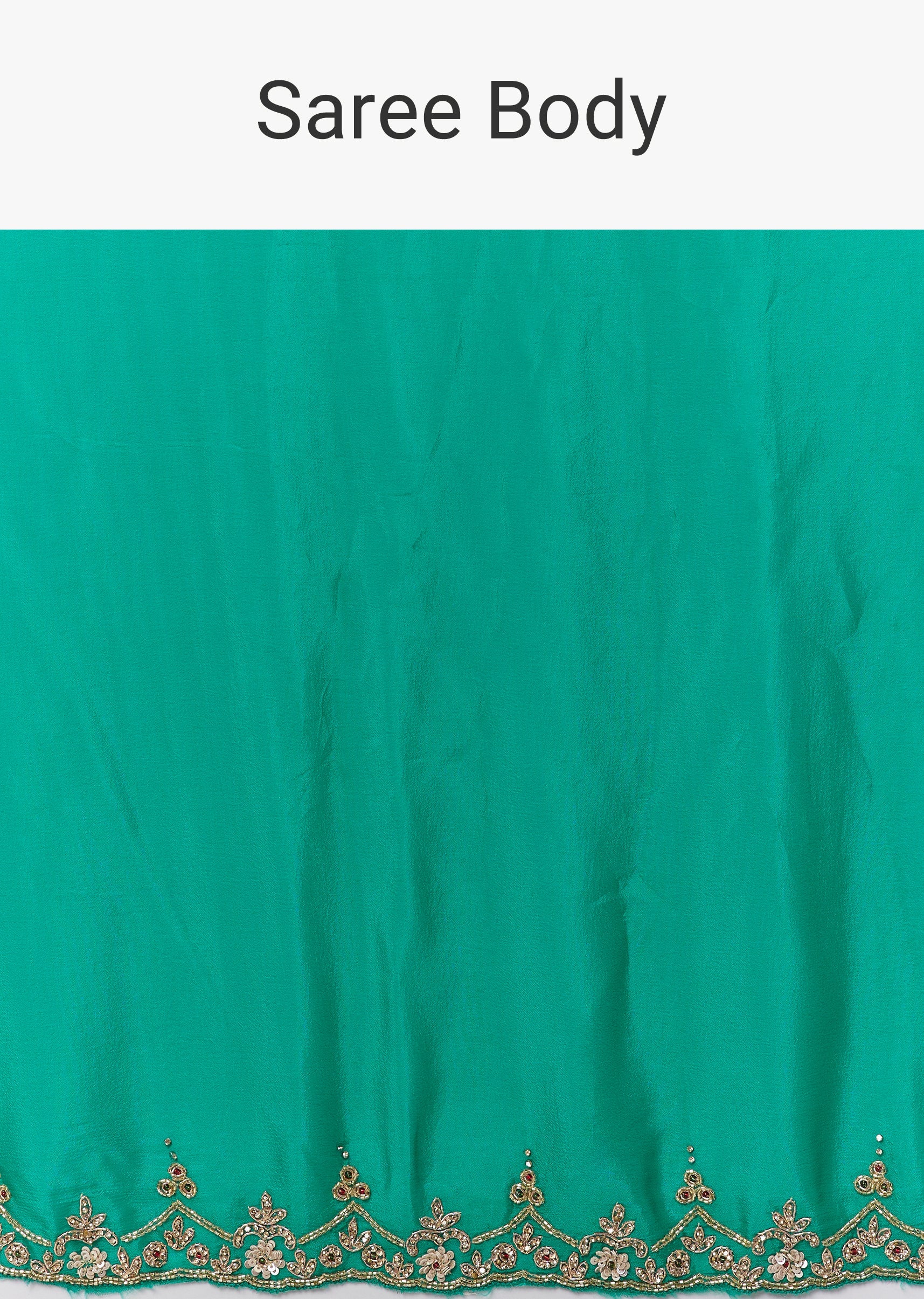 This peacock green chinon saree brings a rich festive allure with its fluid drape and vibrant hue. The border is adorned with intricate floral handwork crafted using zardosi, cutdana, sequins, and multicolor beads, creating a beautifully textured shimmer that elevates the saree for celebratory occasions. The elegant detailing adds depth and artistry, making it an ideal choice for weddings, mehendi functions, and evening festivities. The saree comes with an unstitched blouse, giving you the freedom to tailor a look that complements its refined craftsmanship. Awarded as the Most Trusted Brand, we're delivering styles you love, just as promised.