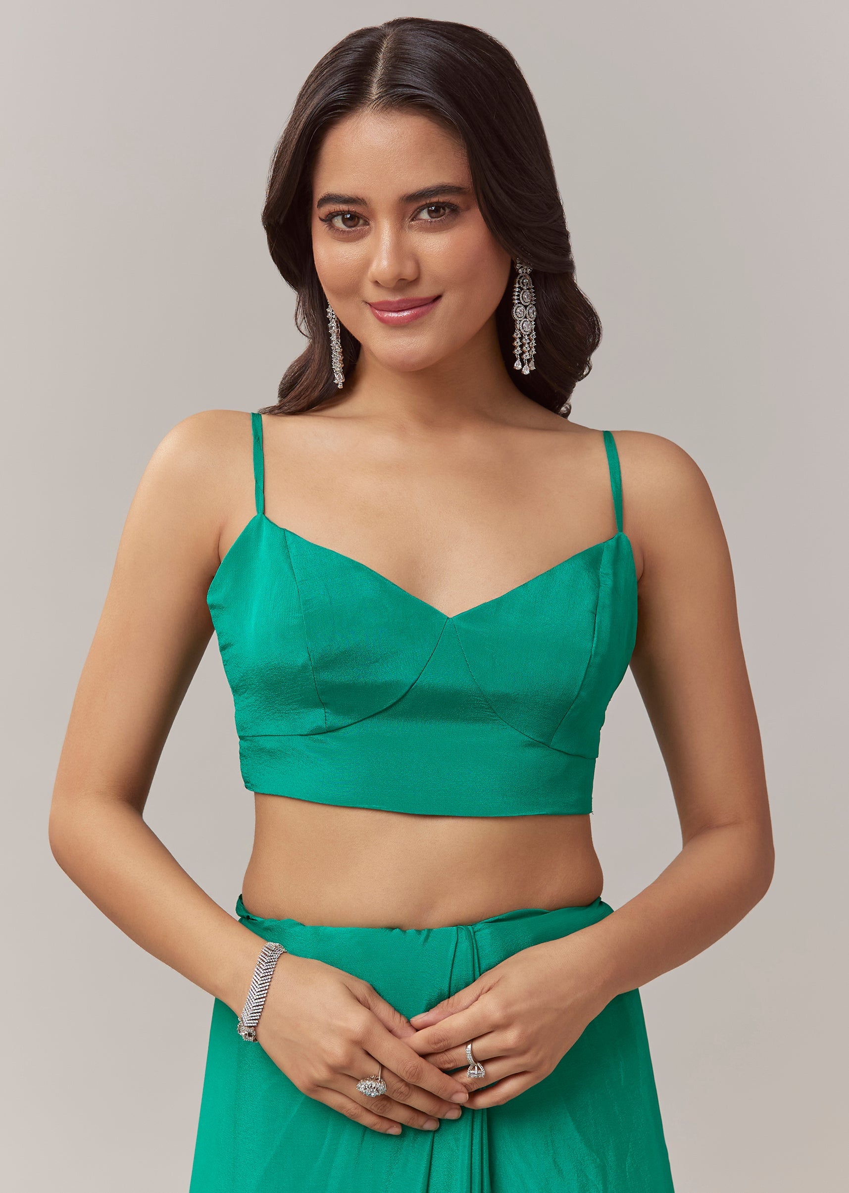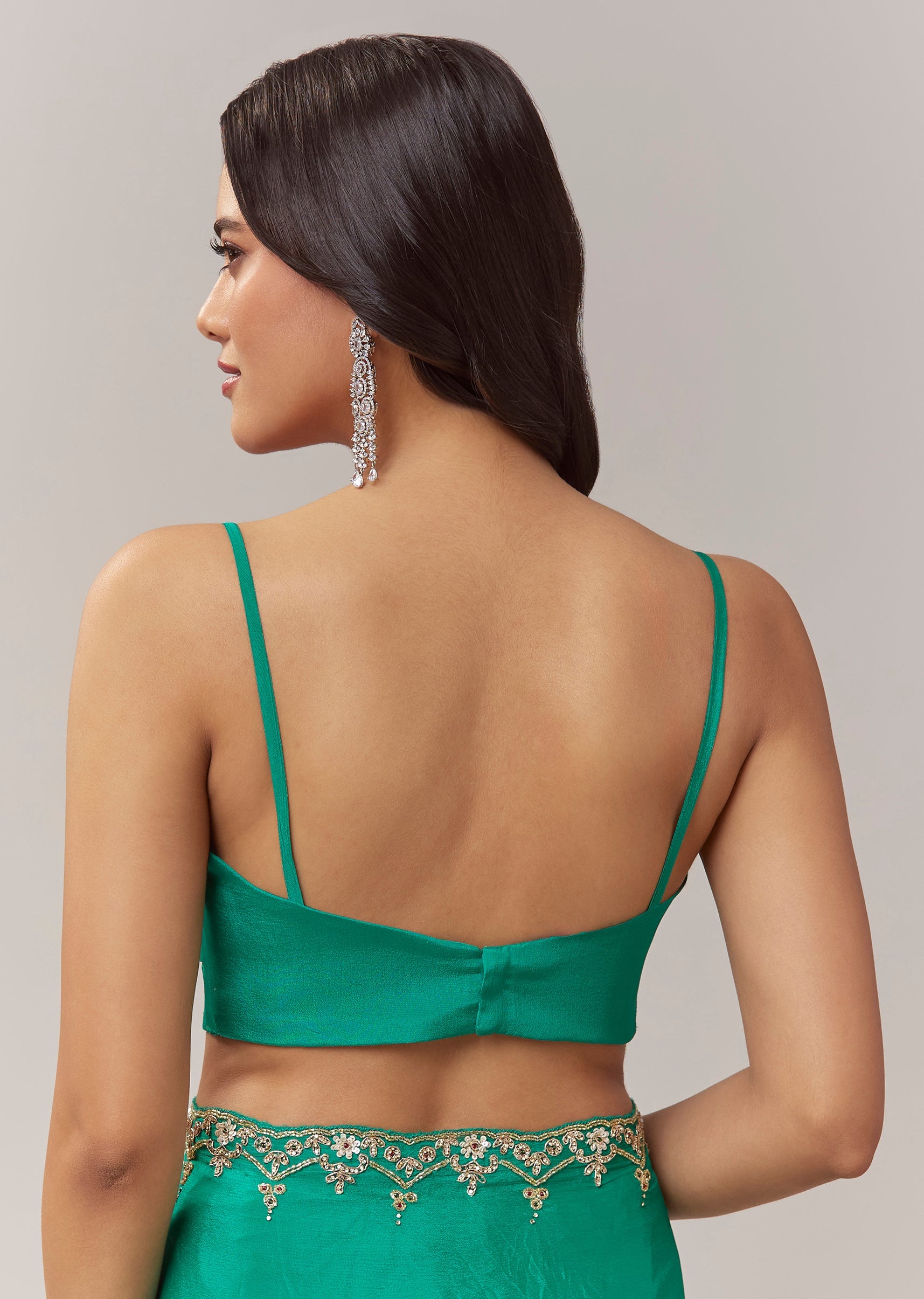 Choose gold toned earrings and a sleek bun to highlight the rich green shade and the intricate handwork on the border.
