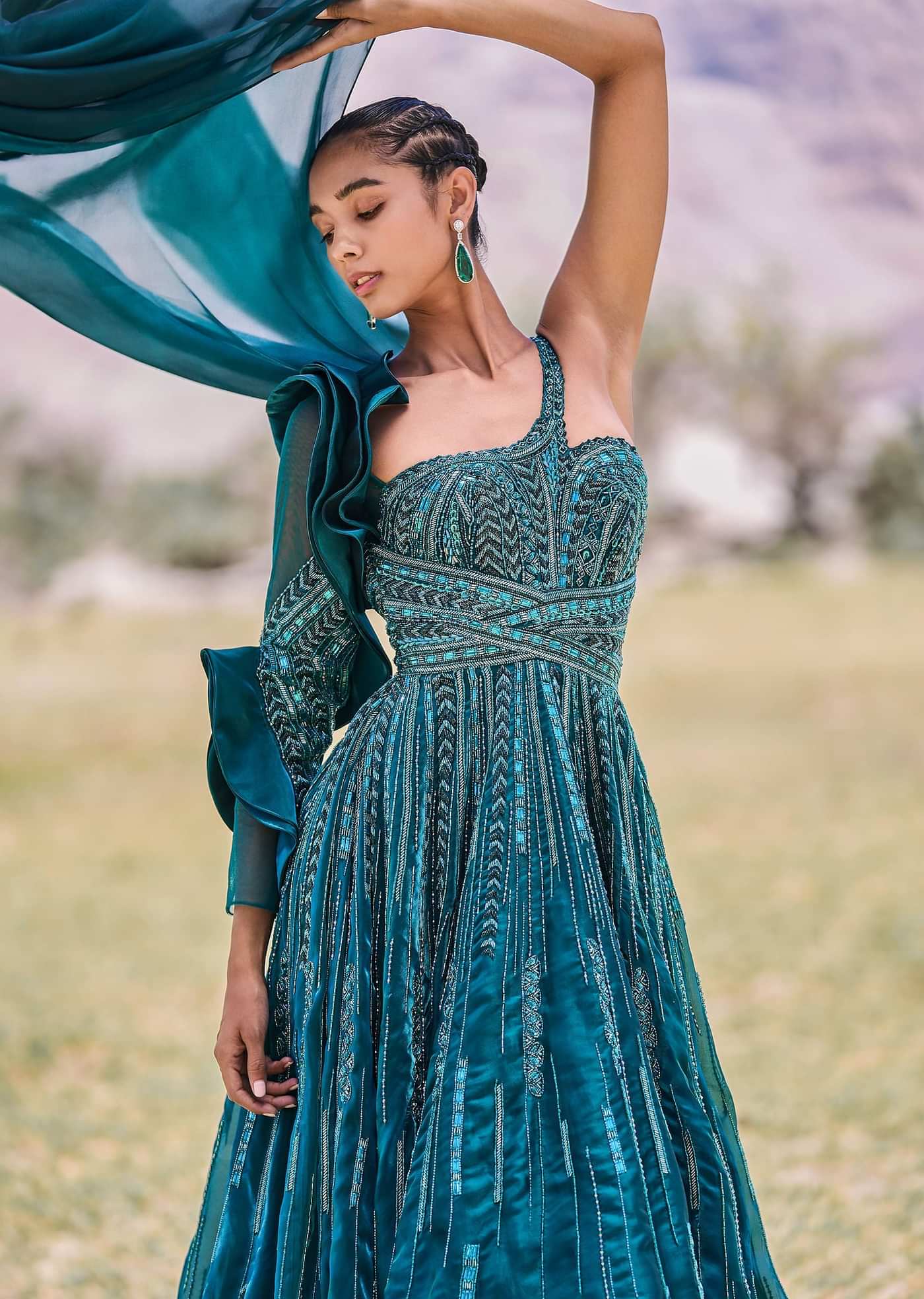 Peacock Green Embroidered Circular Frill Gown With Long Trail
