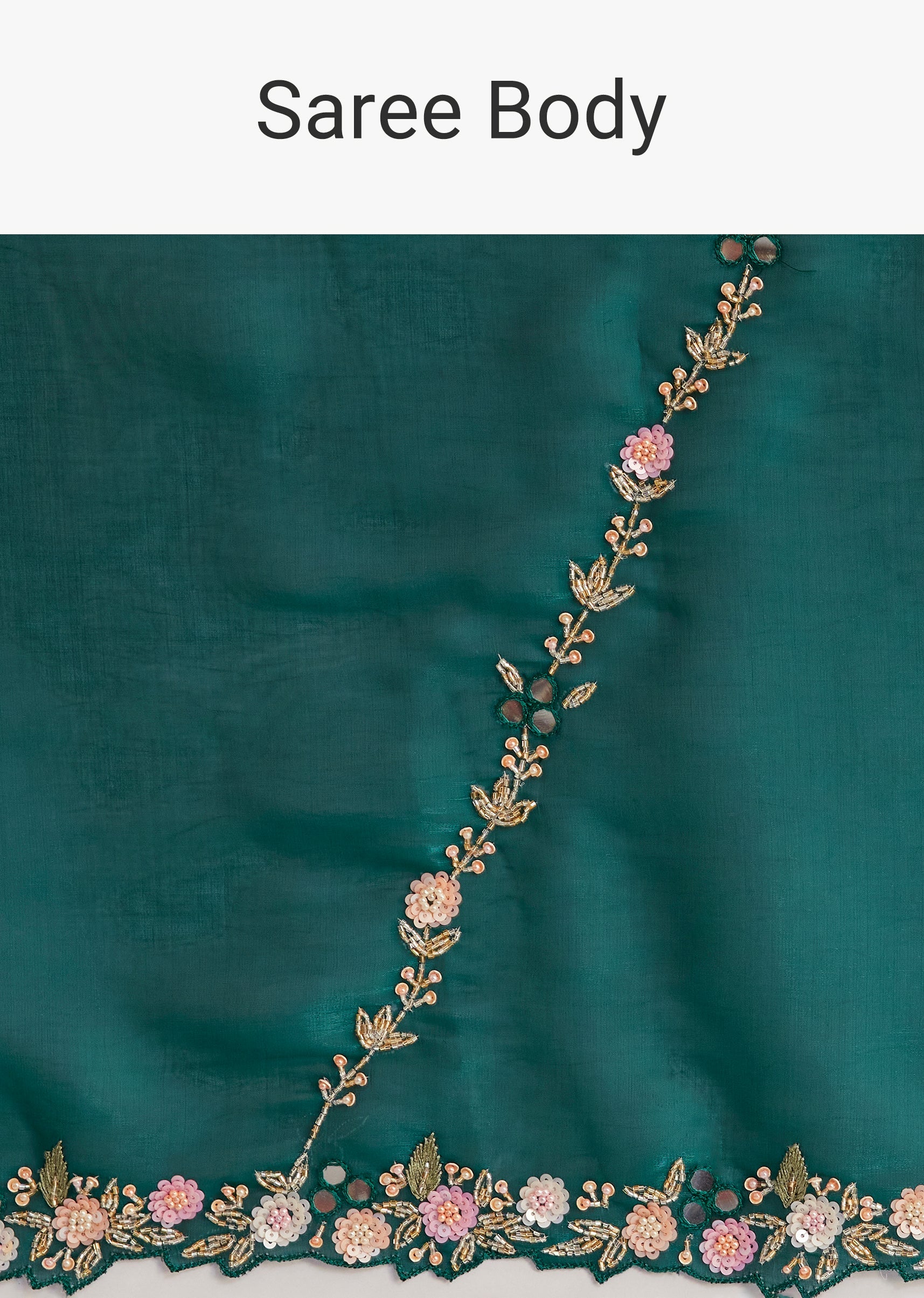 Peacock Green Tissue Saree With Floral Embroidered Border