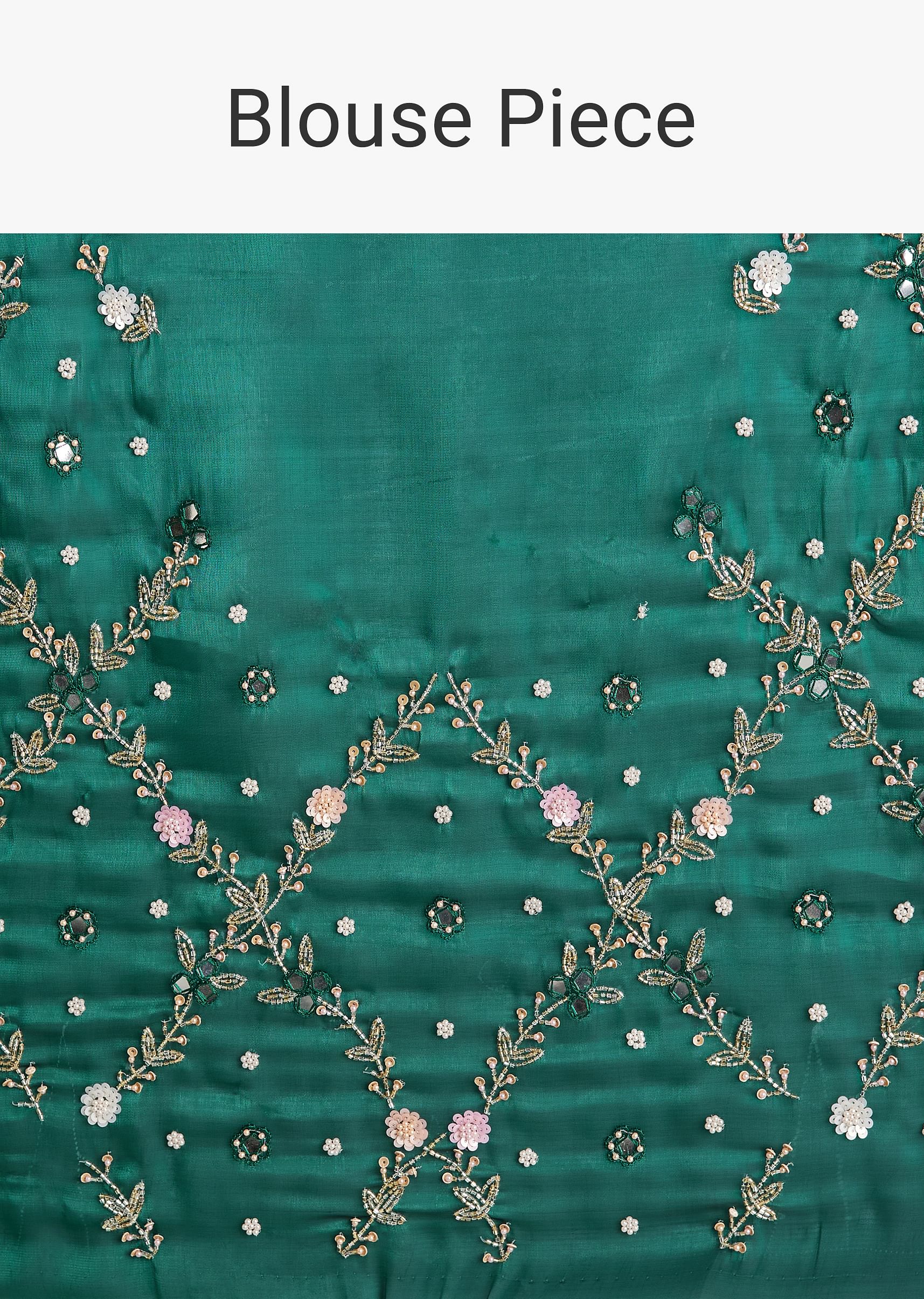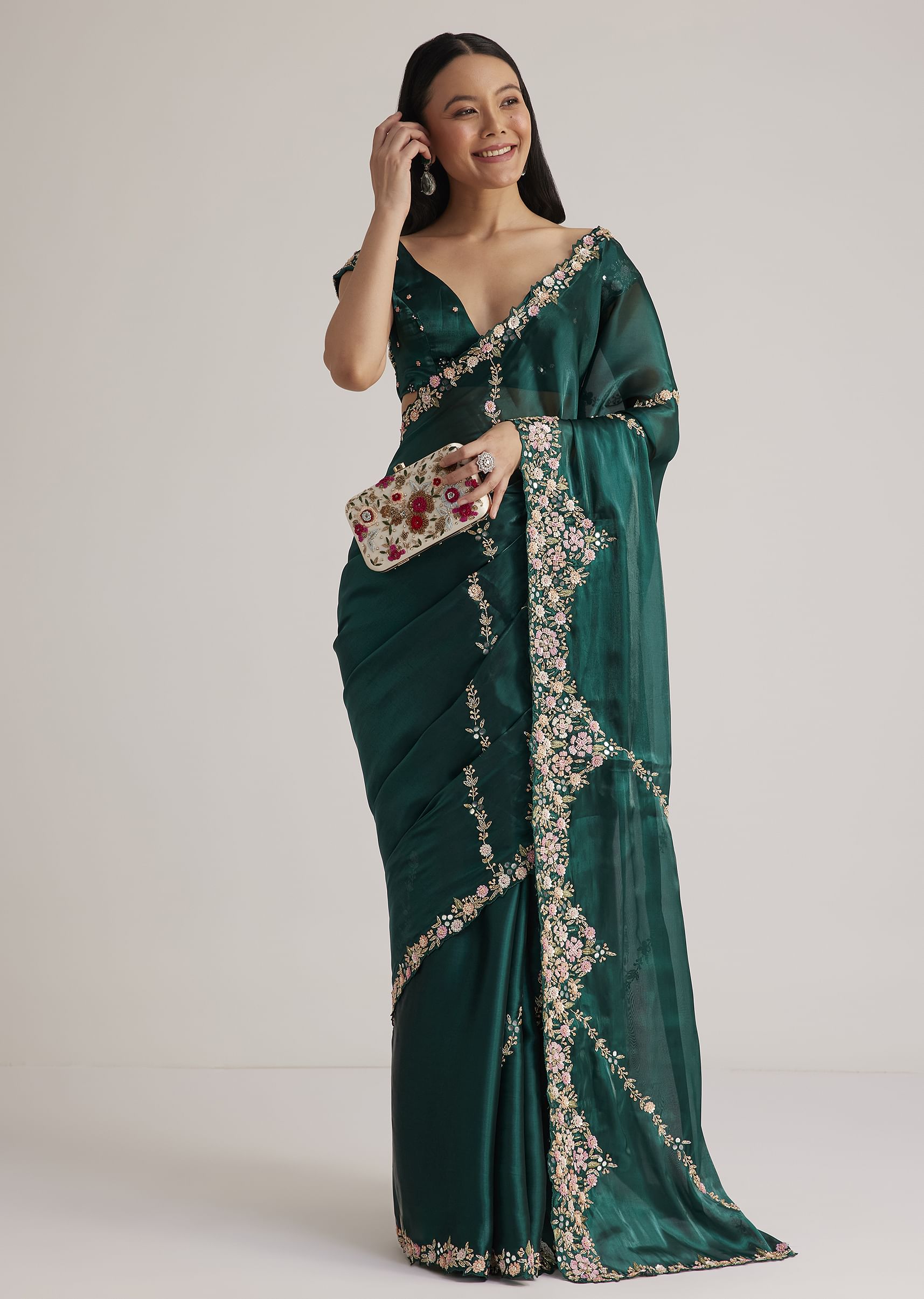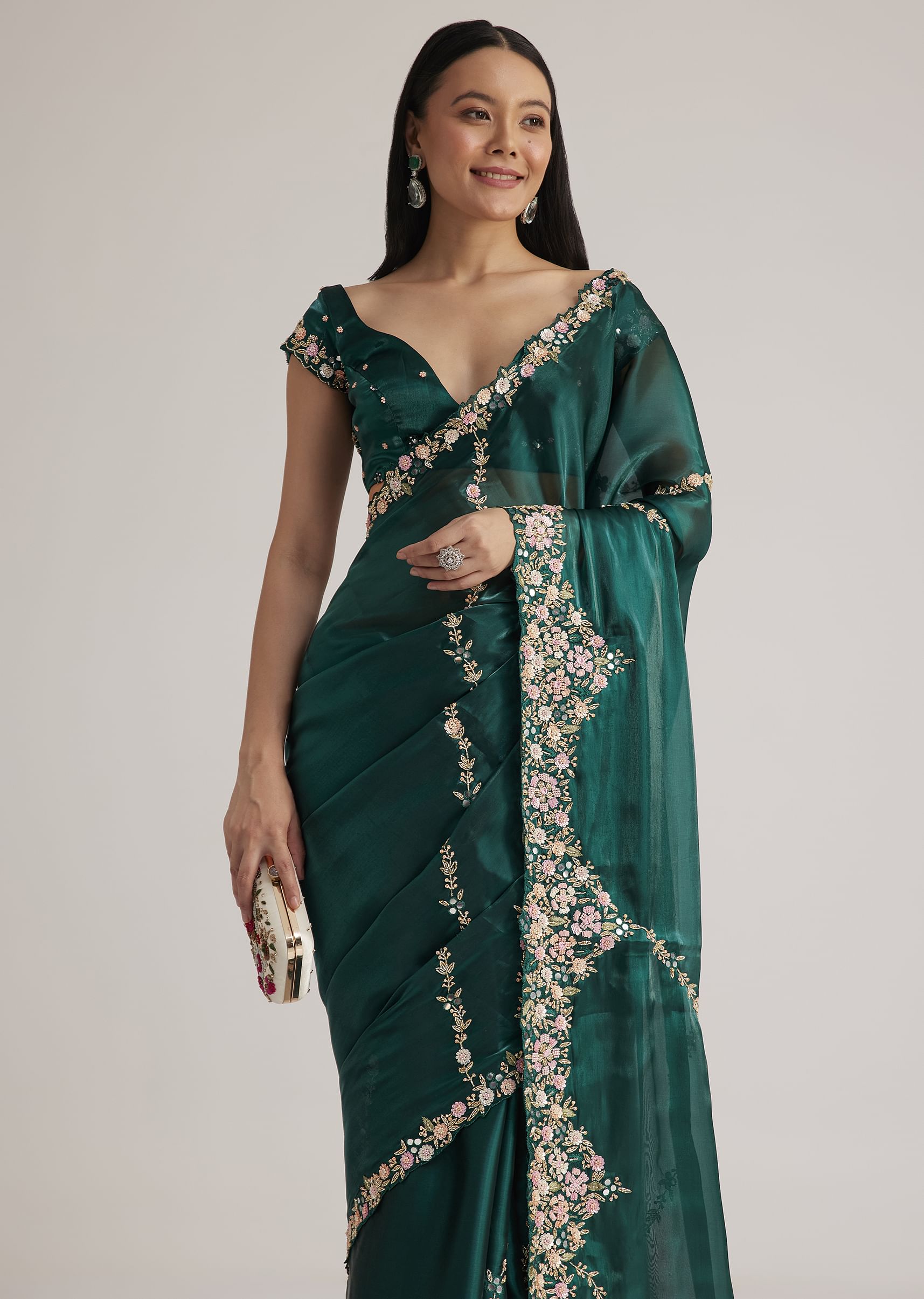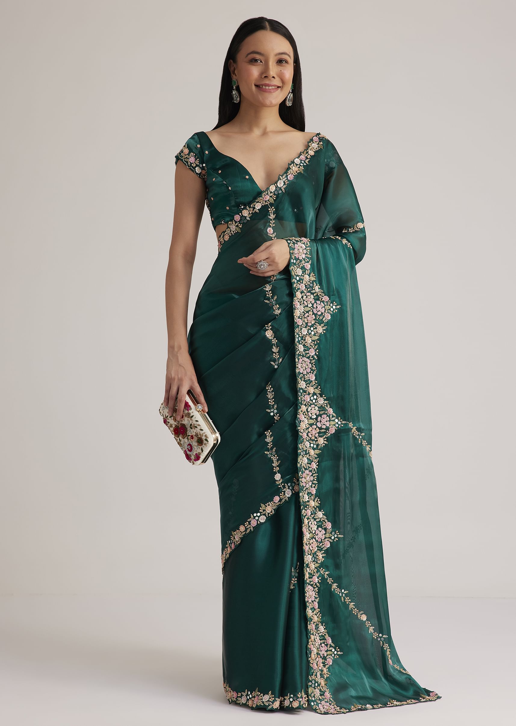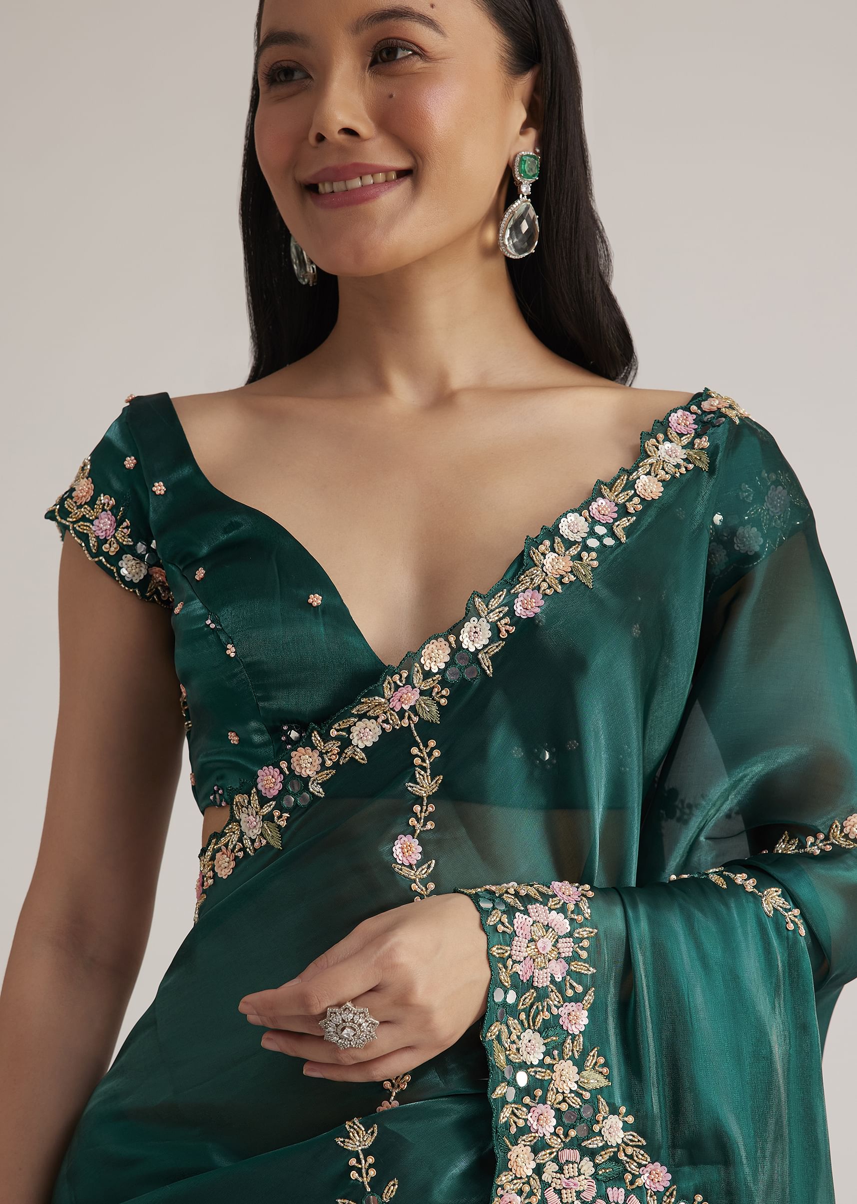 - Unfold The Charm Of Opulence With This Peacock Green Glass Tissue Saree, Exquisitely Crafted With Floral Embroidery Using Cutdana, Sequins, And Beads.