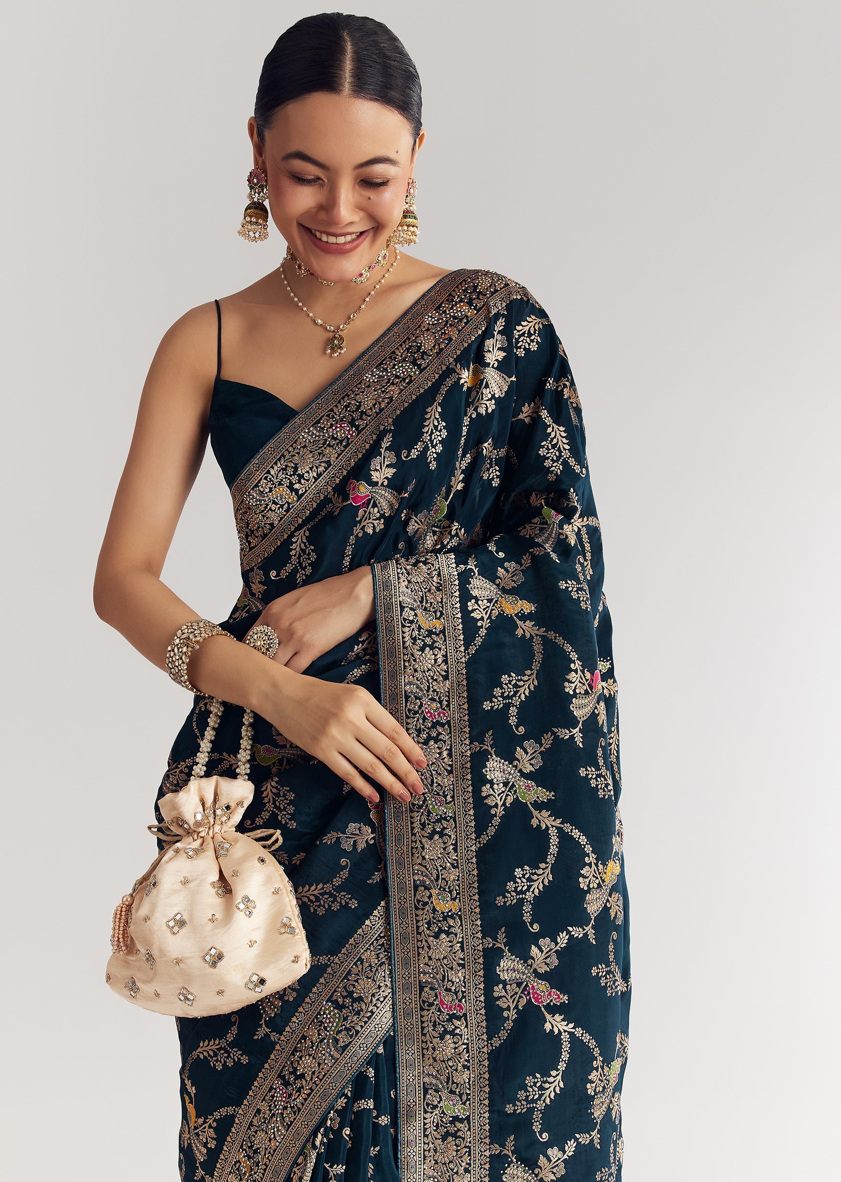 Peacok Blue Saree With Jaal Work And Embellished Stones All Over