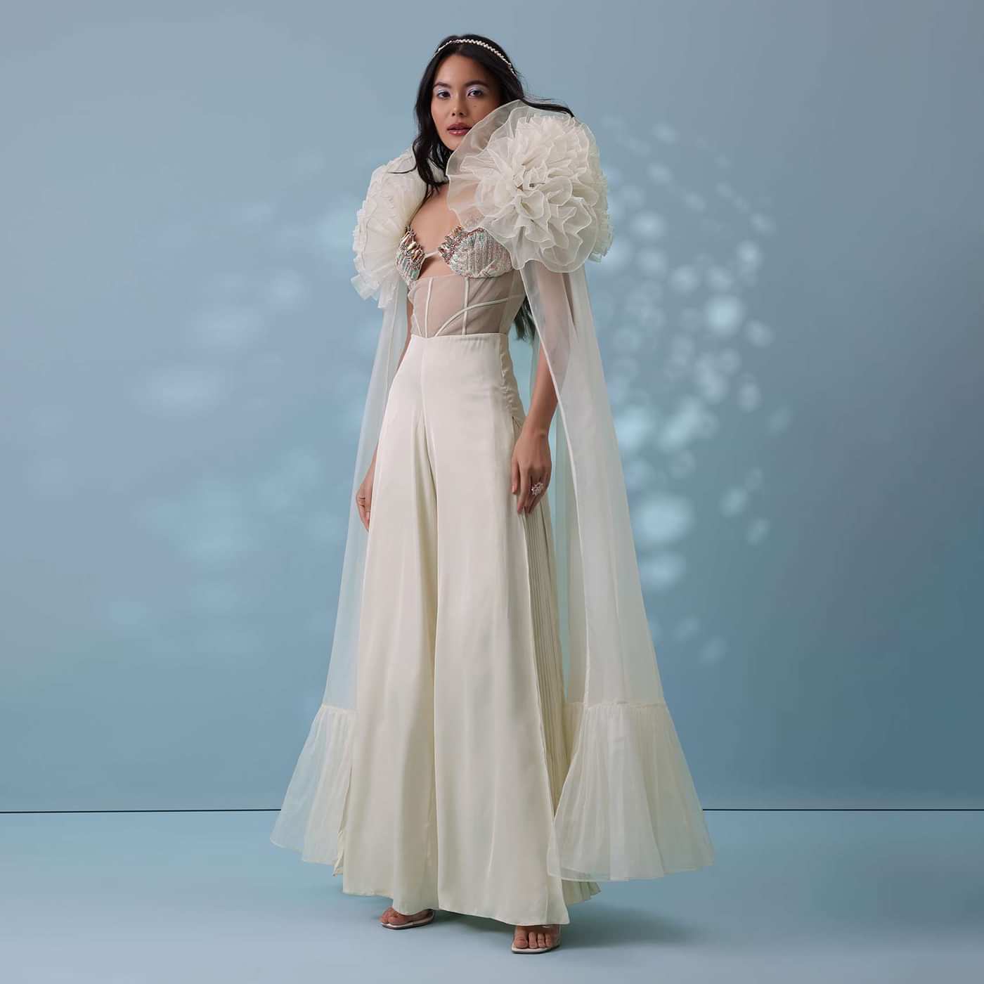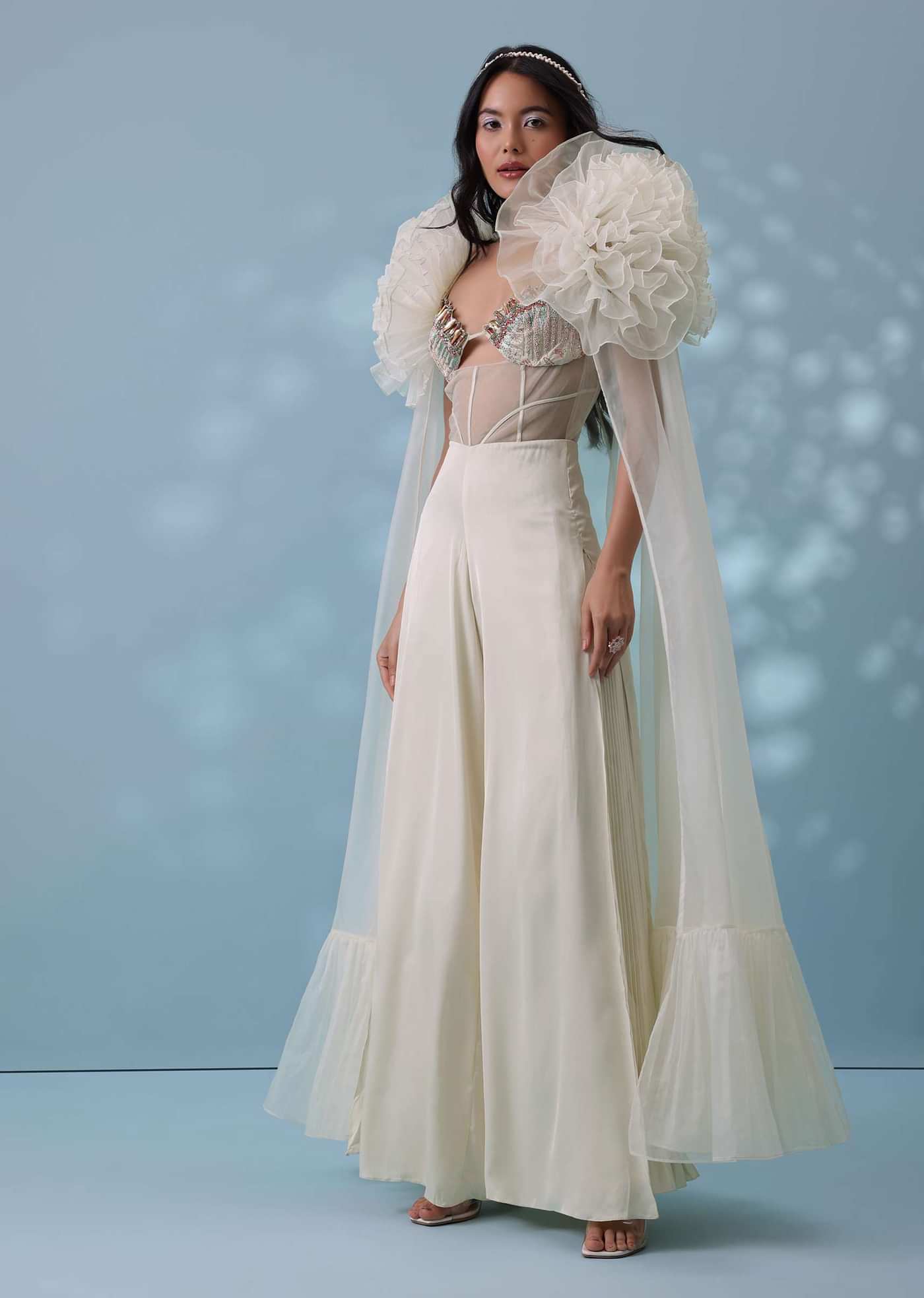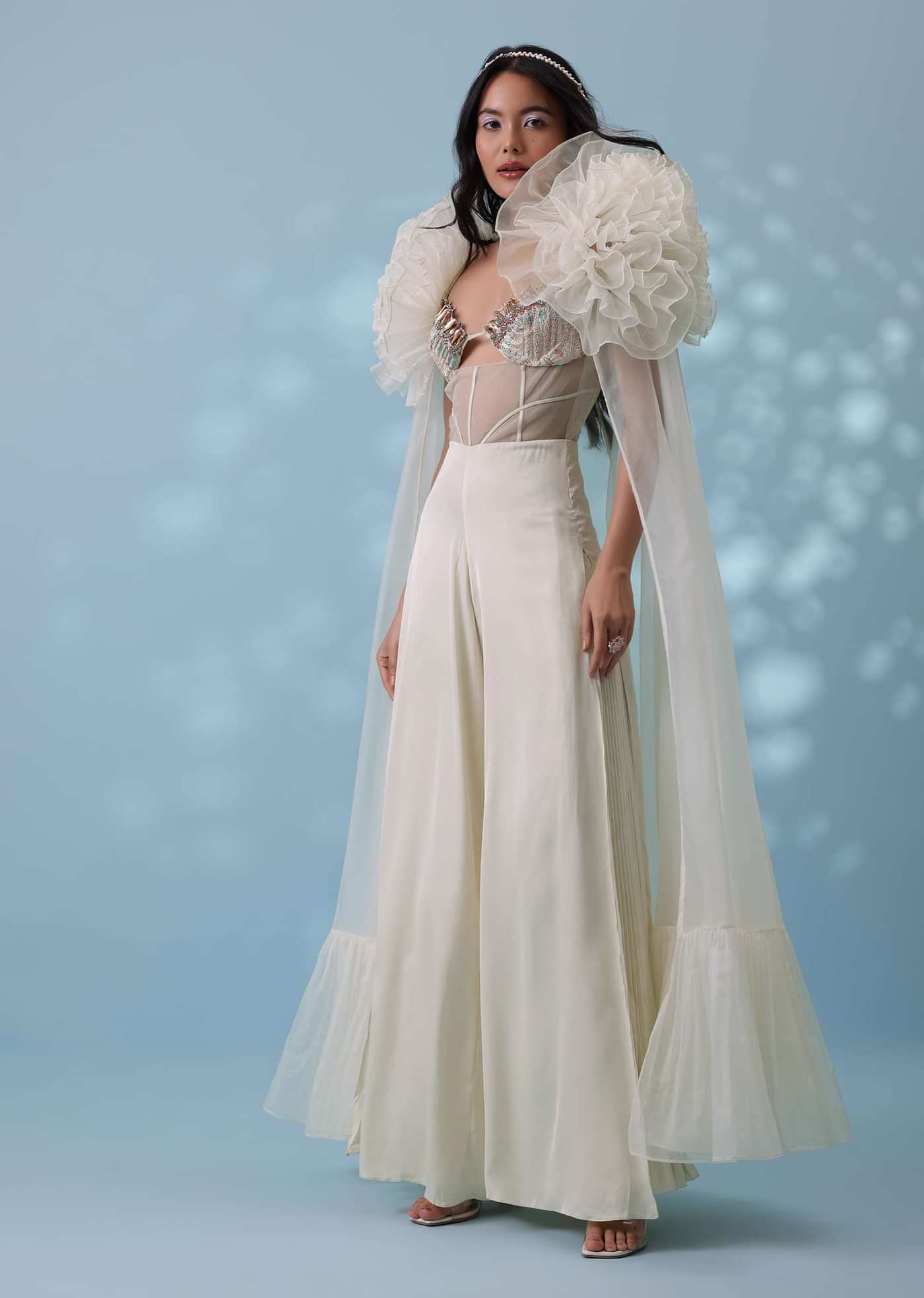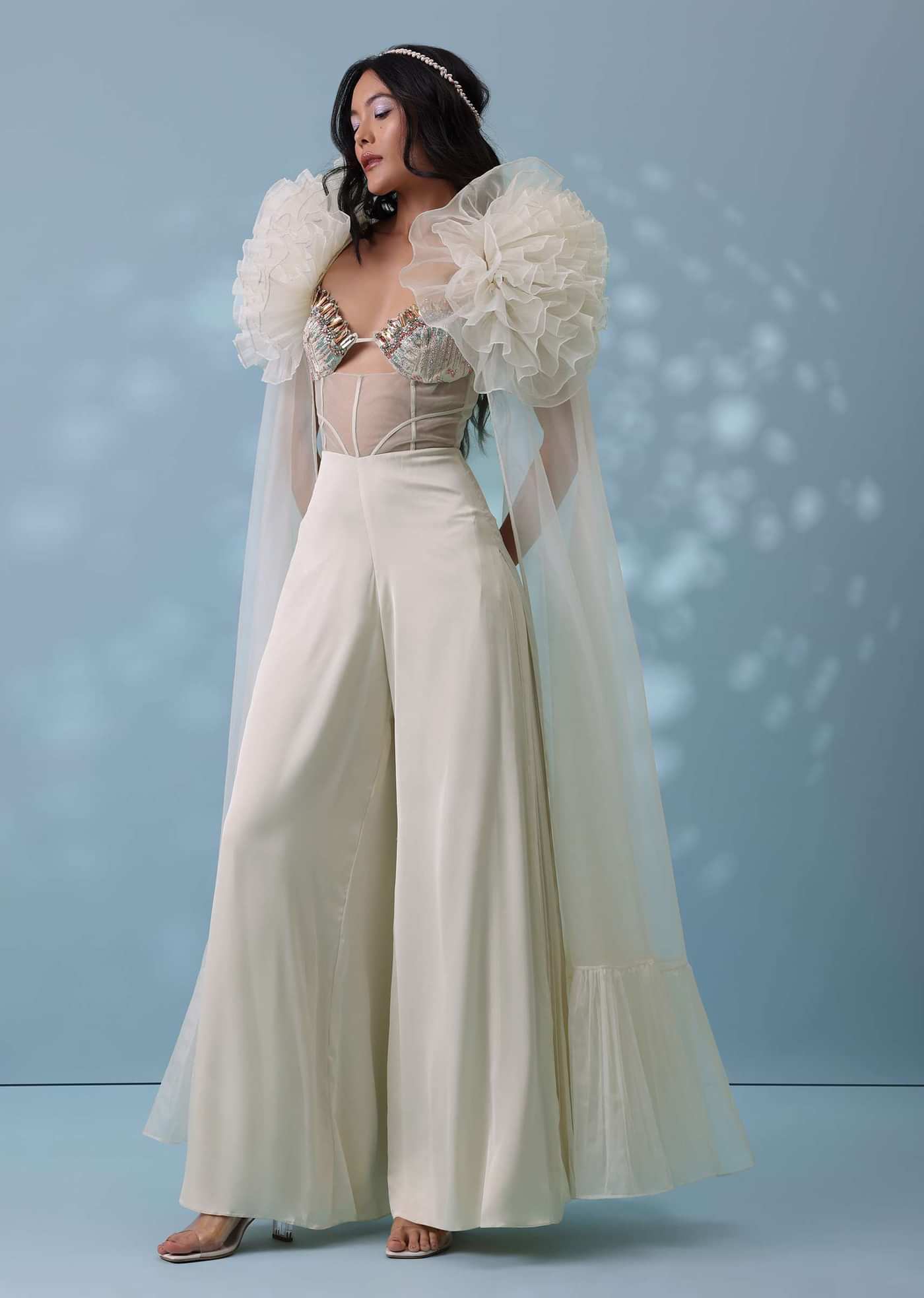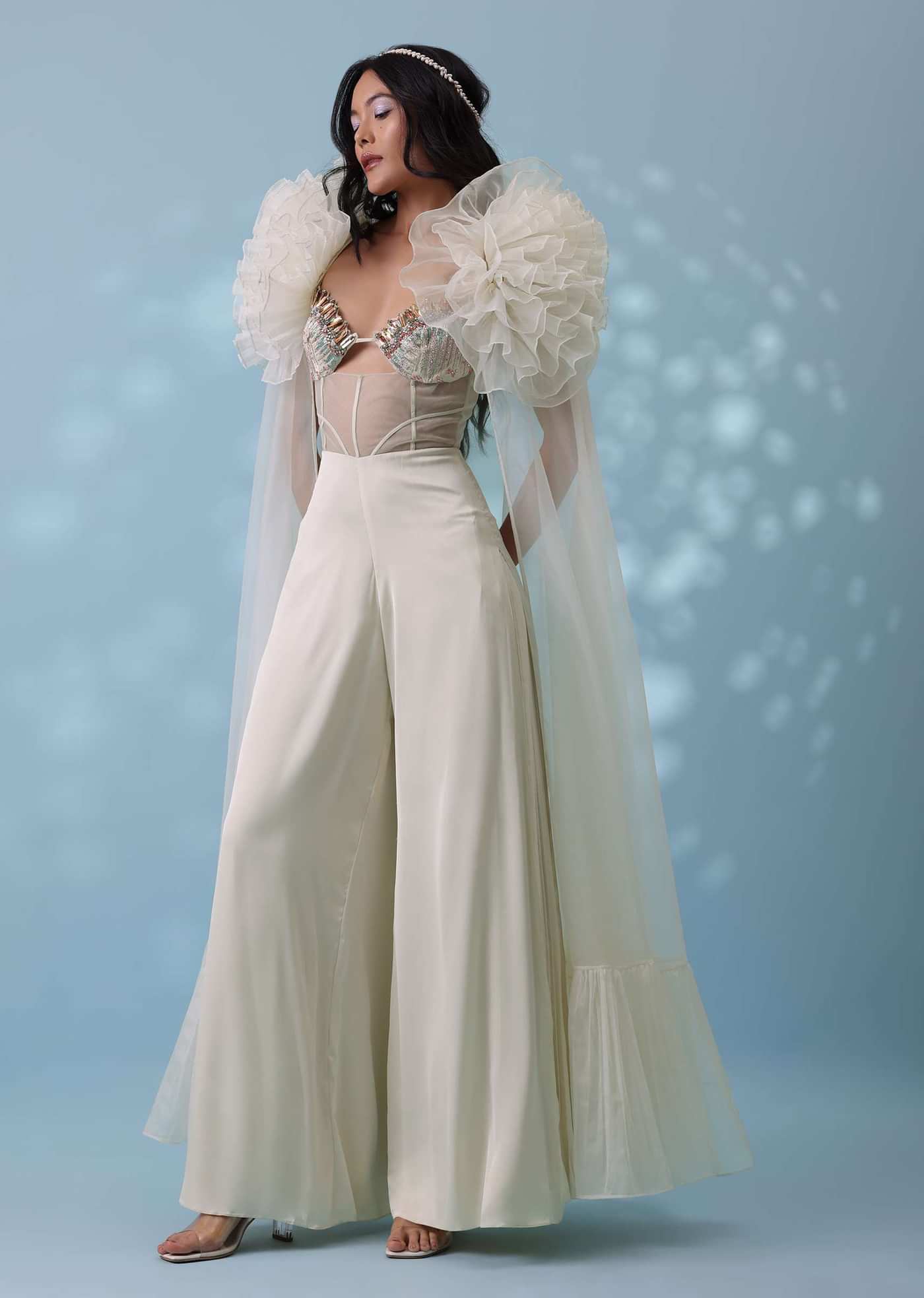 The angelic embroidered jumpsuit carries a heavenly vibe and comes with a wide-leg flare.The bodice has a corset-like sheer net with embroidered bosom-cups in a strappy keyhole-scallop neckline.The outfit is... More Product Details