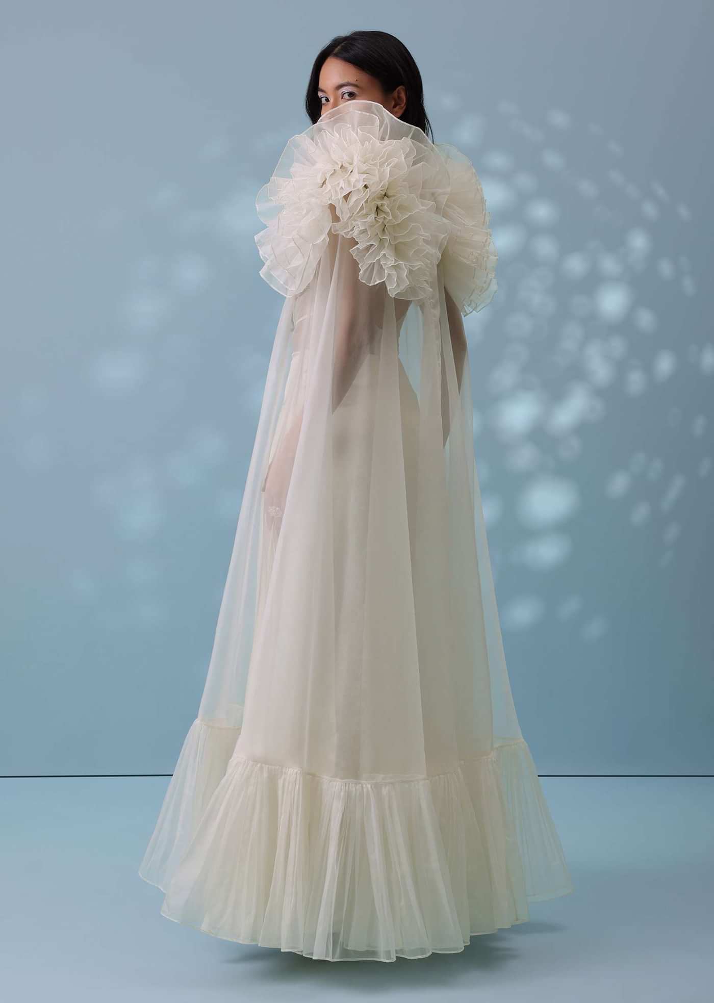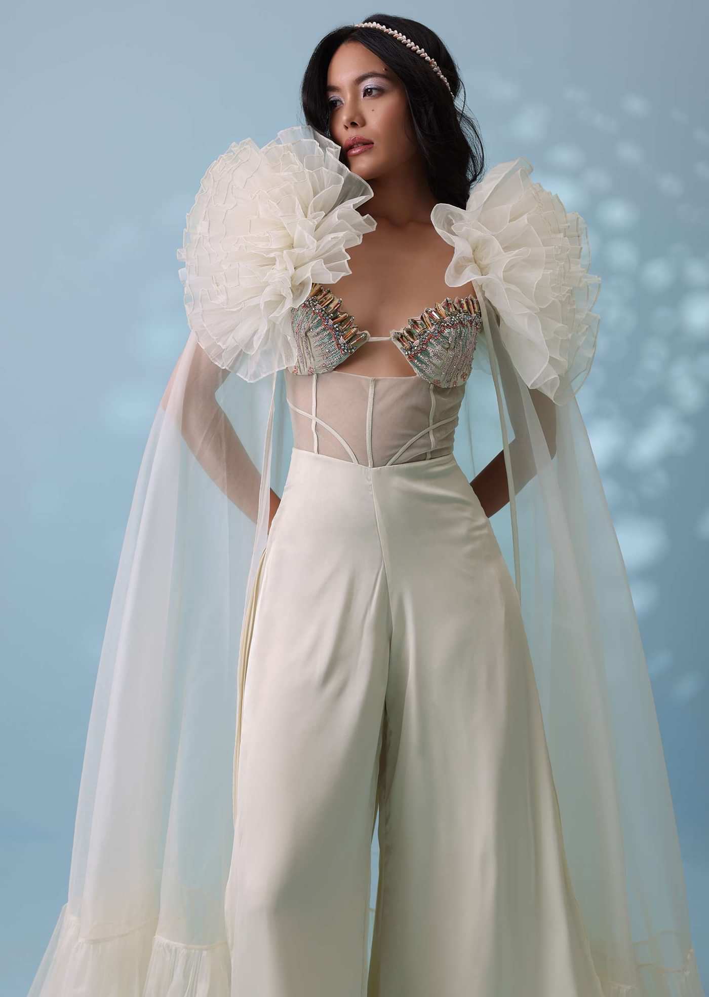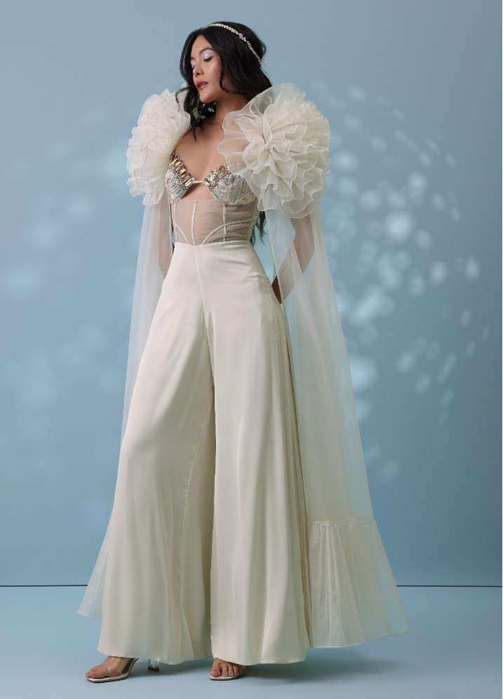 Pearl White Satin Indowestern Embroidered Jumpsuit With Net Shrug