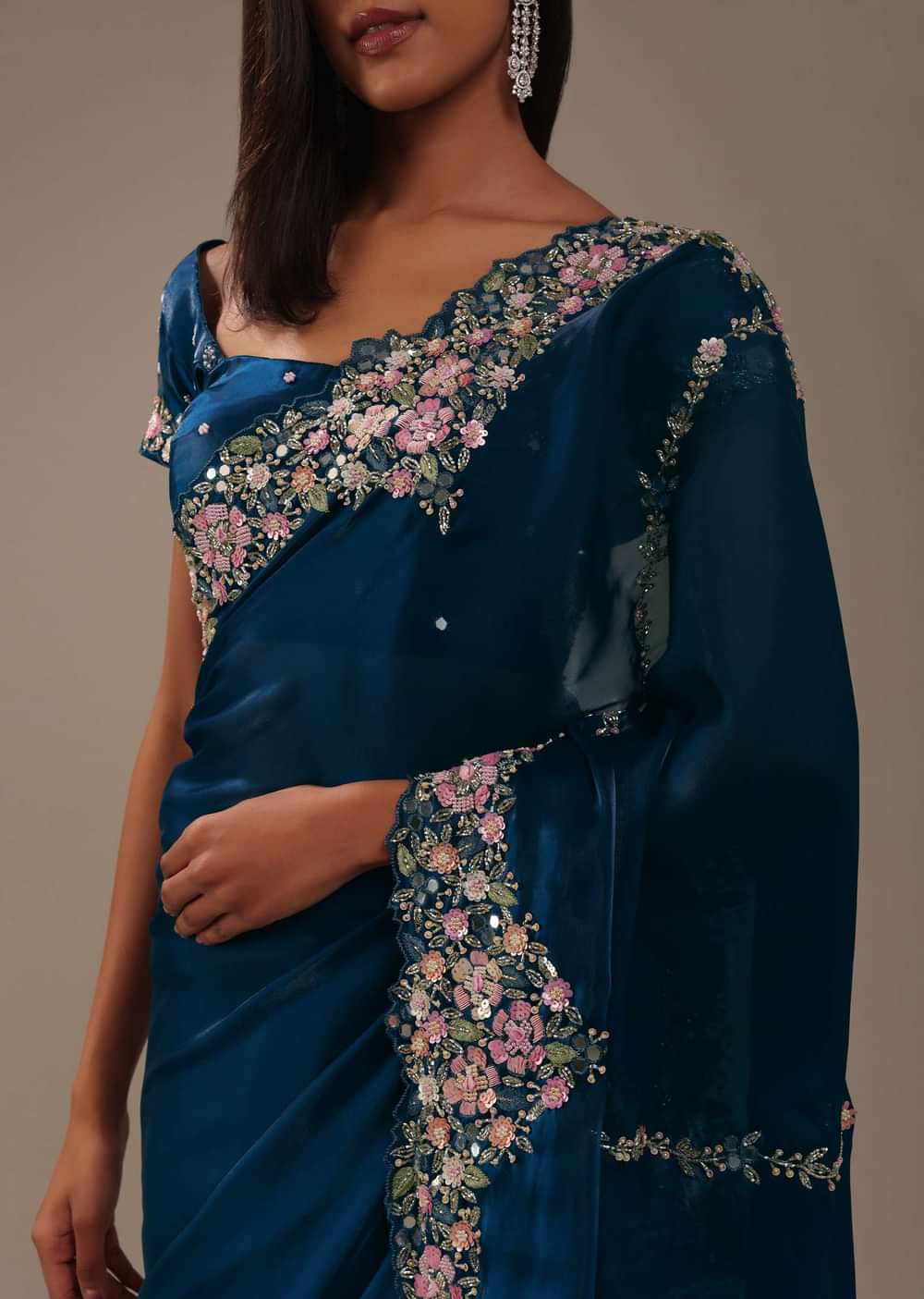 Adorn yourself in regal elegance with our Persian blue tissue silk saree. This exquisite masterpiece boasts a mesmerizing 3D floral effect, achieved through intricate embellishments, including sequins, mirror, moti, and thread work. EVENT - Trousseau, engagement, wedding, and reception. The saree comes with a matching unstitched blouse. Awarded As The Most Trusted Brand We'Re Delivering Styles You Love Just As Promised.