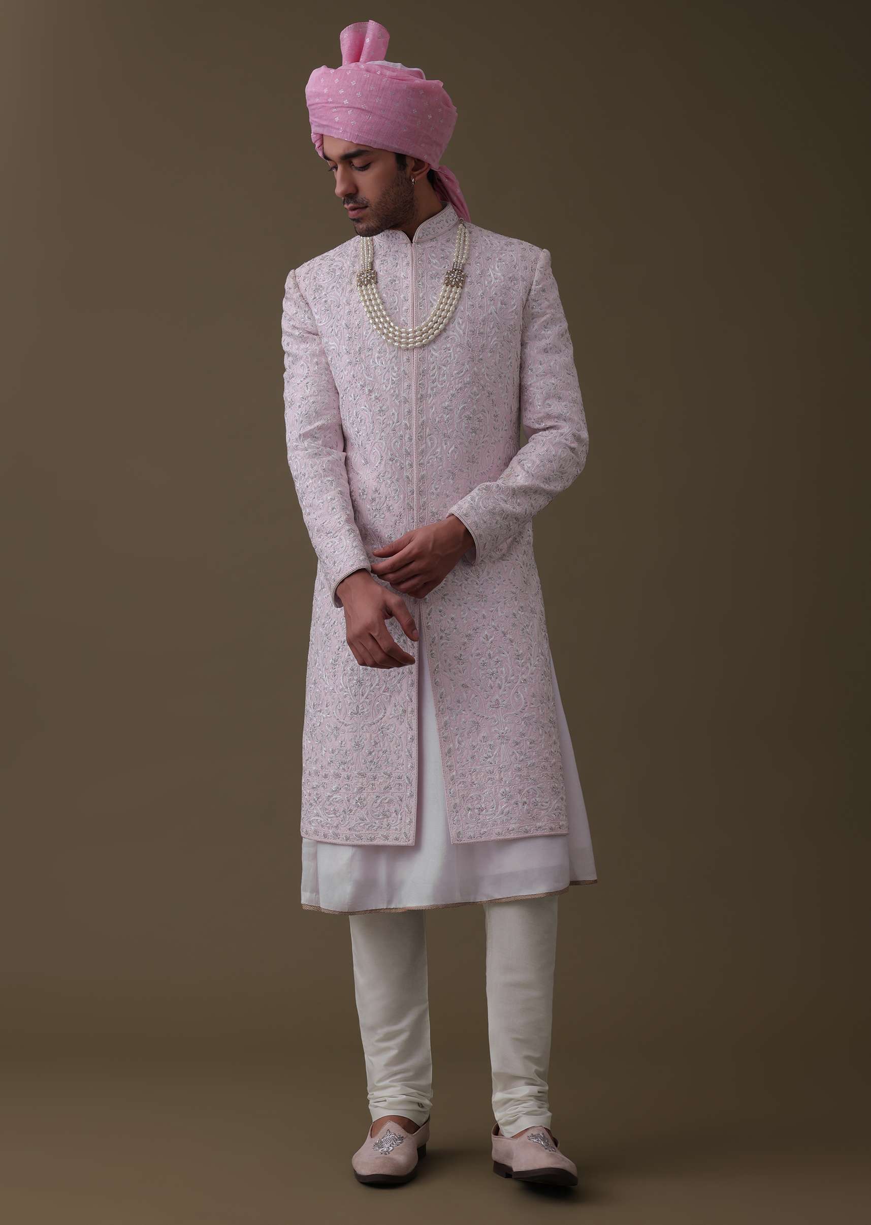 Petal Pink Sherwani Set In Tussar With Moti Work