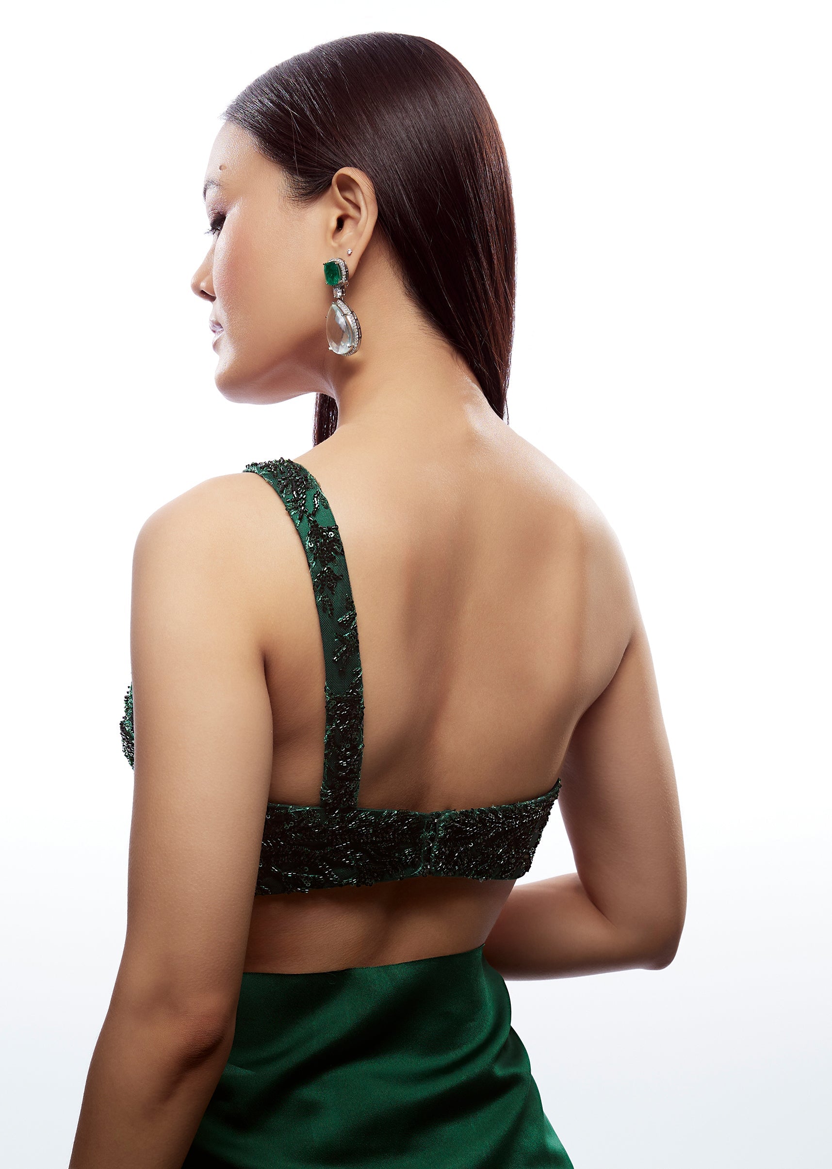 The Reena blouse in a rich pine green shade is designed to stand out with its bold one-shoulder silhouette and glamorous cut-dana embellishment. Crafted in fancy fabric, it has a... More Product Details