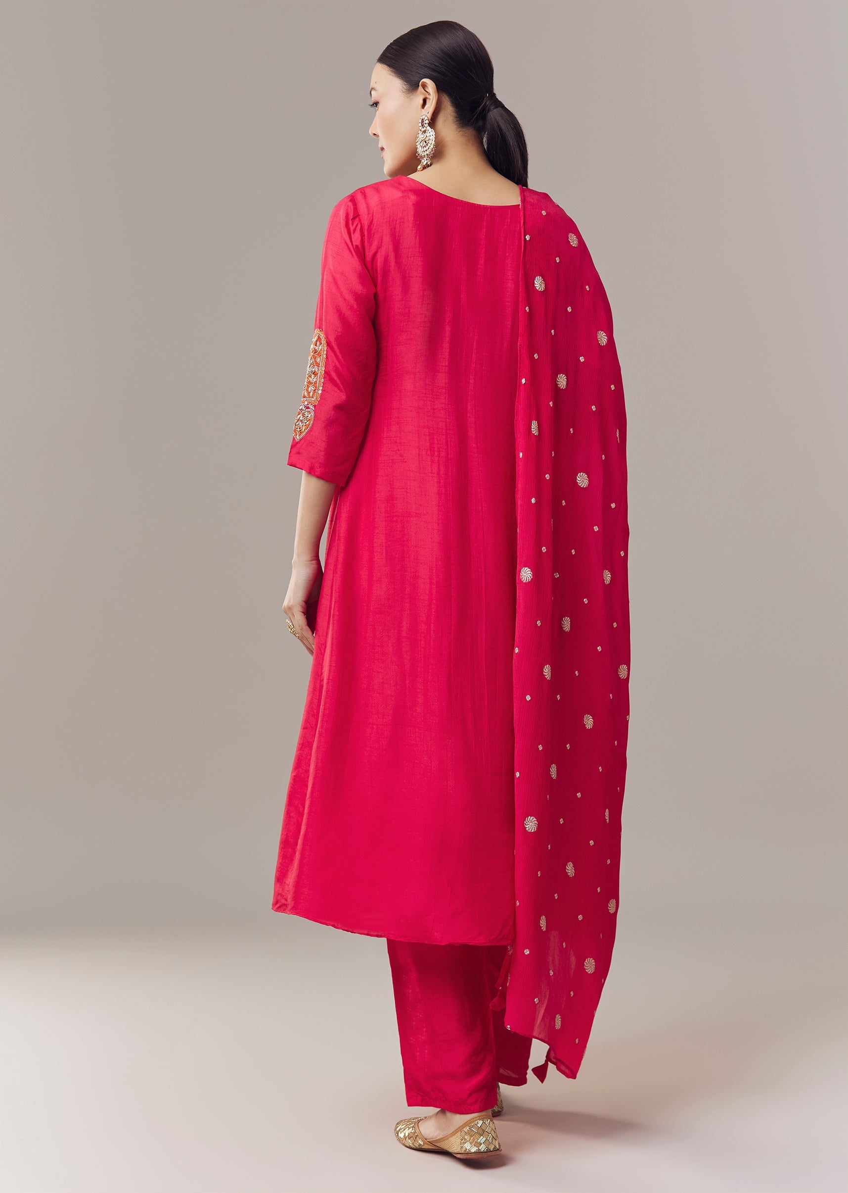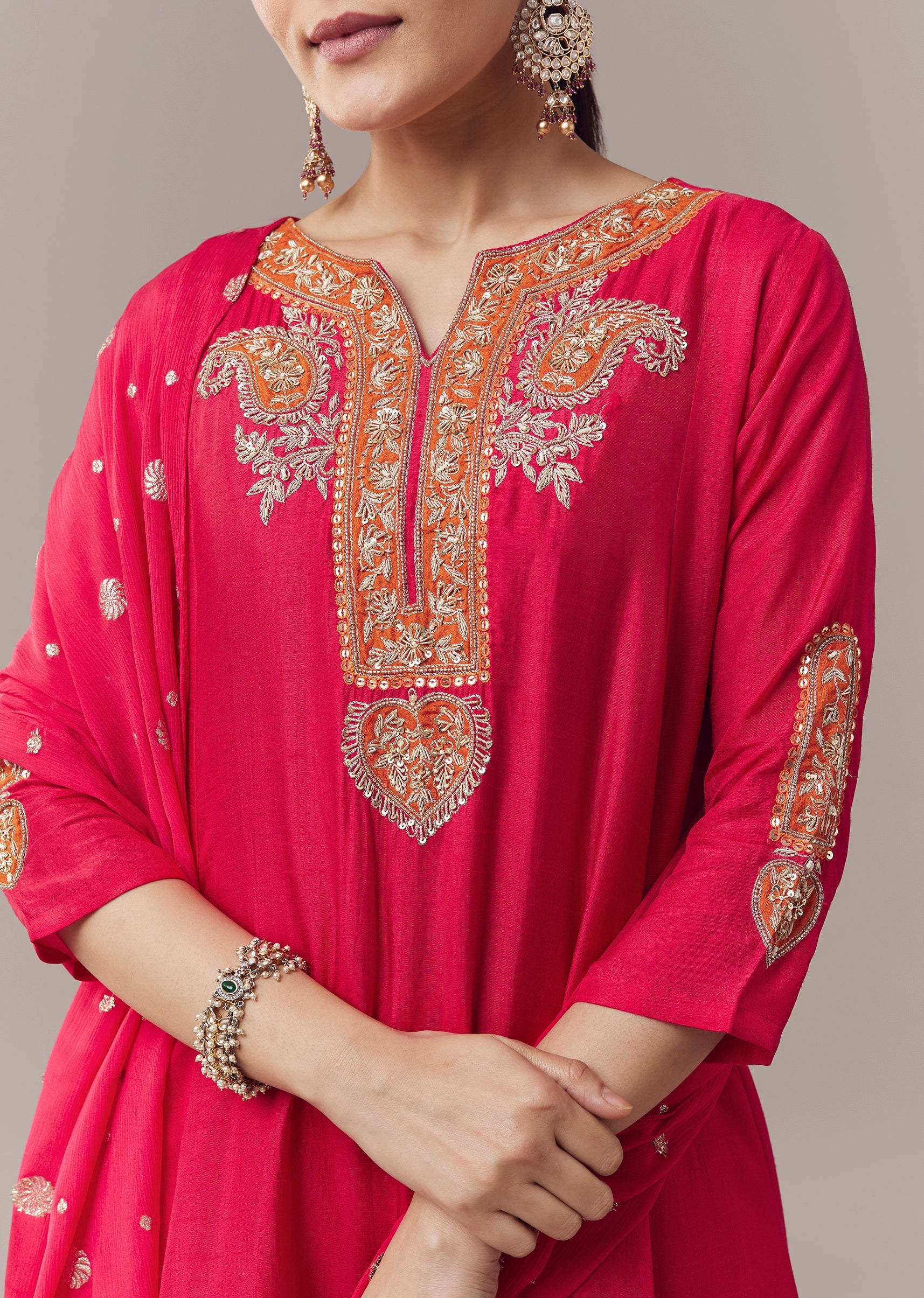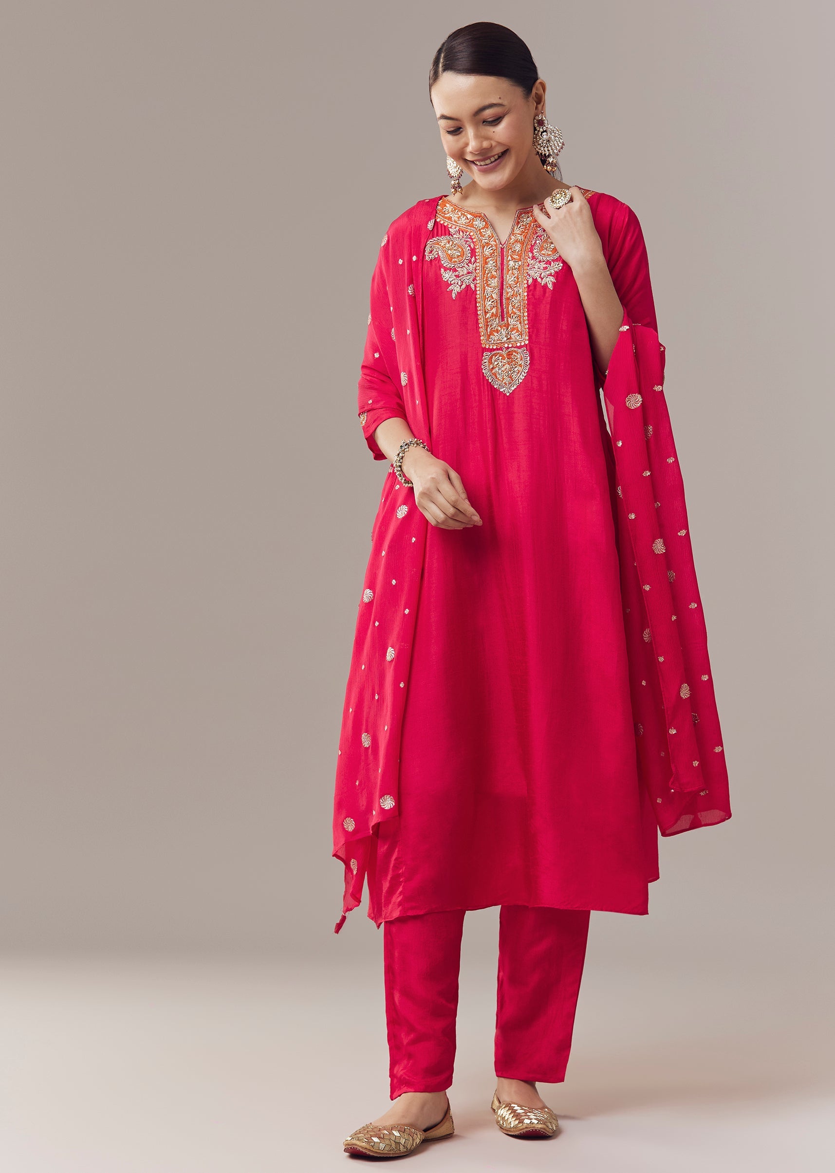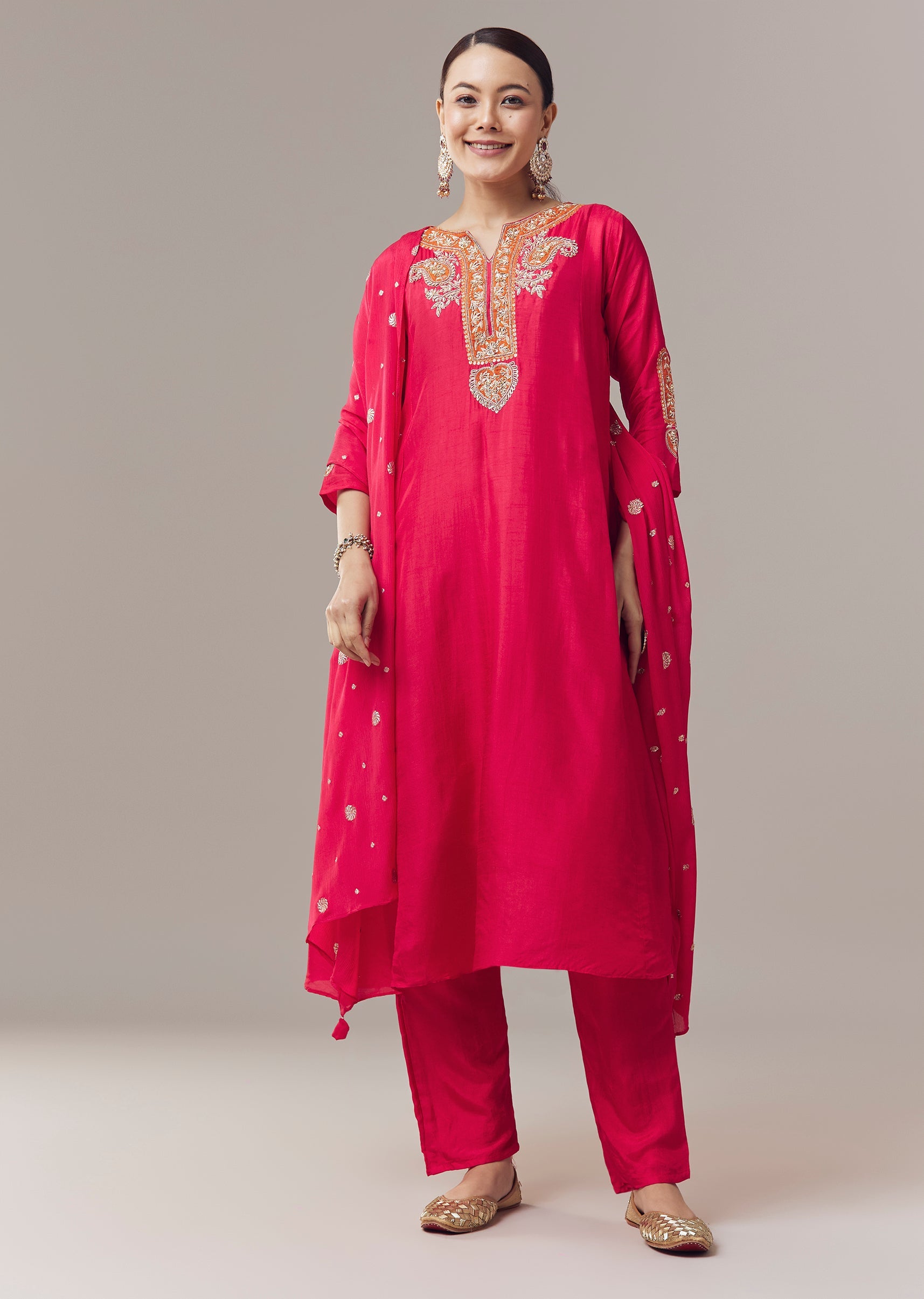 A graceful blend of festive vibrance and classic elegance, this pink anarkali suit is designed with a straight flowing silhouette highlighted by striking color pop accents. Detailed with zardosi and... More Product Details