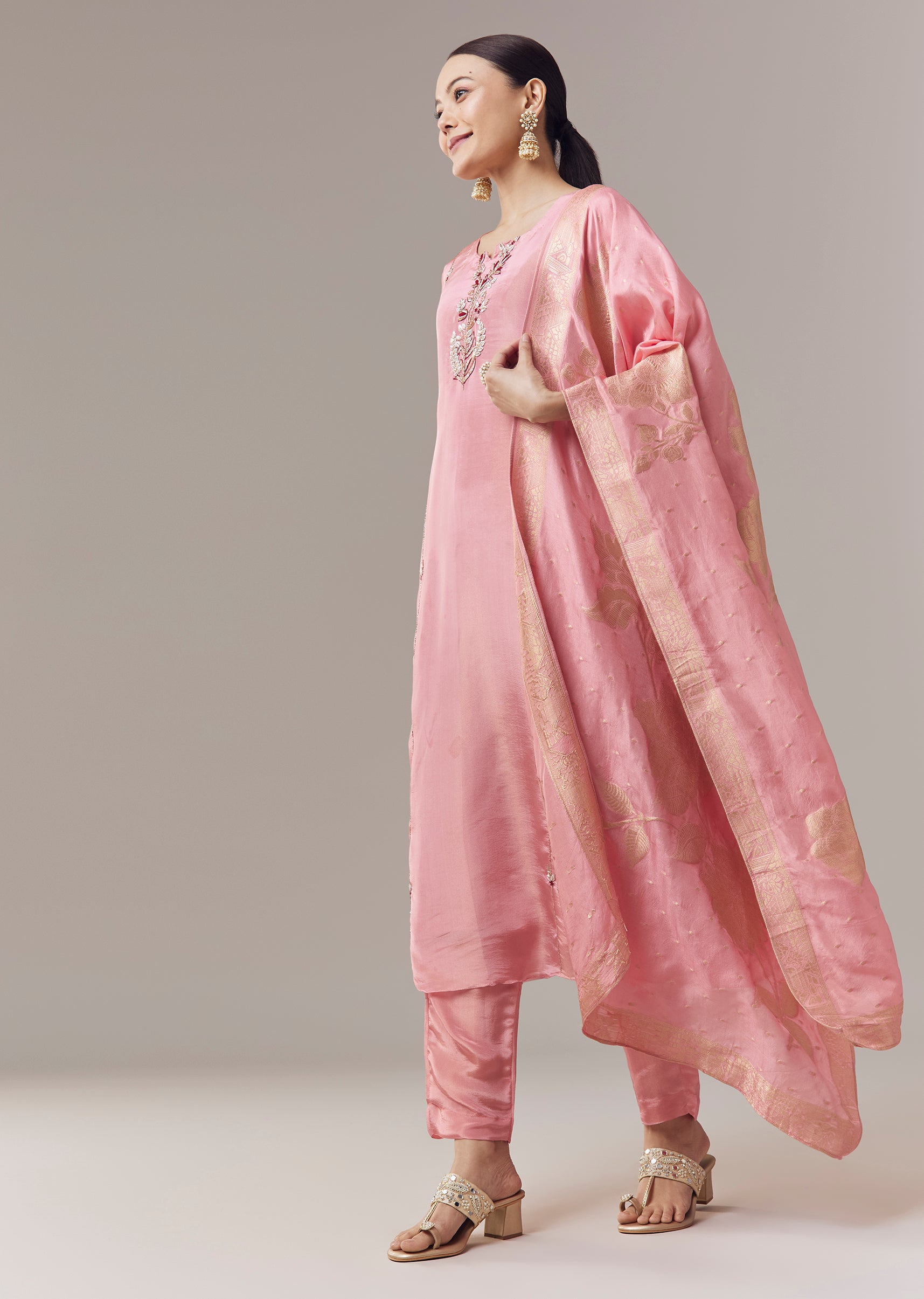 Pair it with metallic juttis and minimal jewellery to highlight the zardosi detailing and maintain a festive look.