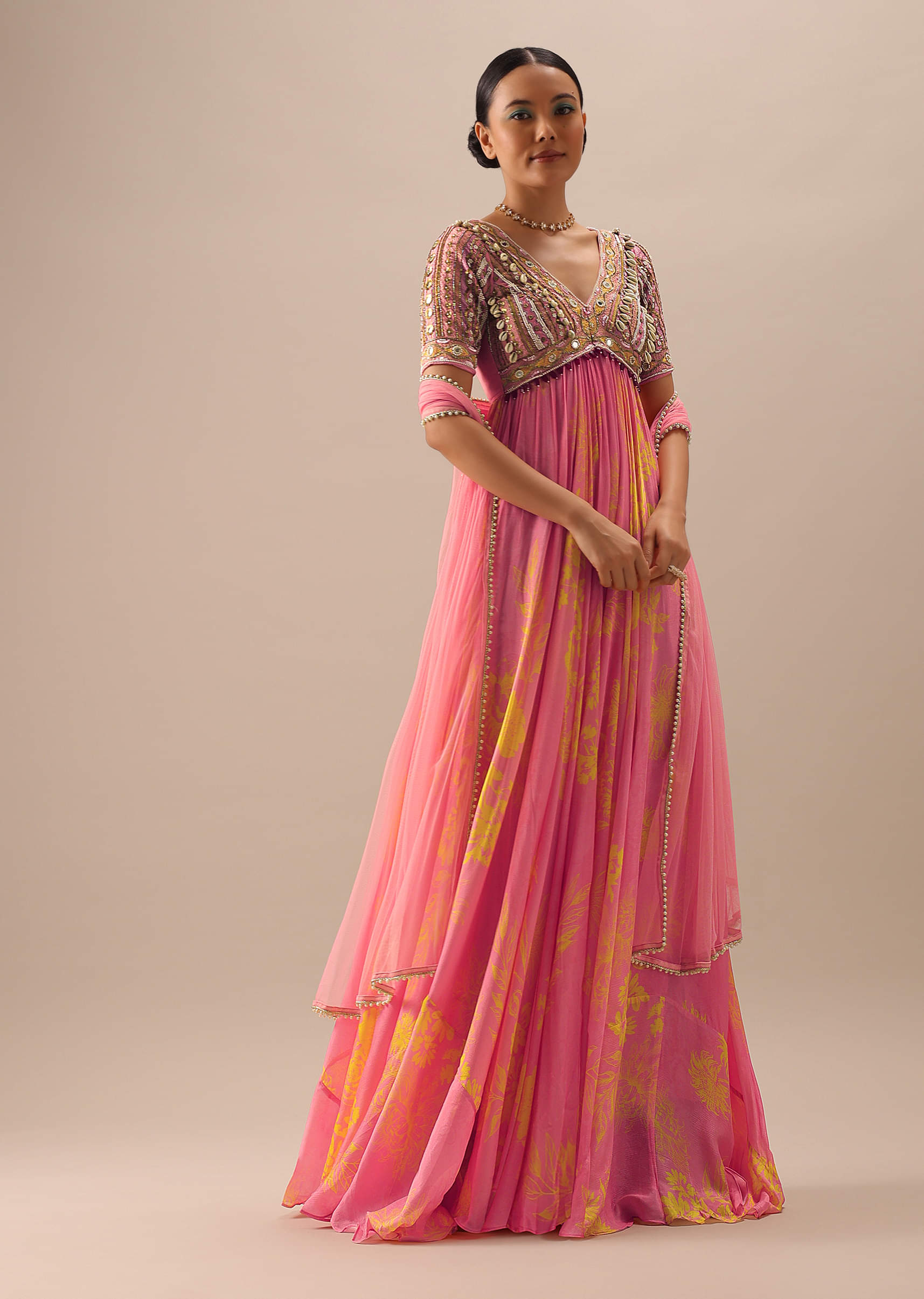 Pink Anarkali With Net Dupatta And Shell Work
