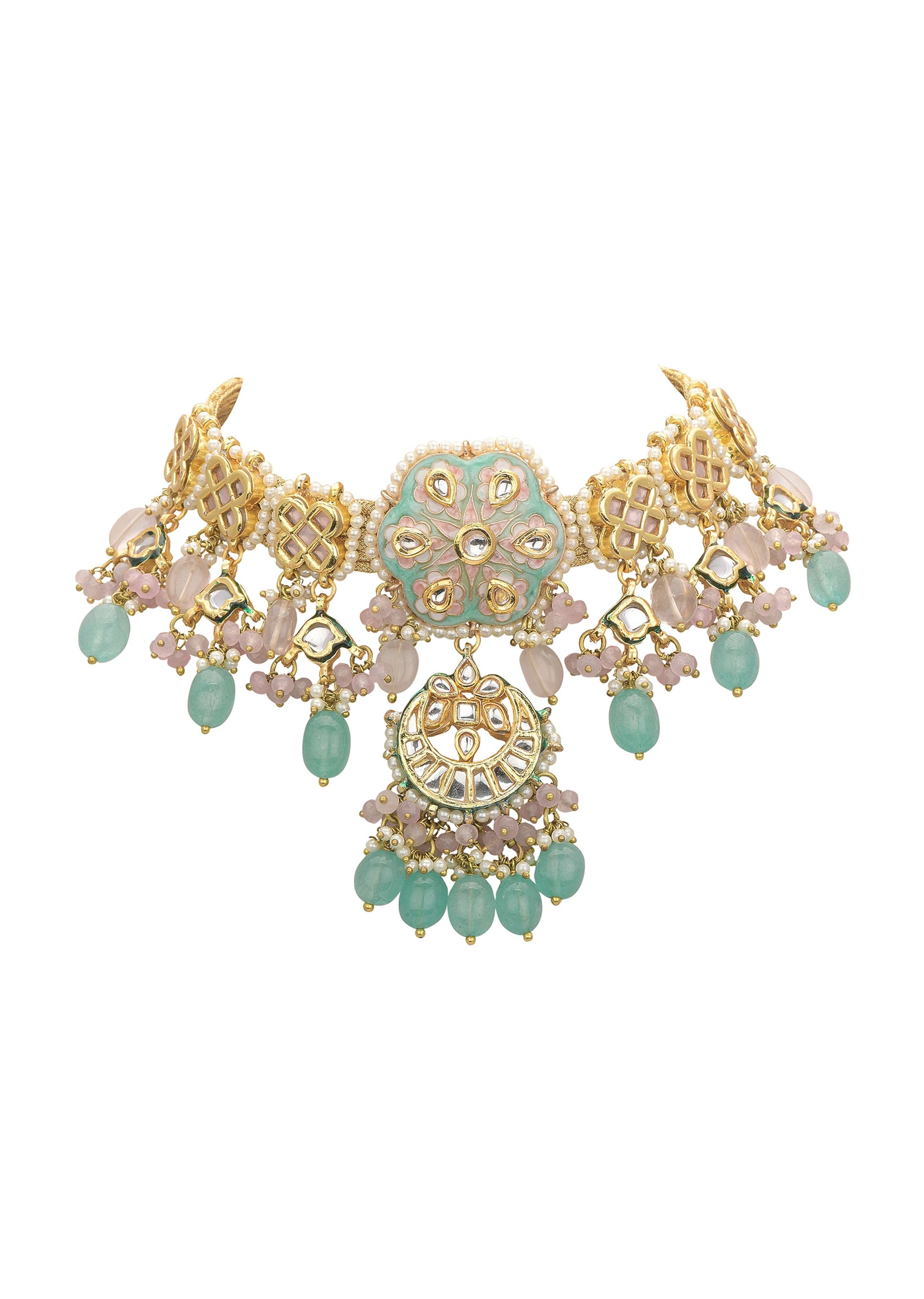 Pink And Aqua Meenakari Pendant Necklace Set With Encrusted Kundan
