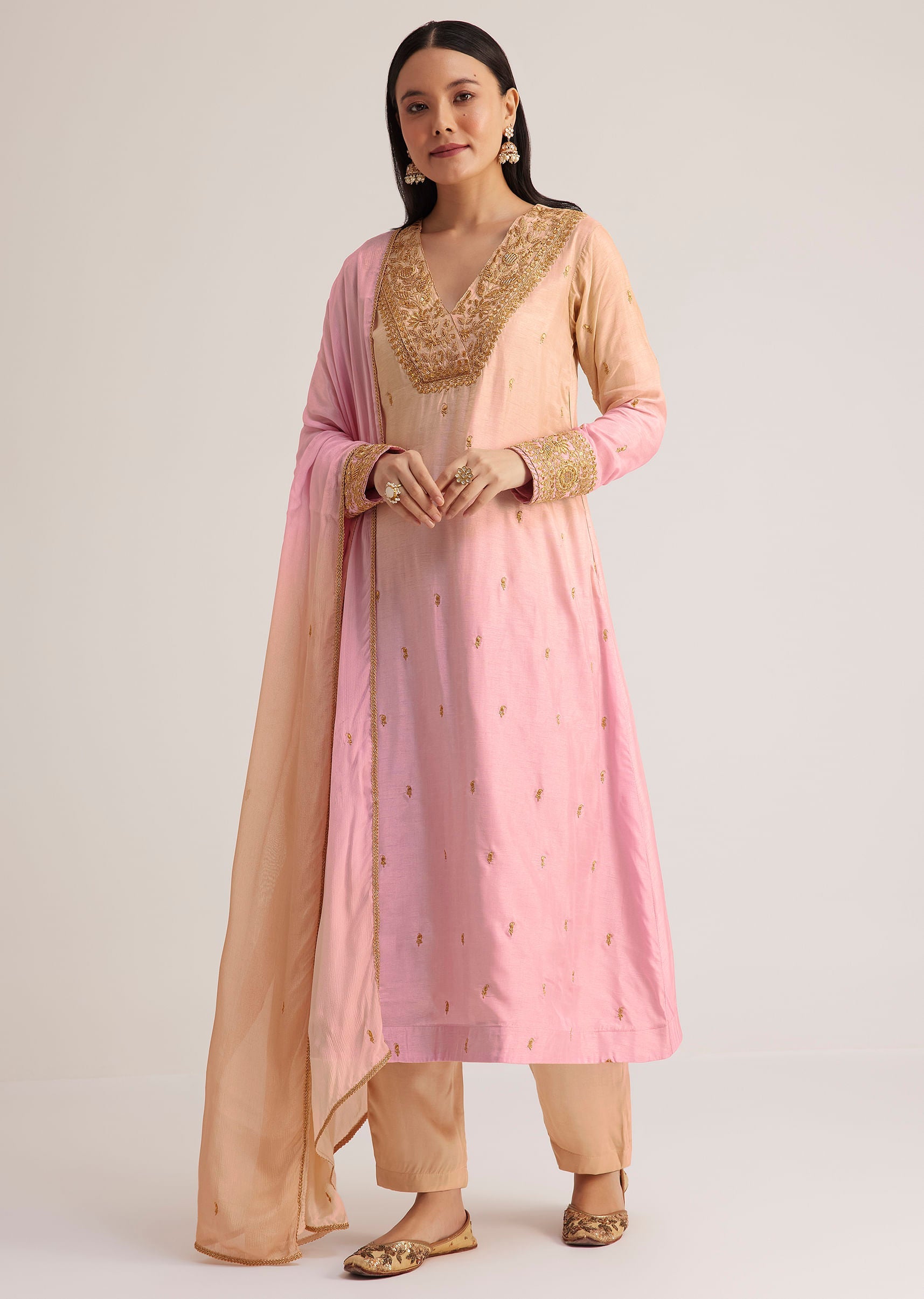 Add A Graceful Touch To Your Festive Wardrobe With This Pink And Beige Ombre Suit Adorned With Intricate Gold Embroidery On The Neckline And Sleeves. Perfect For Daytime Wedding Functions... More Product Details