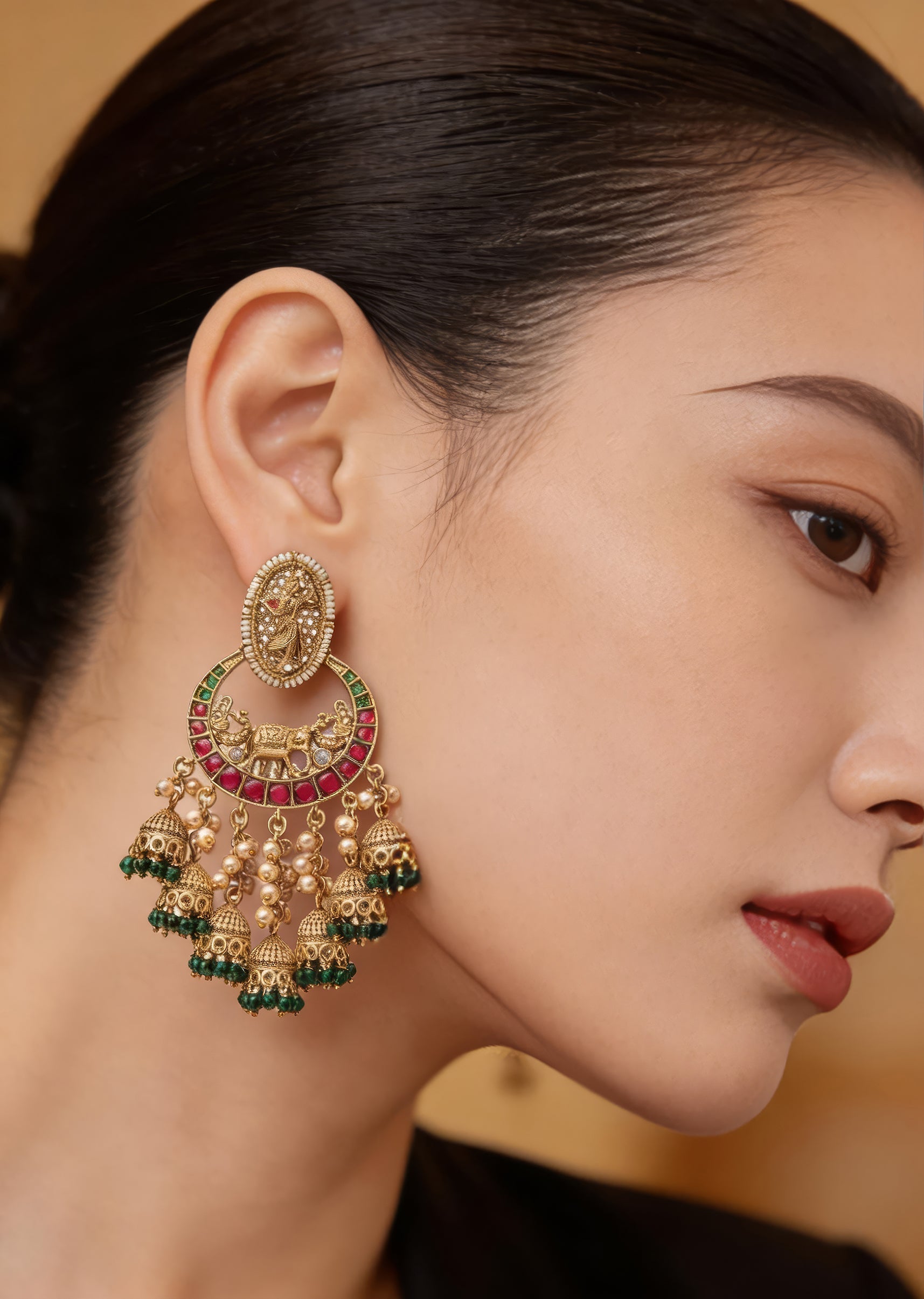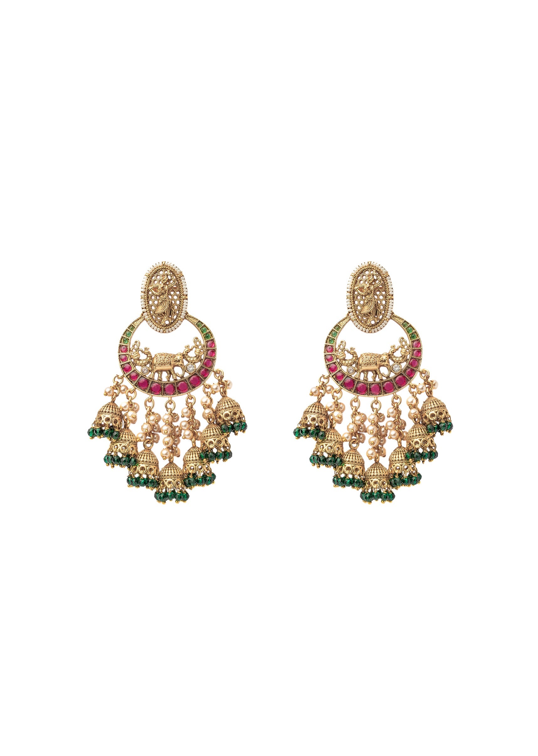 These are elegant gold-plated earrings with intricate pink & green detailing, featuring a floral motif & delicate beads. Perfect for traditional or festive wear, exuding charm & sophistication. Product dimensions may vary slightly. Awarded as the Most Trusted Brand, we're delivering styles you love, just as promised.