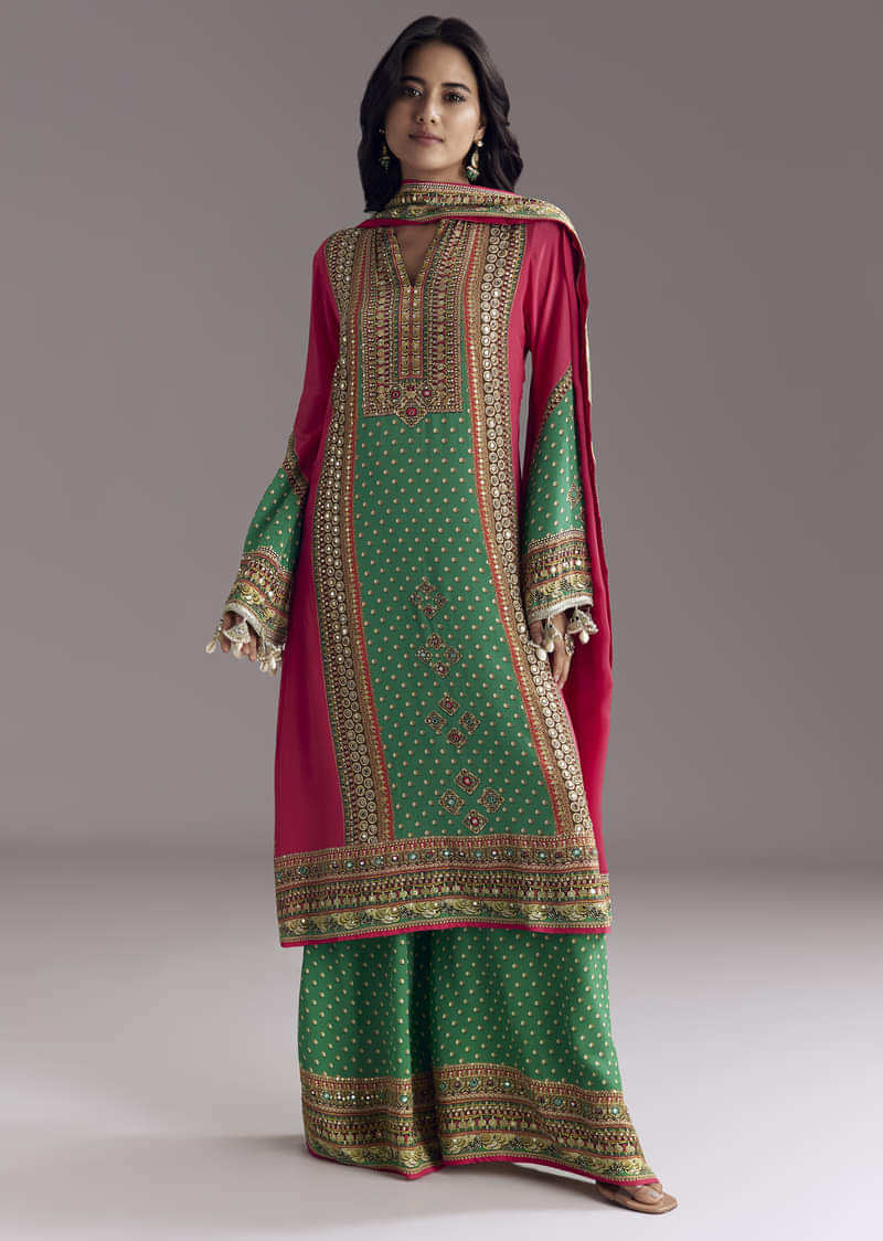 Pink And Green Printed Kurta Palazzo Set
