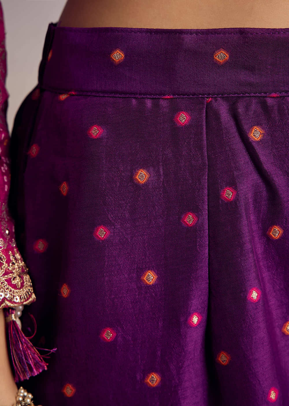 Make a bold festive statement in this ombre pink and purple Bandhani anarkali. Detailed with zardosi on the neckline, resham on the pants, and sequinned dupatta, made in soft Russian... More Product Details
