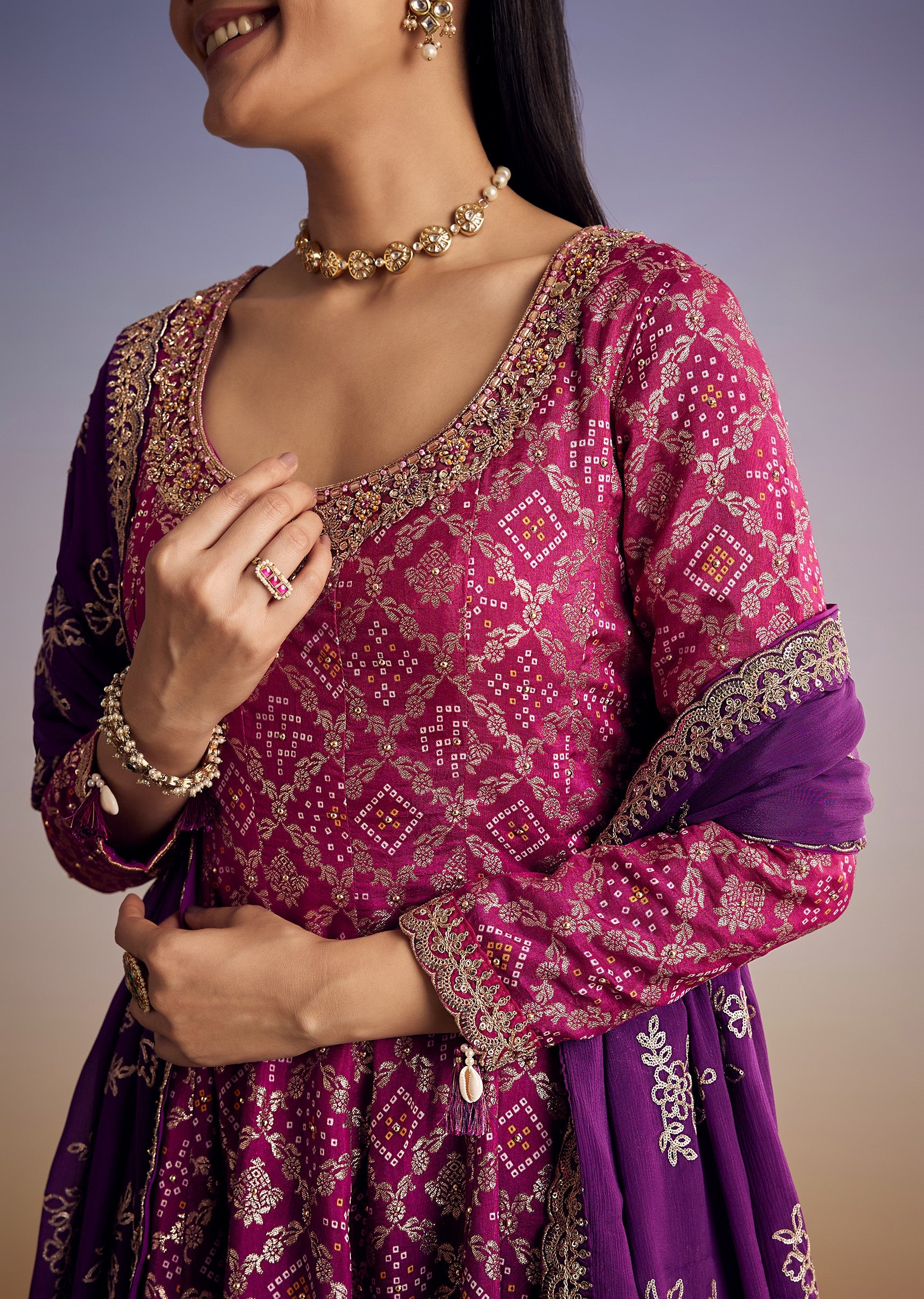 Pink And Purple Ombre Bandhani Anarkali Suit With Zardosi Neckline