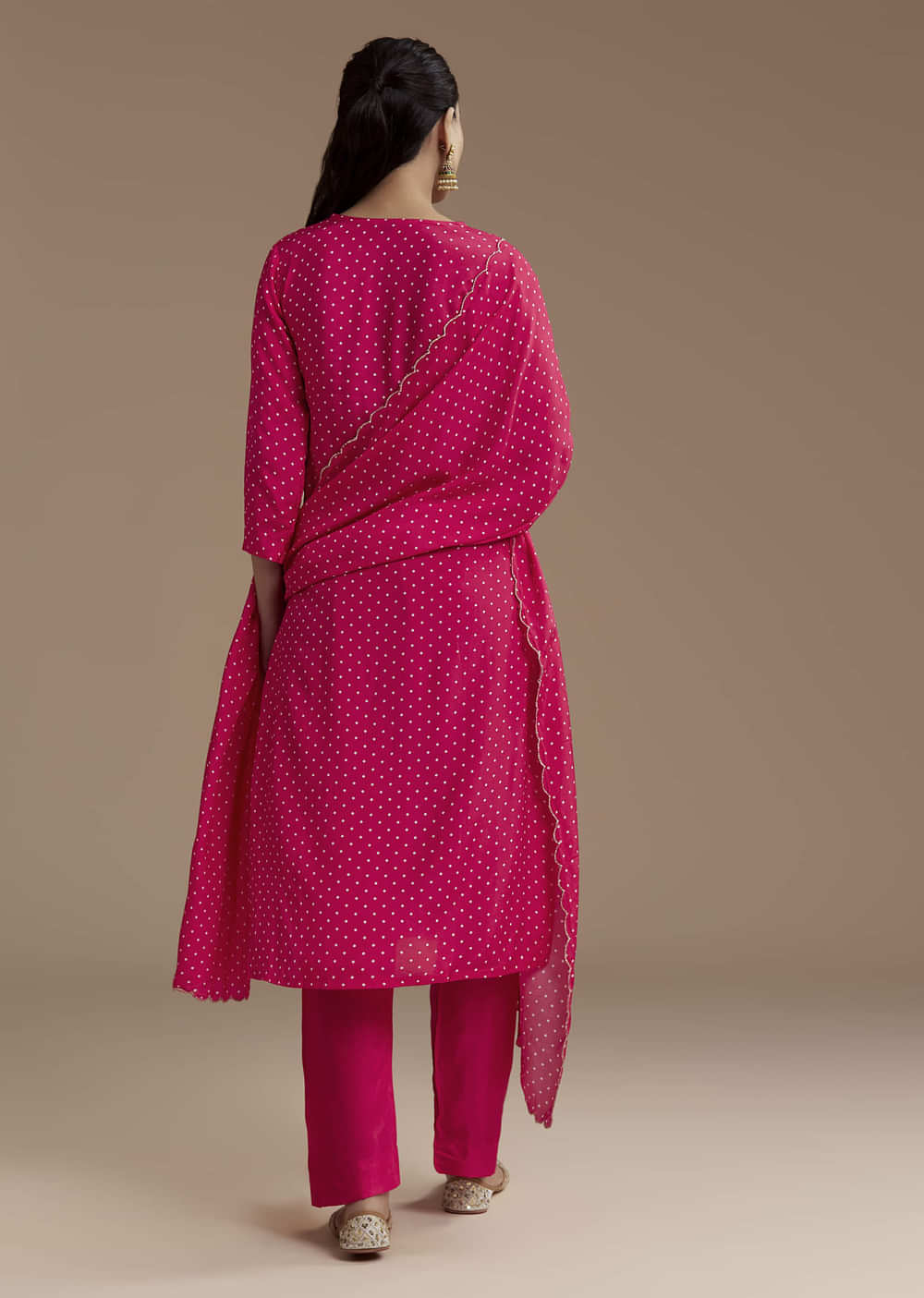 Step into the season of celebration with this exquisite pink silk kurta set, where timeless bandhani patterns meet a radiant, festive sheen. Accented with intricate zari detailing, the ensemble captures... More Product Details