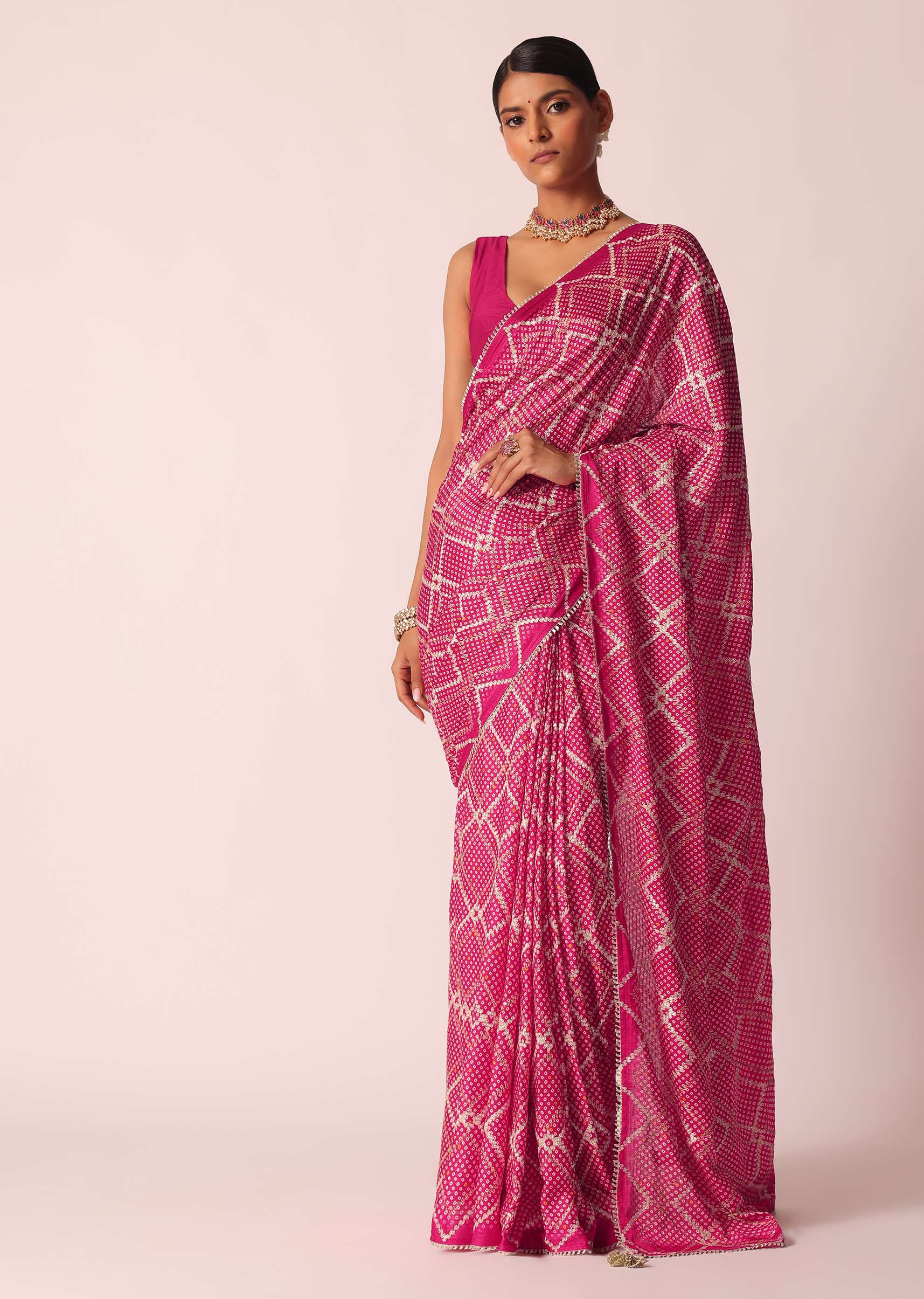 Pink Bandhani Saree With Gota Detail And Unstitched Blouse Piece