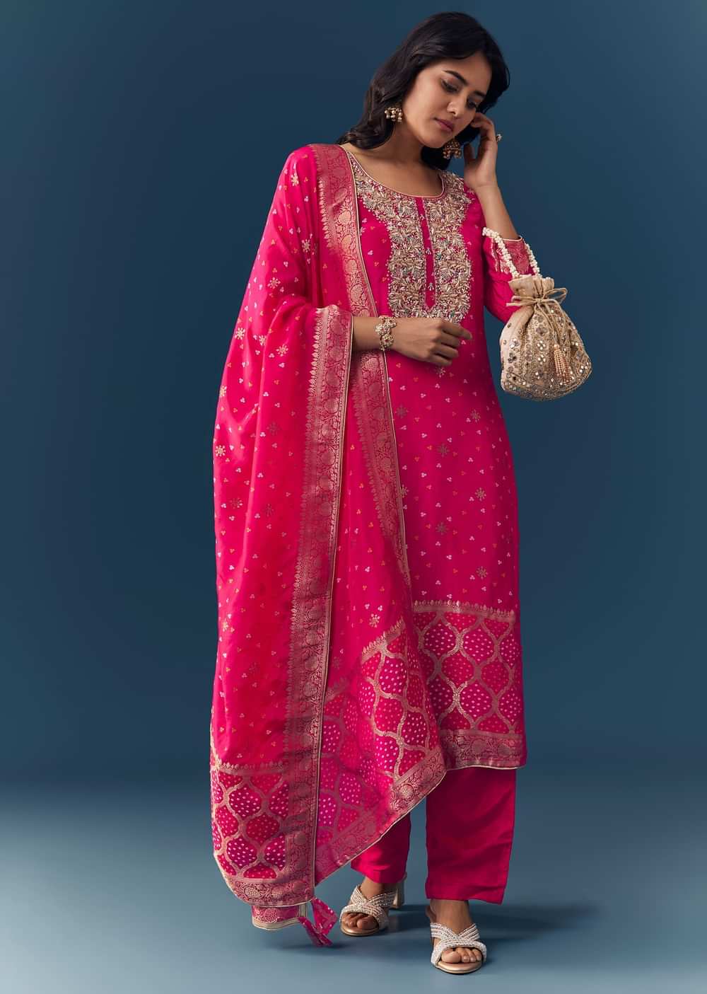 Celebrate in colour with this vibrant Bandhani kurta, elevated by rich zardosi work that adds a luminous festive sparkle. The round neckline and 3/4th sleeves keep the look classic and... More Product Details