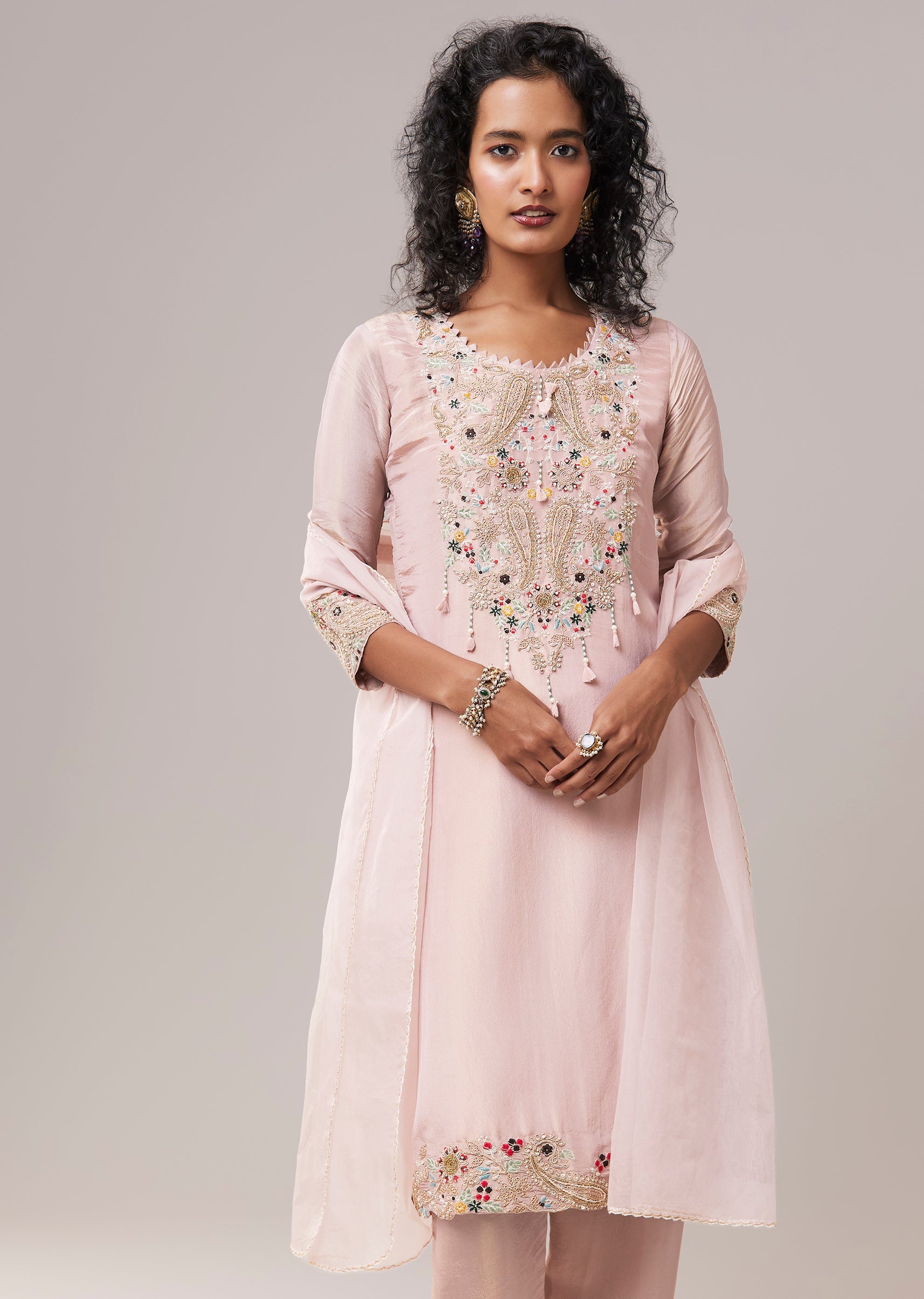 Pink Bead Work Tissue Kurta Set