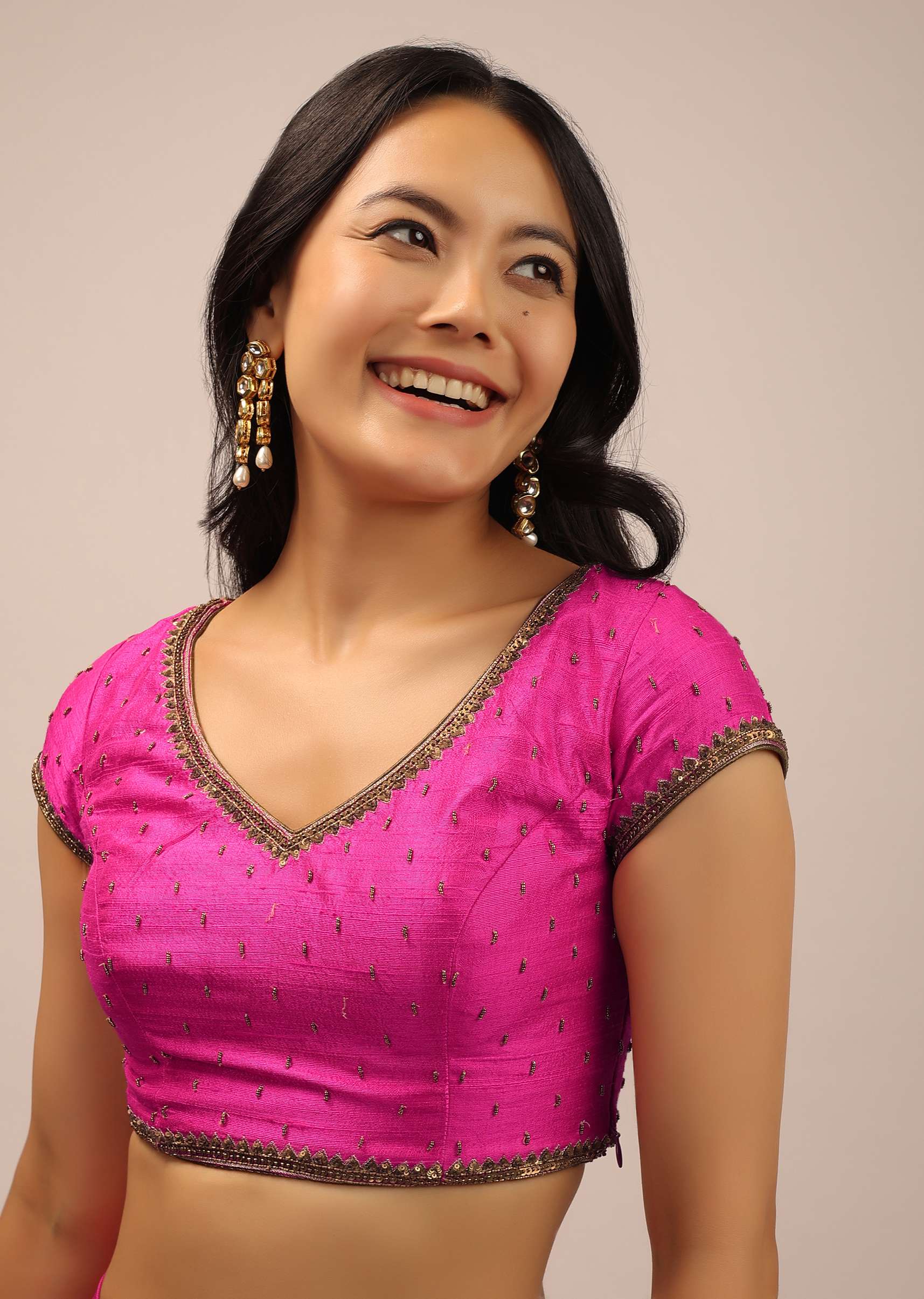 Pink blouse in raw silk with cut dana embellished buttis and border design. It is crafted with a leaf shaped neckline, cap sleeves and padding. The back has a cut out and it comes with a side zip closure. Awarded As The Most Trusted Brand We'Re Delivering Styles You Love Just As Promised.