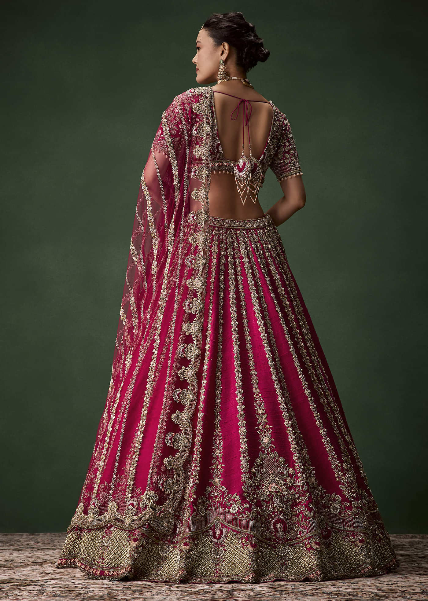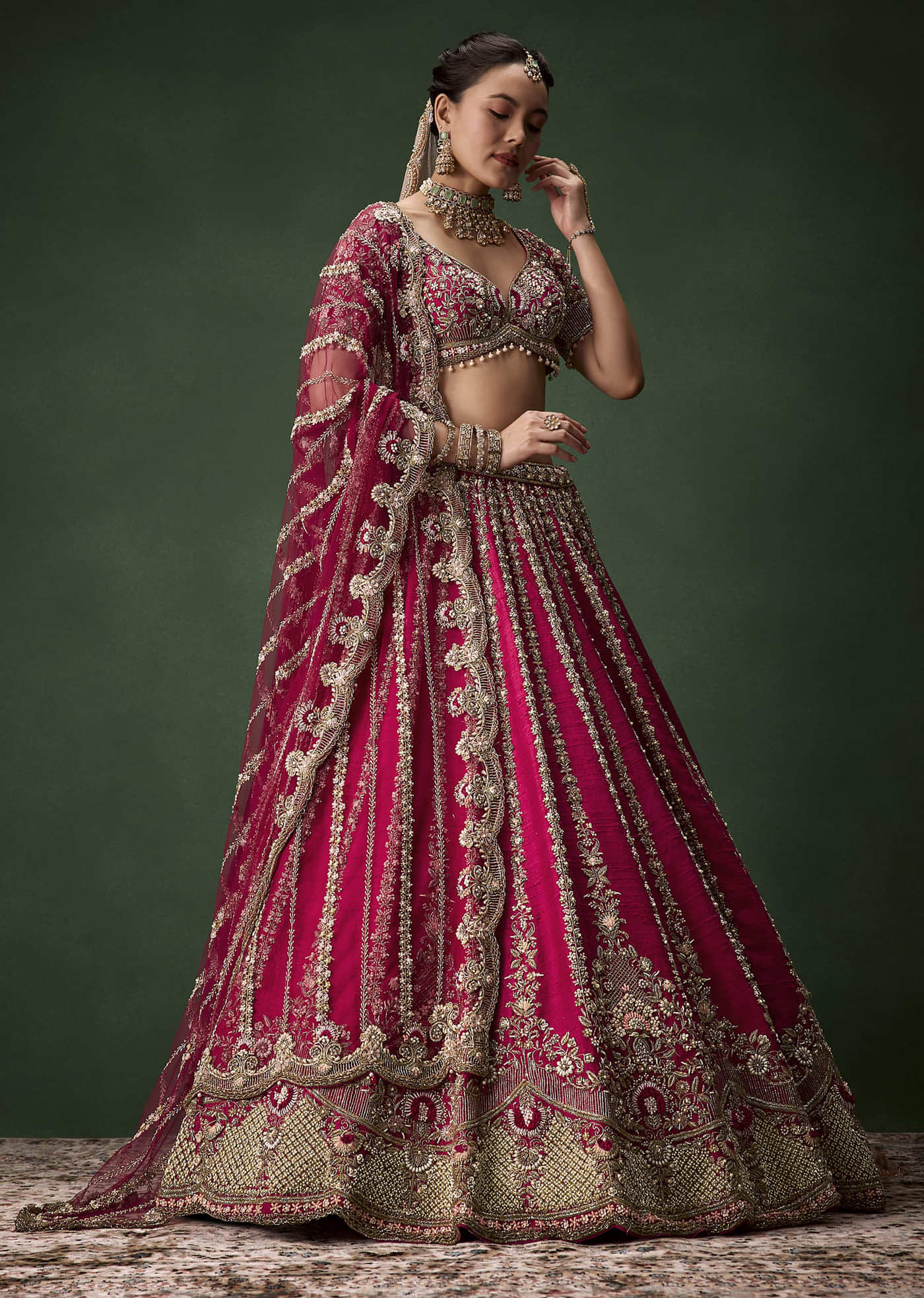 Complete the look with heirloom jadau jewelry and soft, blushed makeup to complement the rich work and romantic hue.