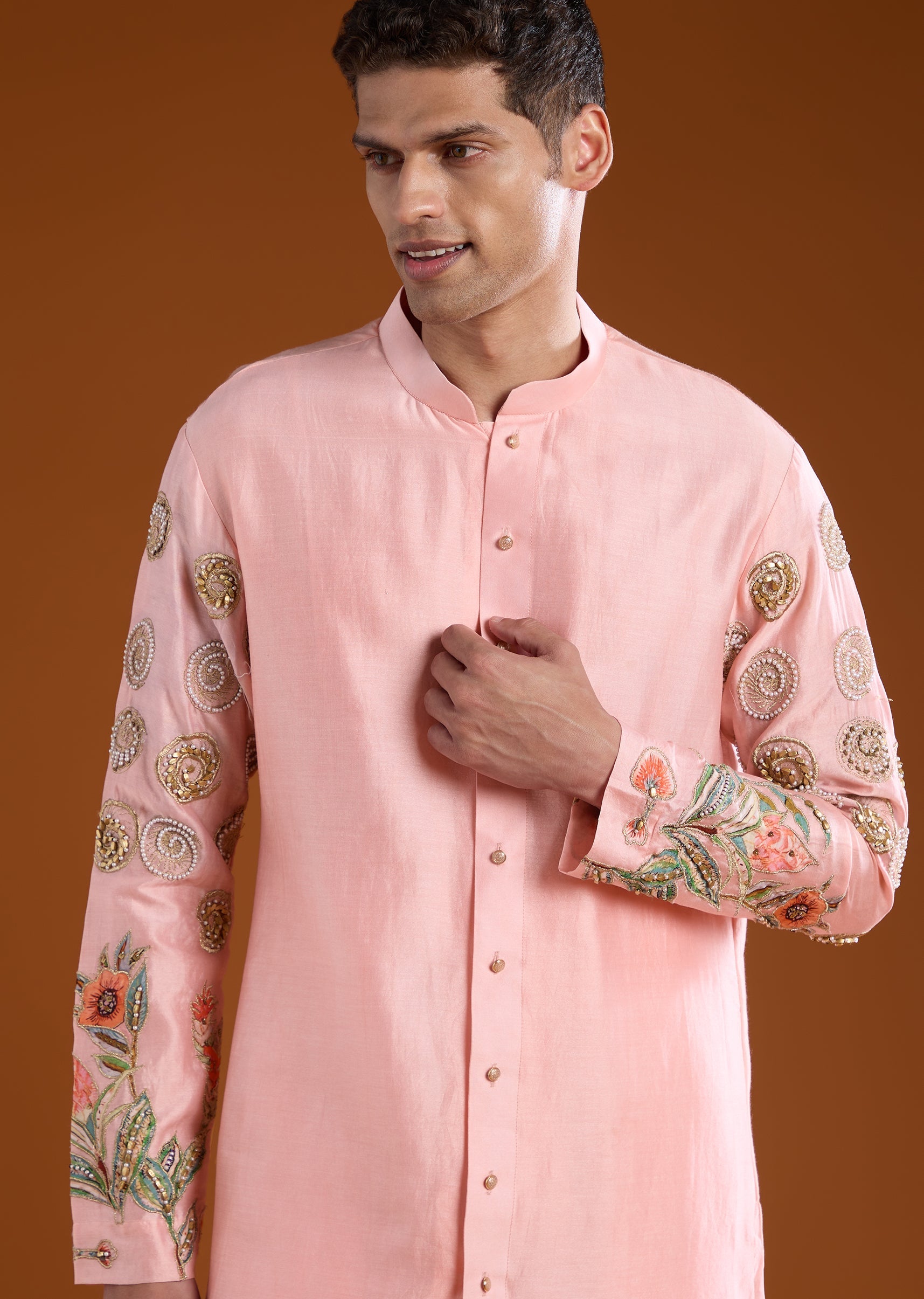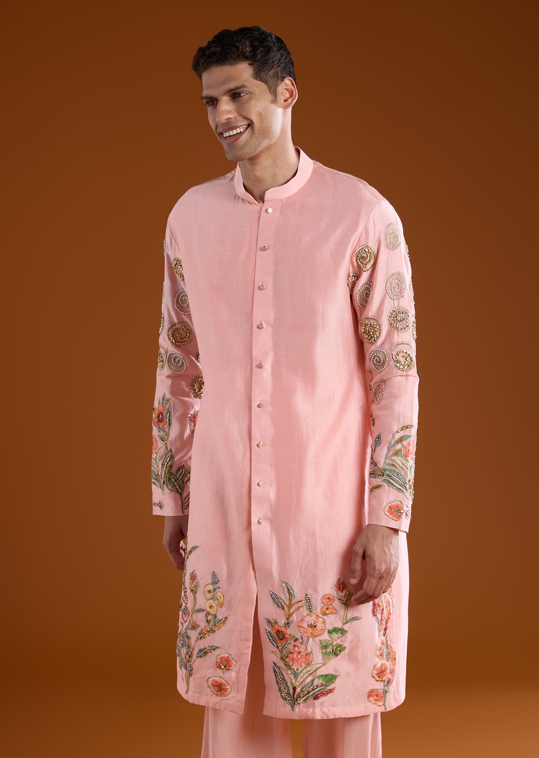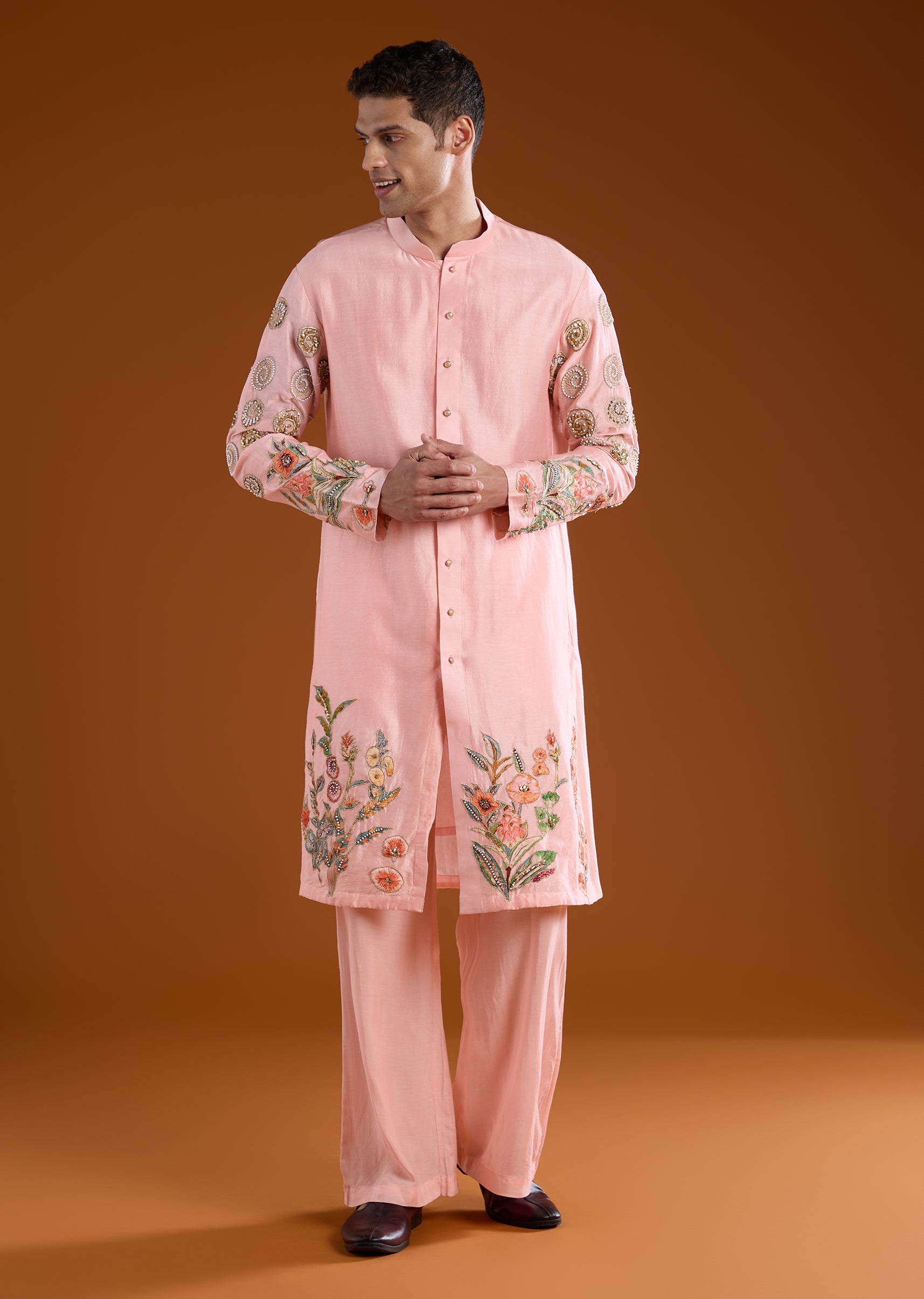 Pink Chanderi Embroidered Mens Kurta Pant Set