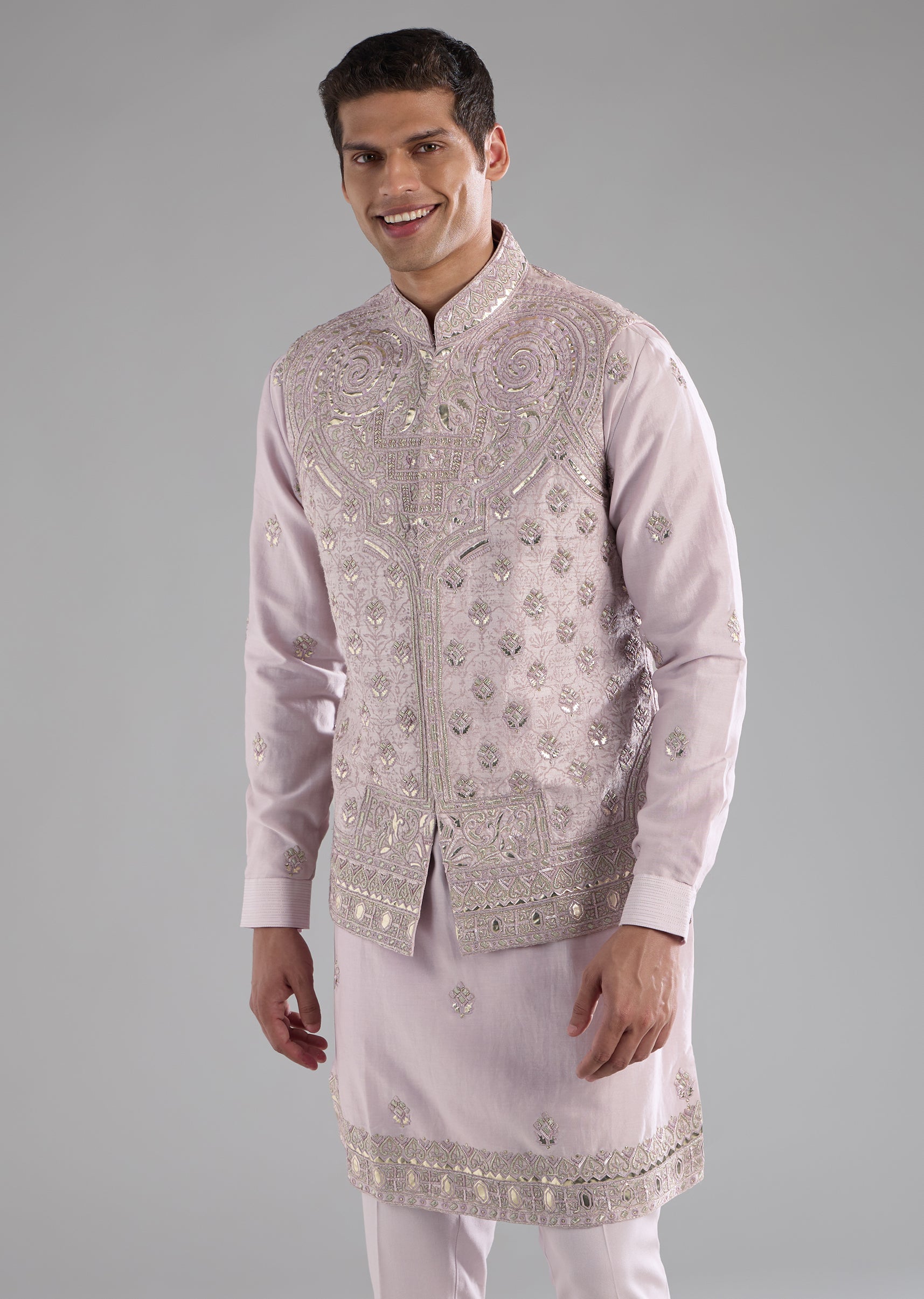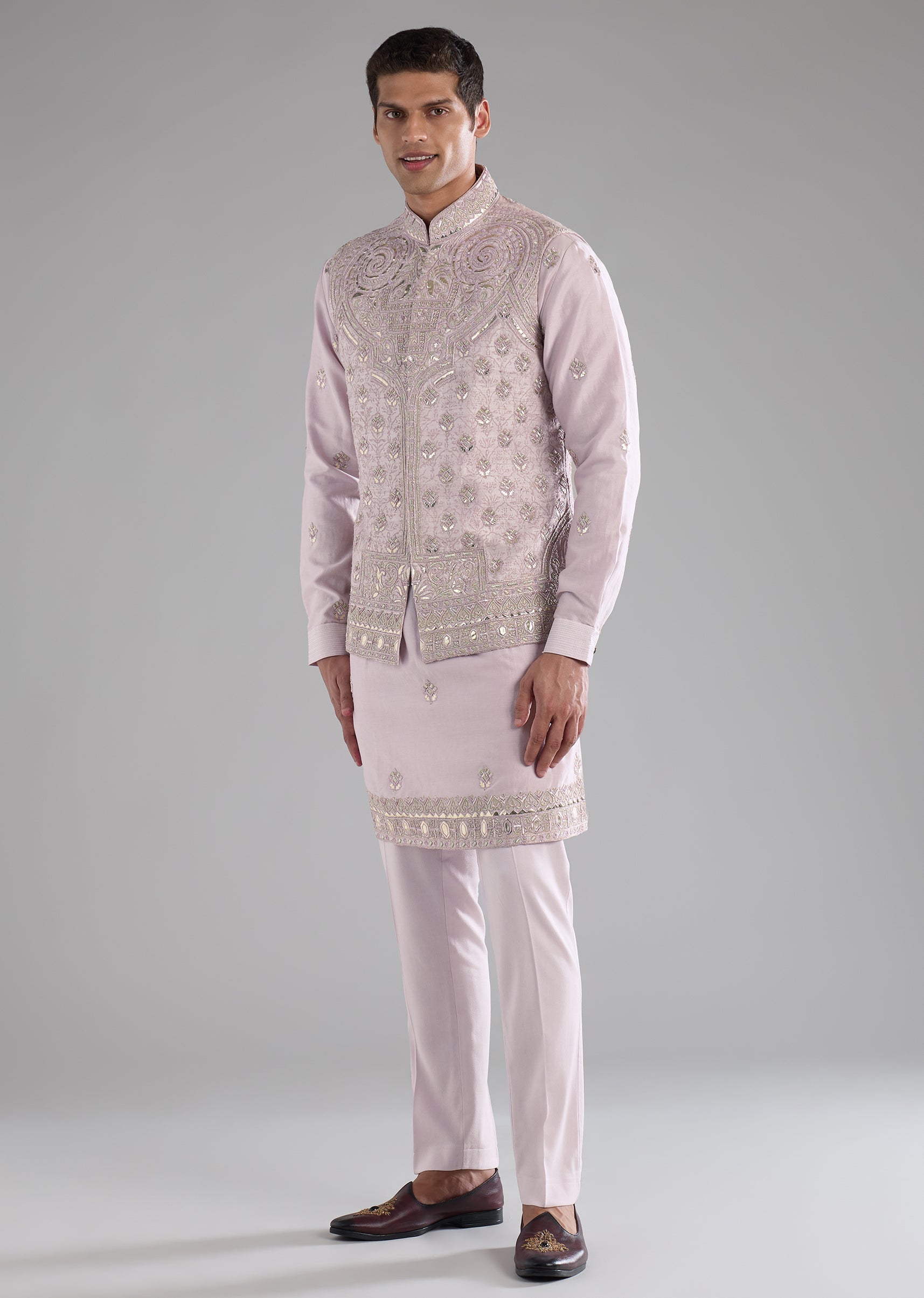 A bold interplay of texture and craftsmanship defines this chanderi and raw silk jacket kurta set. Accented with refined thread and resham embroidery, leather detailing, and subtle sequin highlights, the ensemble brings a contemporary edge to traditional design. The full sleeves and mandarin collar lend structure and sophistication, while the layered jacket adds depth and presence. Paired with a coordinated kurta and pants, this set is ideal for weddings, festive occasions, and statement evening events.Awarded as the Most Trusted Brand, we're delivering styles you love, just as promised.