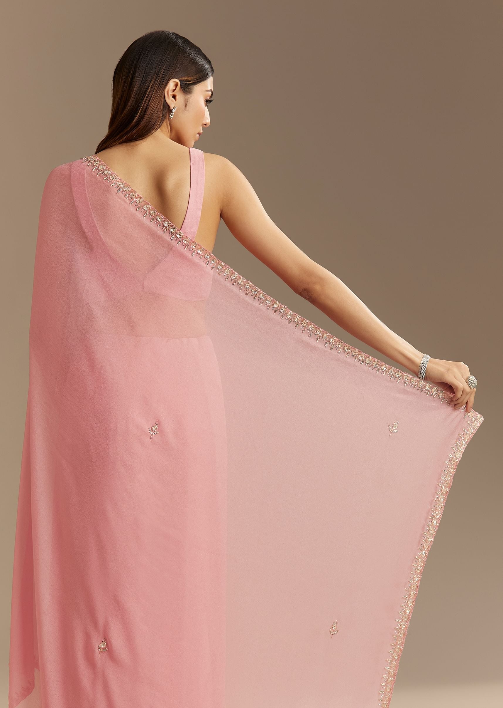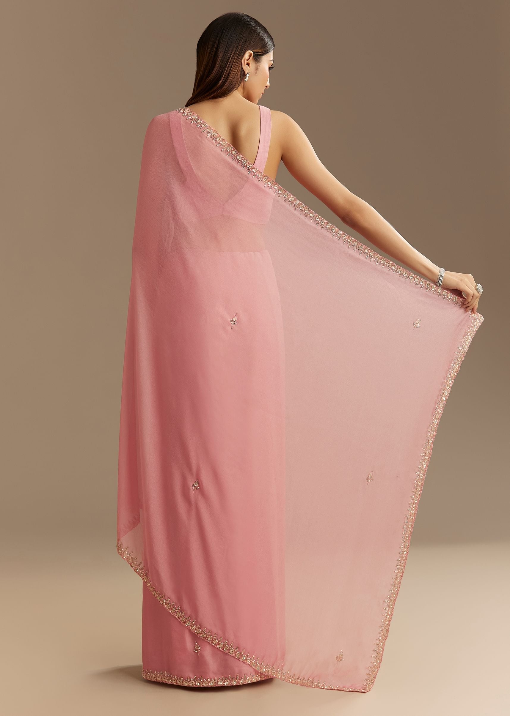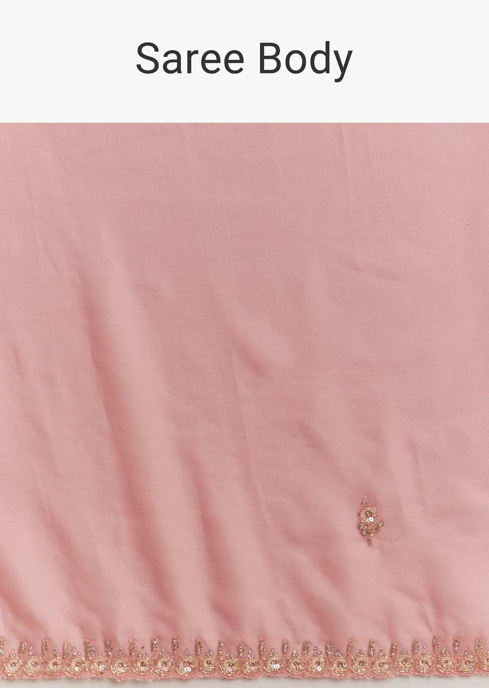 Pink Chinnon Saree With Cutdana Sequins Embroidery And Scallop Border