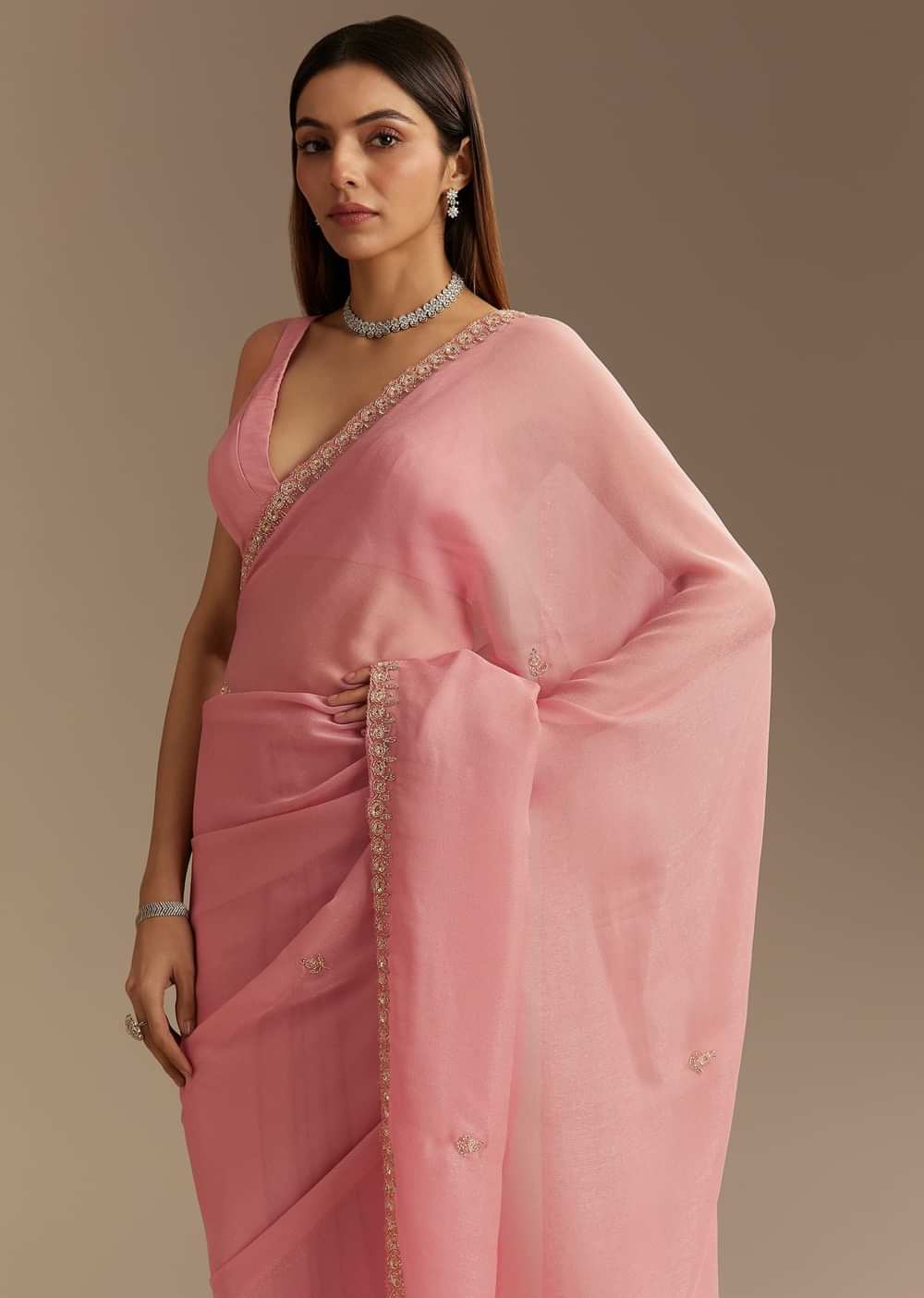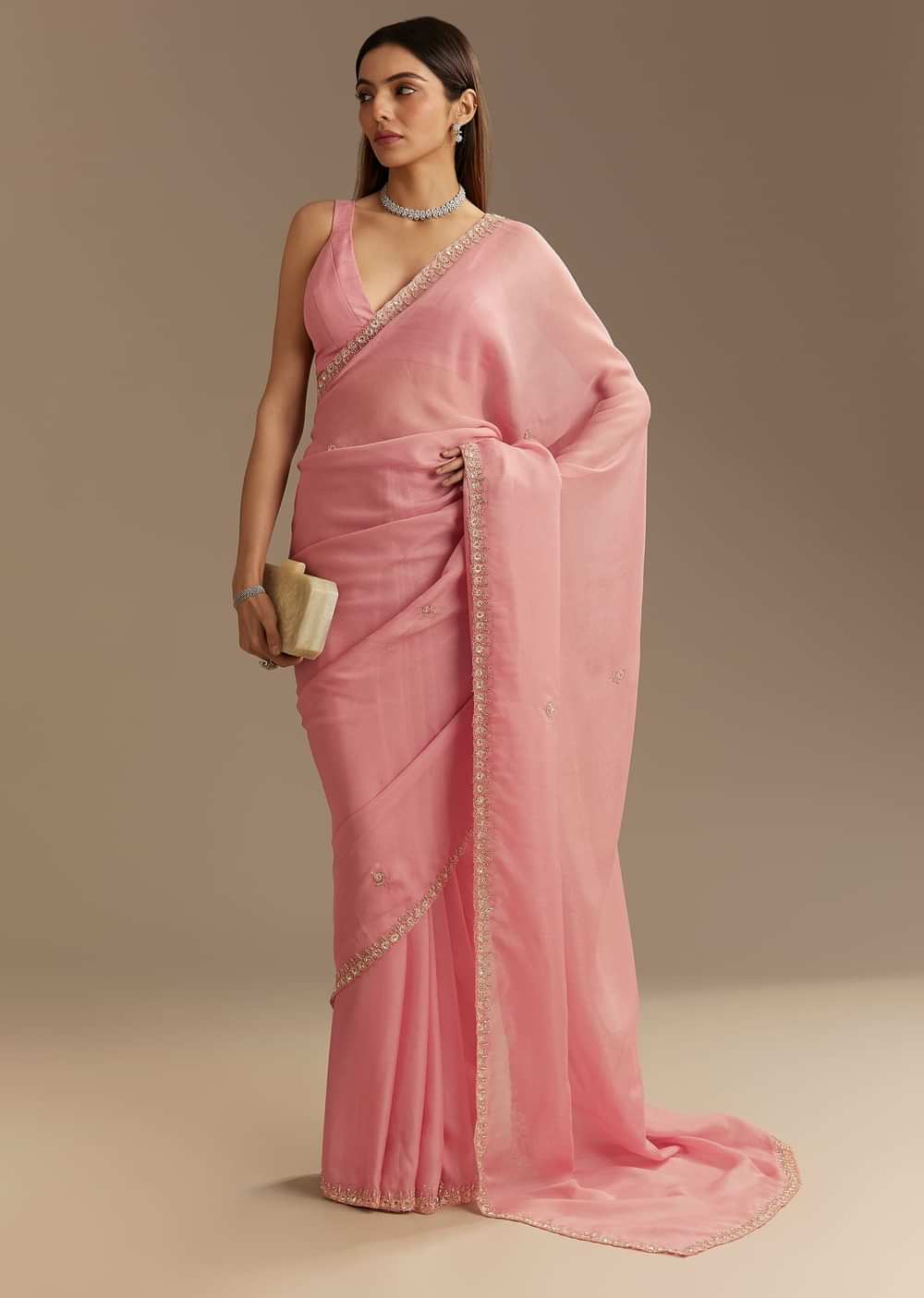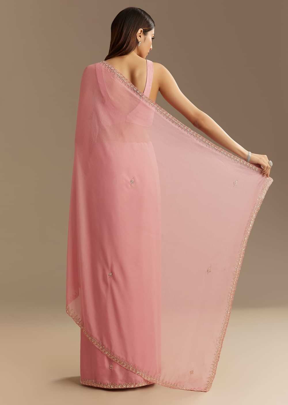 Delicate And Refined This Pink Chinnon Saree Is A Vision Of Elegance Adorned With Intricate Cutdana And Sequins Embroidery. The Lightweight Fabric Flows Effortlessly While The Scallop Border Enhances Its Feminine Charm. Subtle Shimmer From The Embellishments Creates A Graceful Allure Making It Perfect For Festive And Celebratory Occasions. A Timeless Piece That Radiates Sophistication This Saree Is Designed To Captivate.Awarded As The Most Trusted Brand We'Re Delivering Styles You Love Just As Promised.