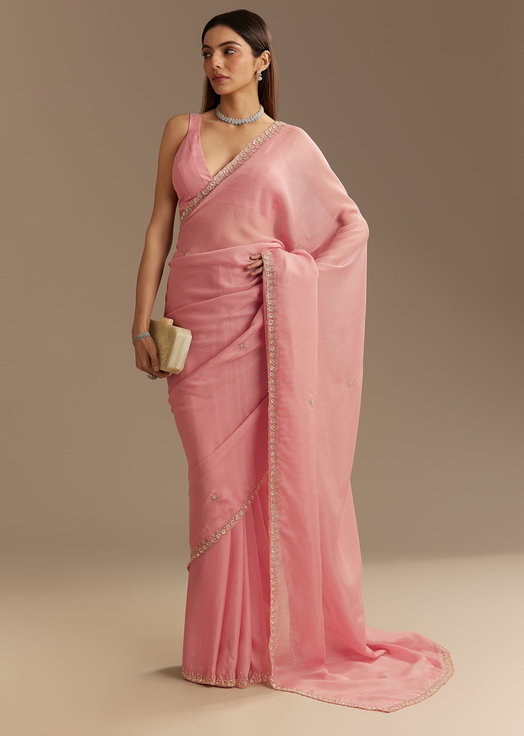 Delicate And Refined This Pink Chinnon Saree Is A Vision Of Elegance Adorned With Intricate Cutdana And Sequins Embroidery. The Lightweight Fabric Flows Effortlessly While The Scallop Border Enhances Its... More Product Details