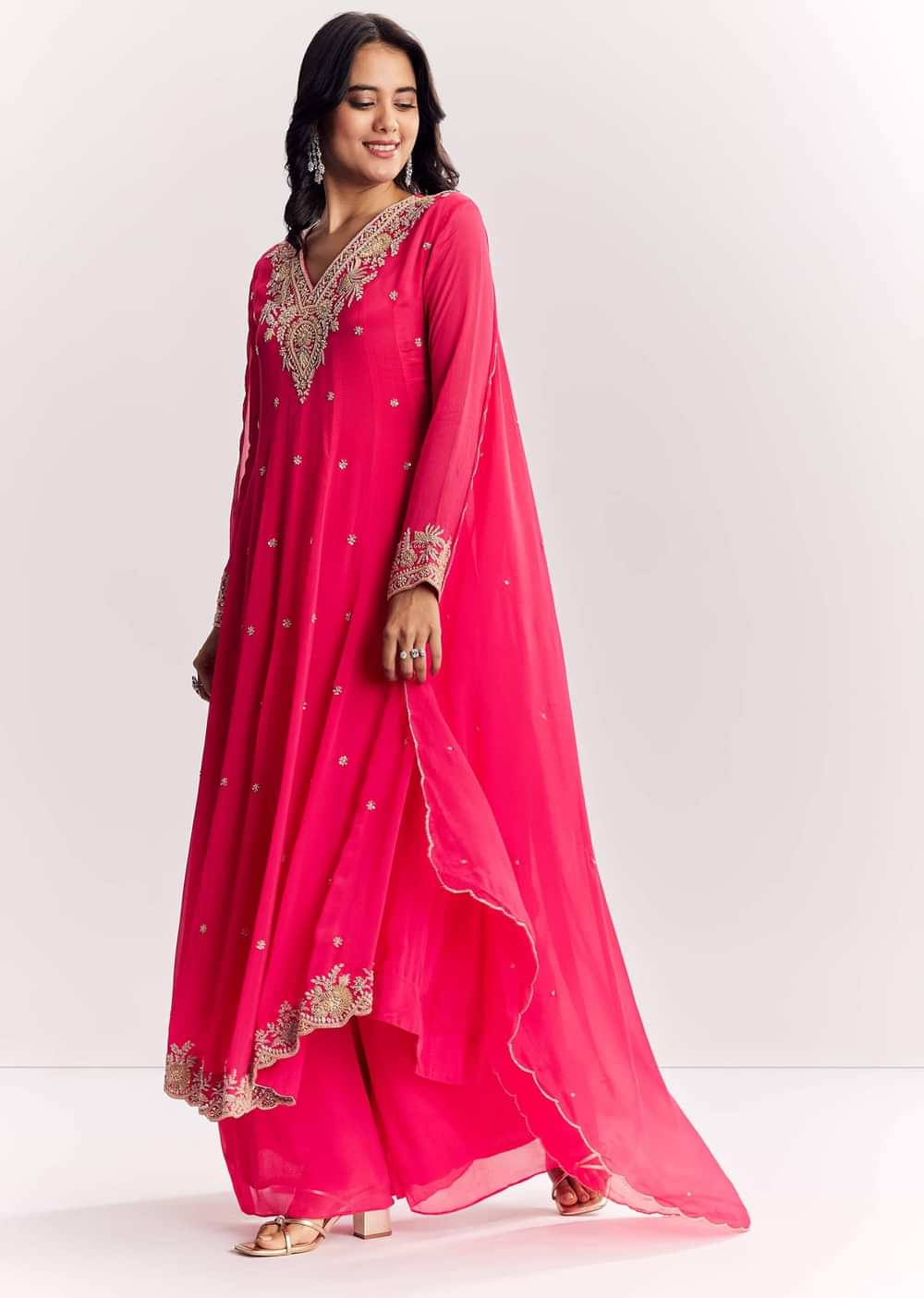 Pink Chinon Anarkali Dupatta Suit With Sequins Cutdana And Moti Work