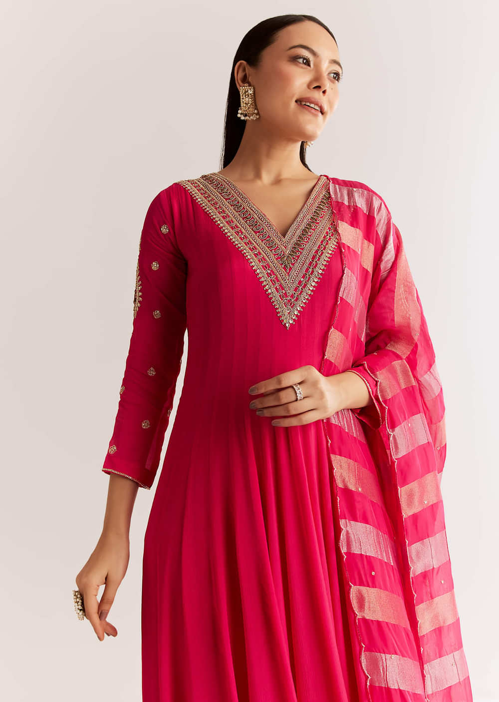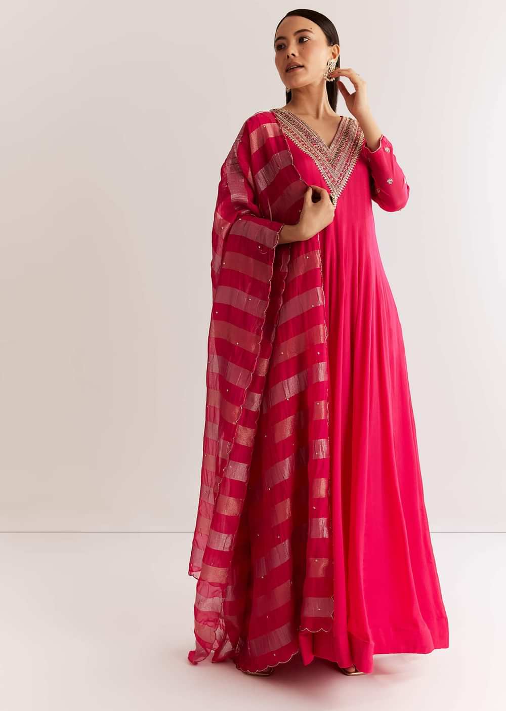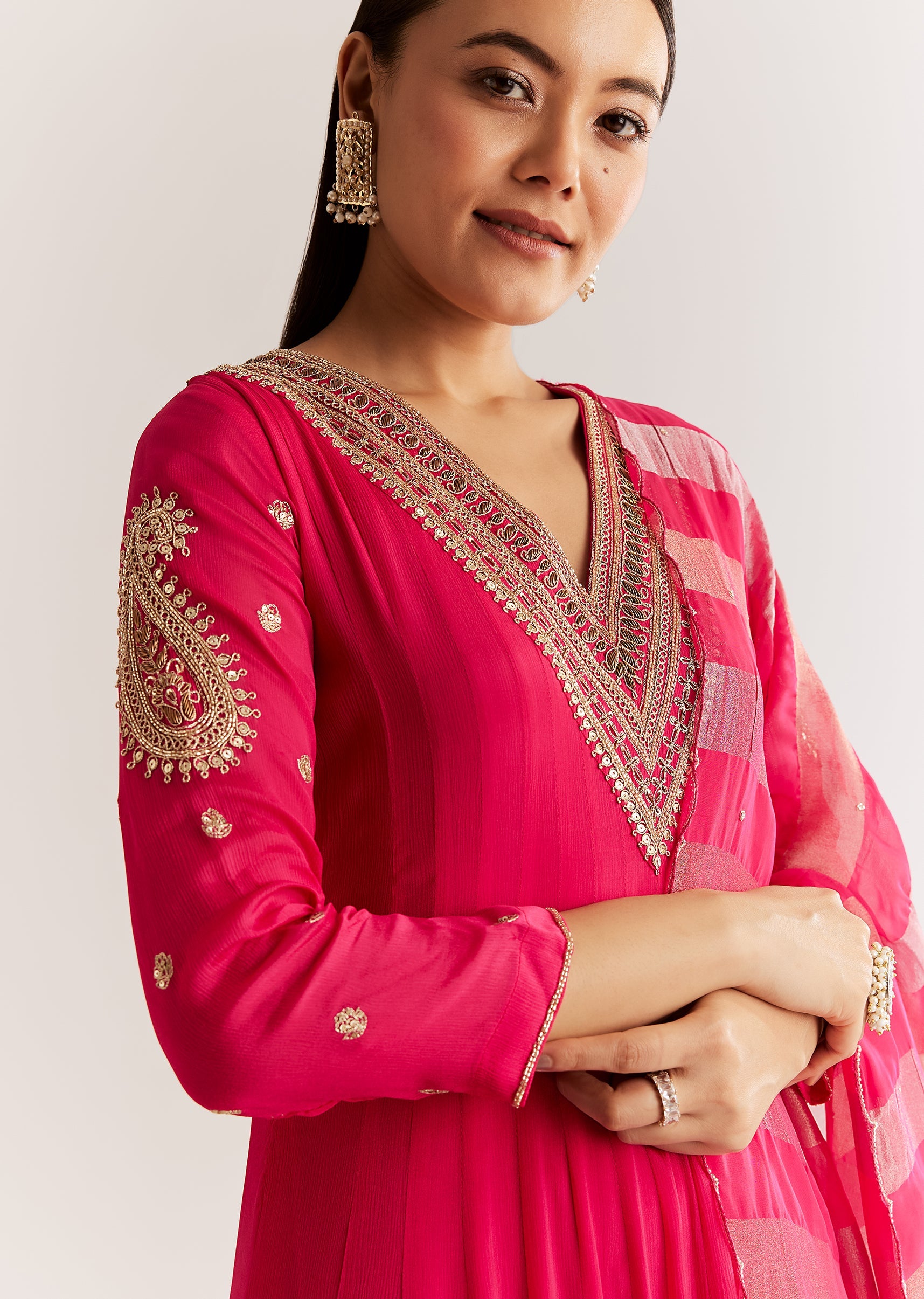 A graceful pink chinon anarkali adorned with zardosi and sequins embroidery, paired with a soft dupatta highlighted with shimmering cutdana work. Perfect for festive elegance. Awarded as the Most Trusted... More Product Details