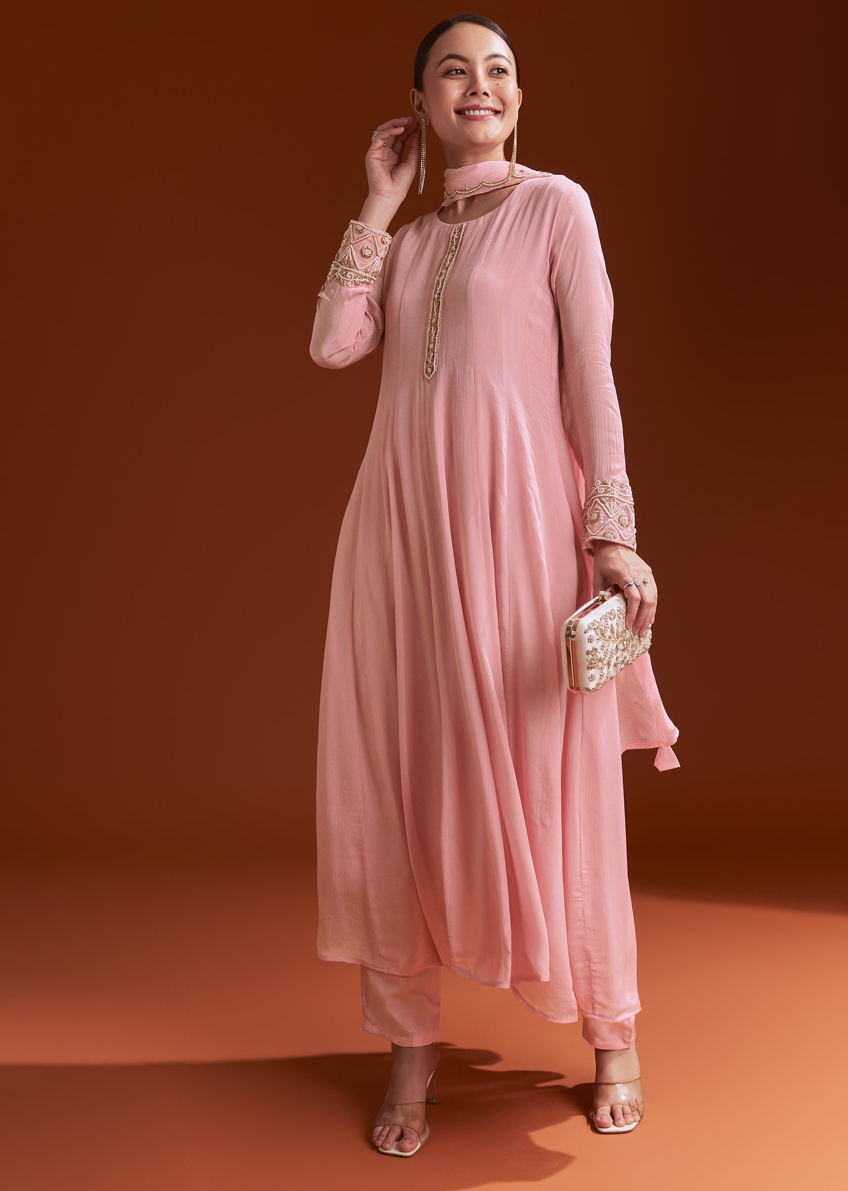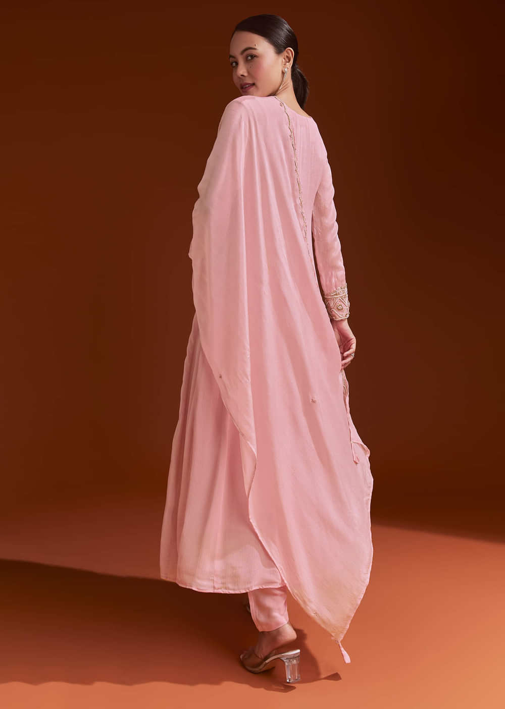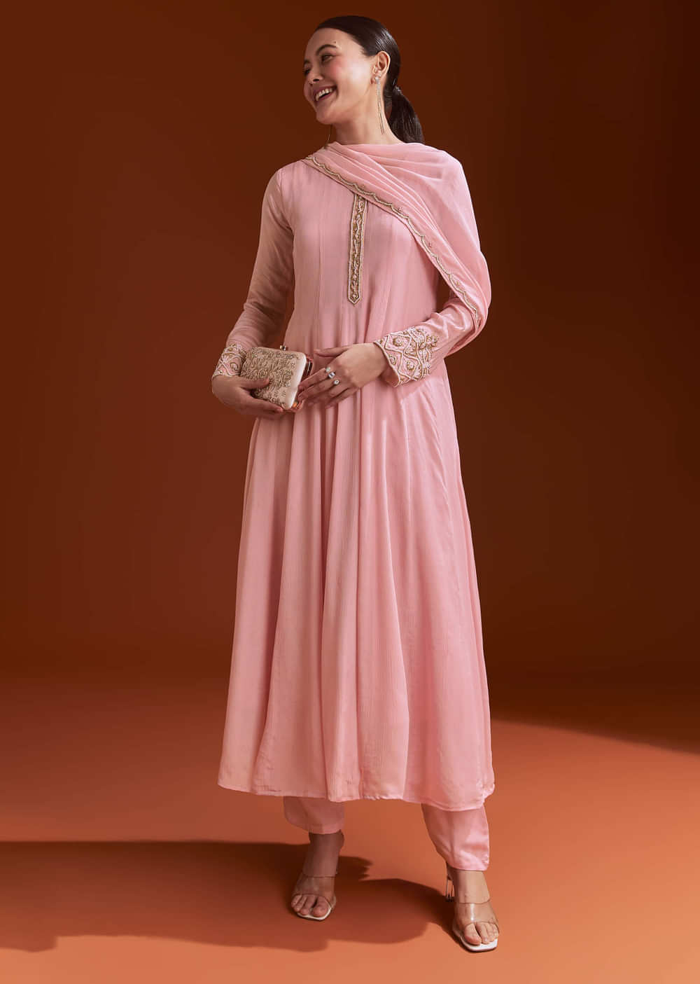Crafted in soft pink chinon, this anarkali features delicate bead and stone embroidery on the neckline and sleeves. A feminine pick for pooja occasions. Standard length for Anarkali is 48".... More Product Details