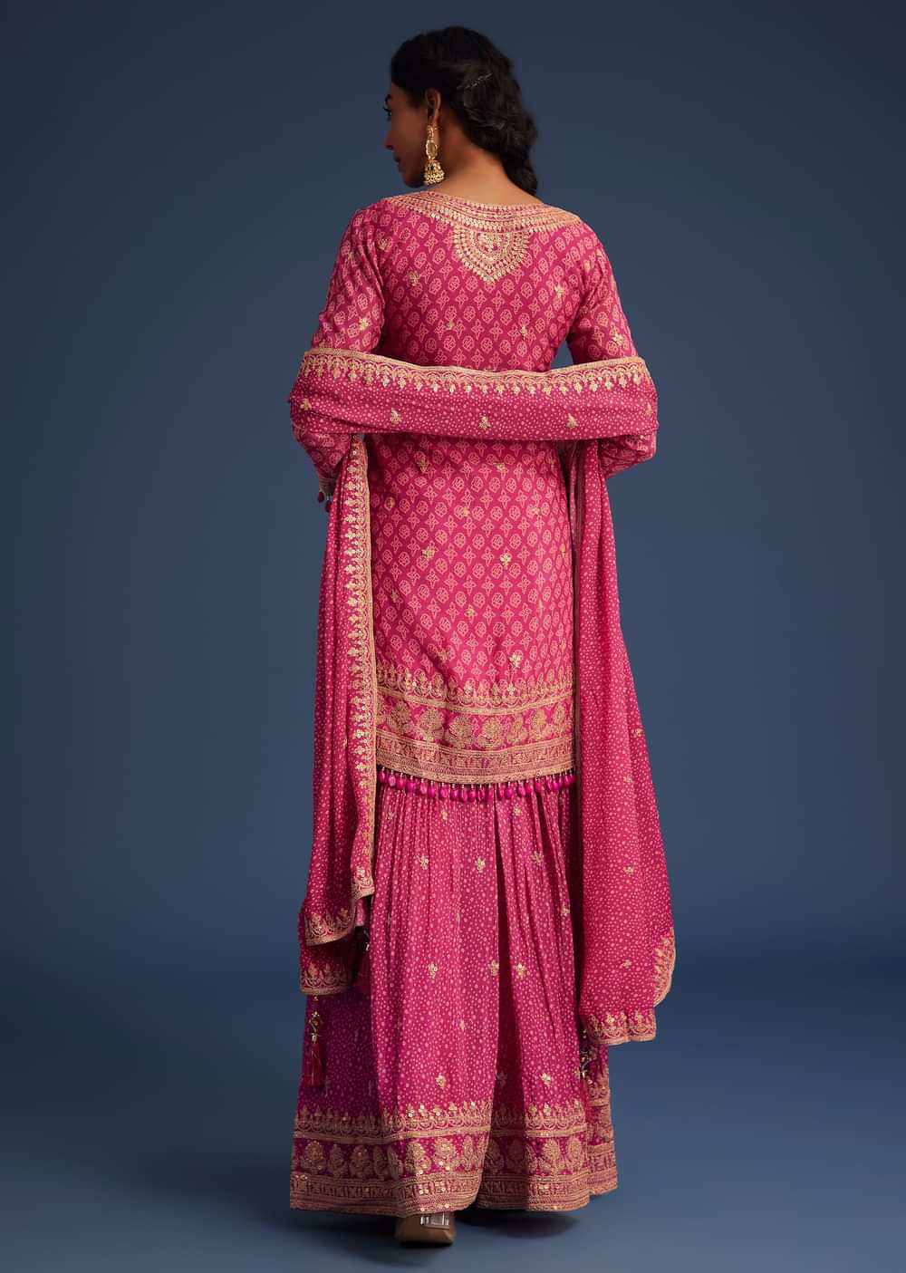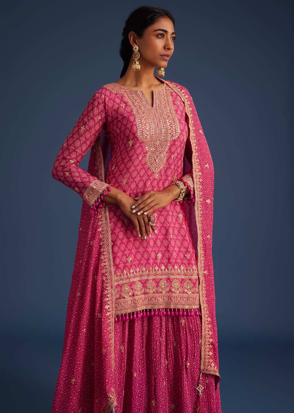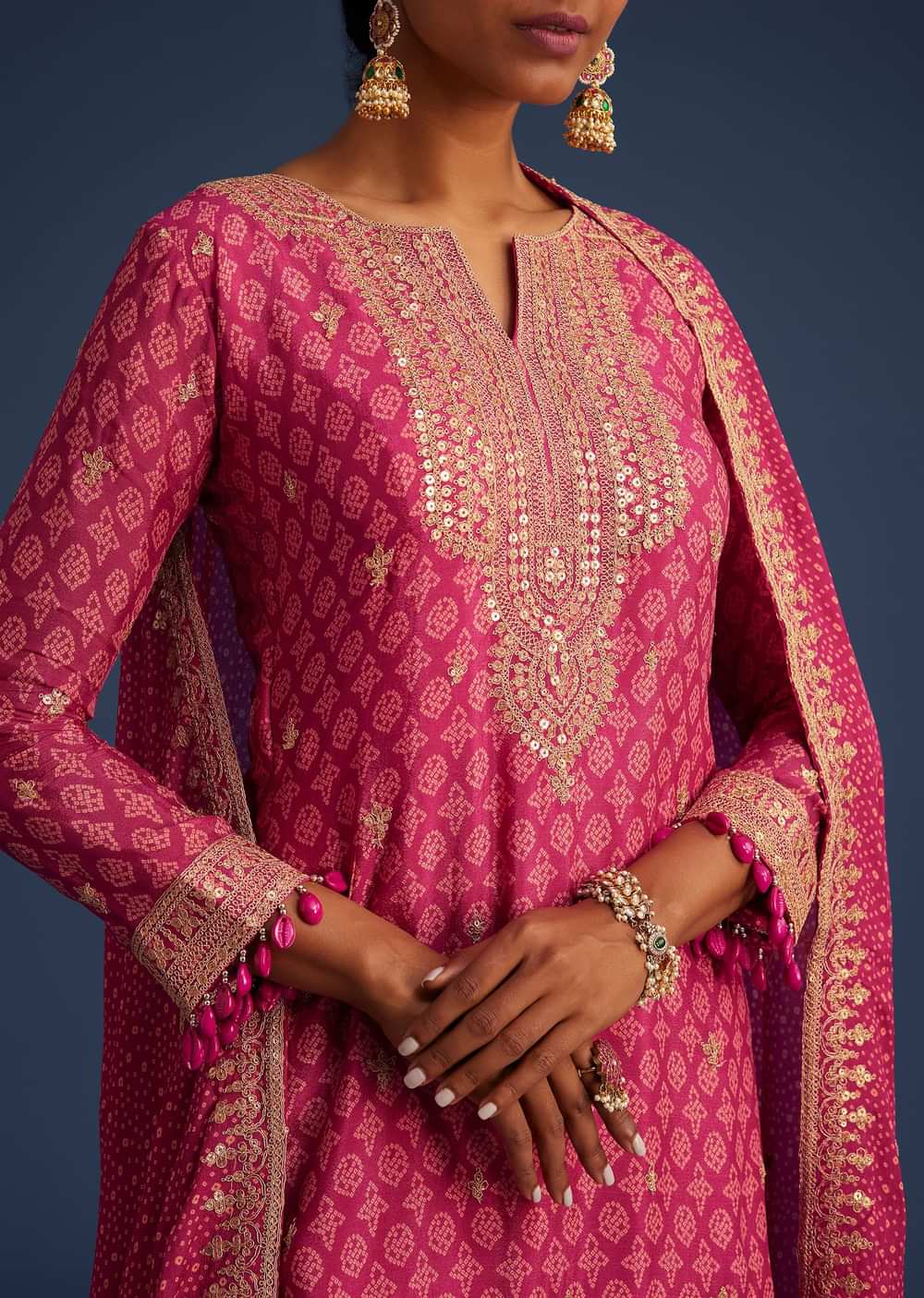 • Celebrate Grace And Tradition With This Pink Chinon Palazzo Set Intricately Designed With Classic Bandhani Prints And Dazzling Sequins And Zari Embroidery.
