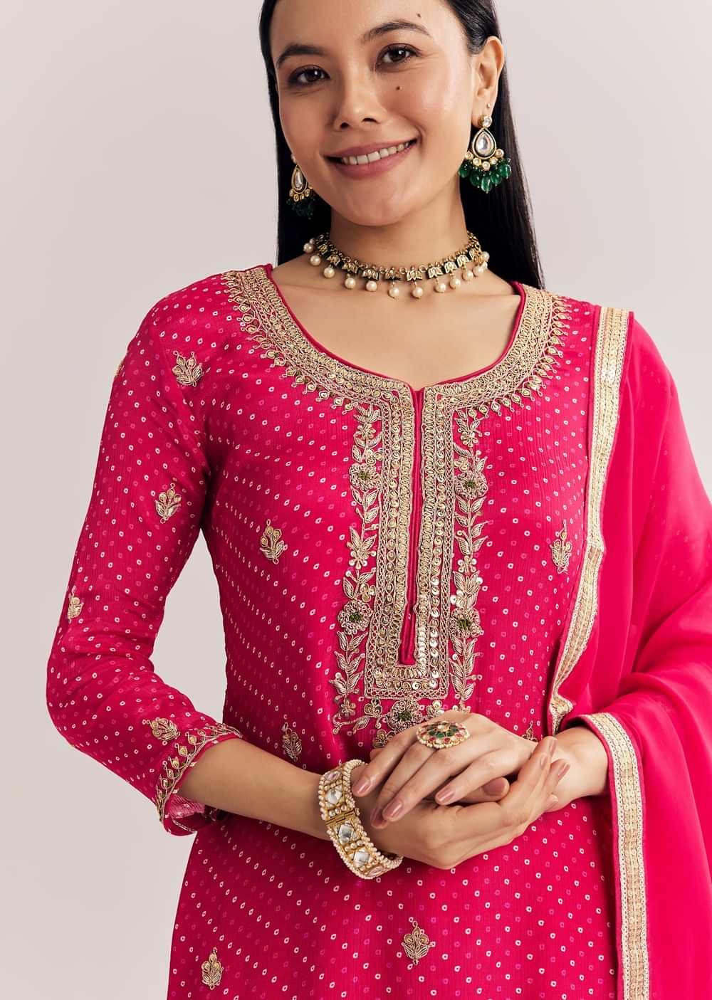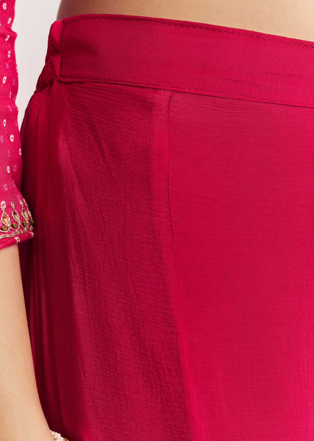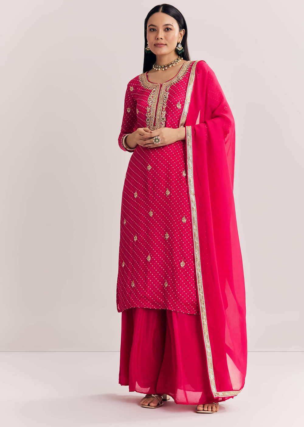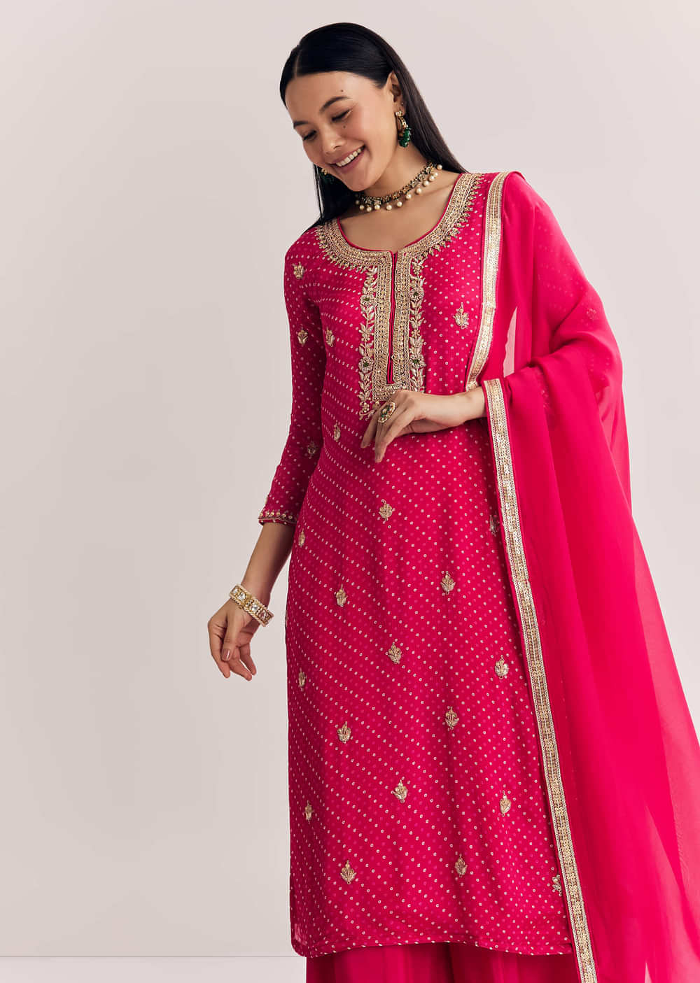 Twirl into festive bliss with this pink chinon kurta palazzo suit, asymmetrically cut and adorned in delicate embroidery—crafted for modern celebrations. Awarded as the Most Trusted Brand, we're delivering styles... More Product Details