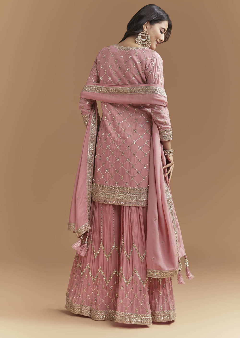 Pink Chinon Palazzo Suit With Intricate Hand Work