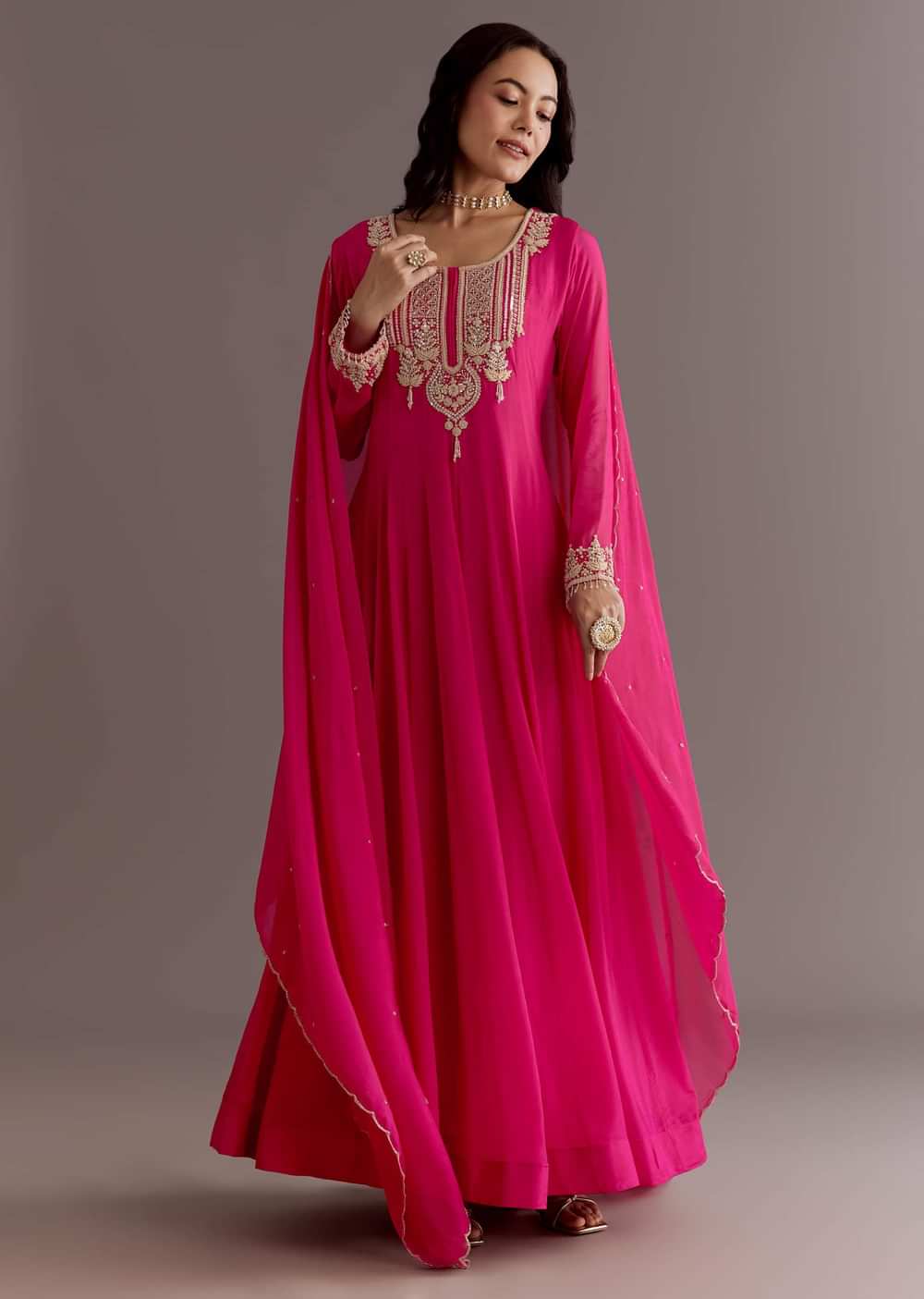 This pink chinon anarkali is spun with soft thread and shimmering sequins, gliding with every step like a love song. The dupatta adds rhythm with its scattered cut dana embroidery.Standard... More Product Details