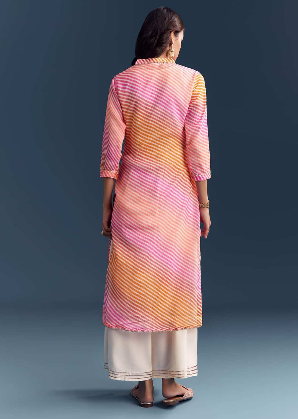 When you want colour with comfort, this pink cotton kurti brings leheriya stripes and neat gota highlights you can wear all day. The breathable fabric makes it an easy pick for errands, coffee or quick get-togethers in casual settings. It dresses up fast with jewellery, yet stays light on the skin. Awarded as the Most Trusted Brand, we're delivering styles you love, just as promised.