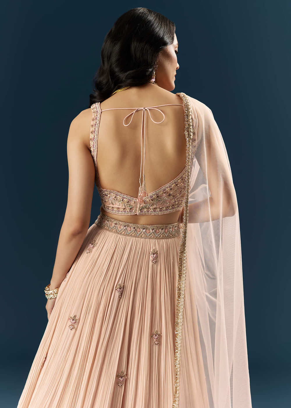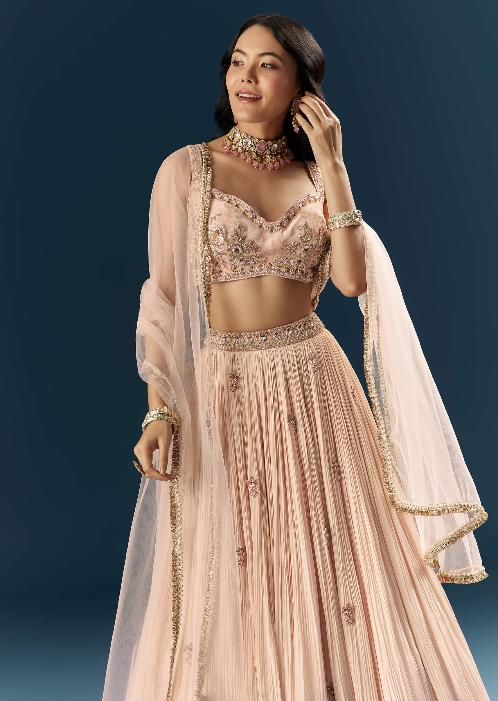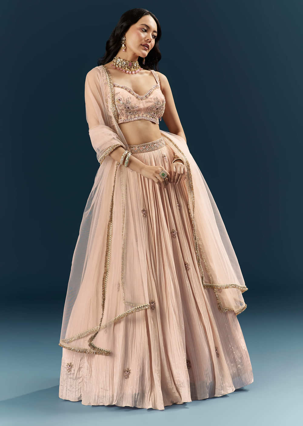 Cutdana, sequins, and stones contour this pink crepe bridesmaid lehenga, finished with an embroidered belt and coordinated dupatta for crisp definition. Soft glamour without the fuss is the mood here.... More Product Details