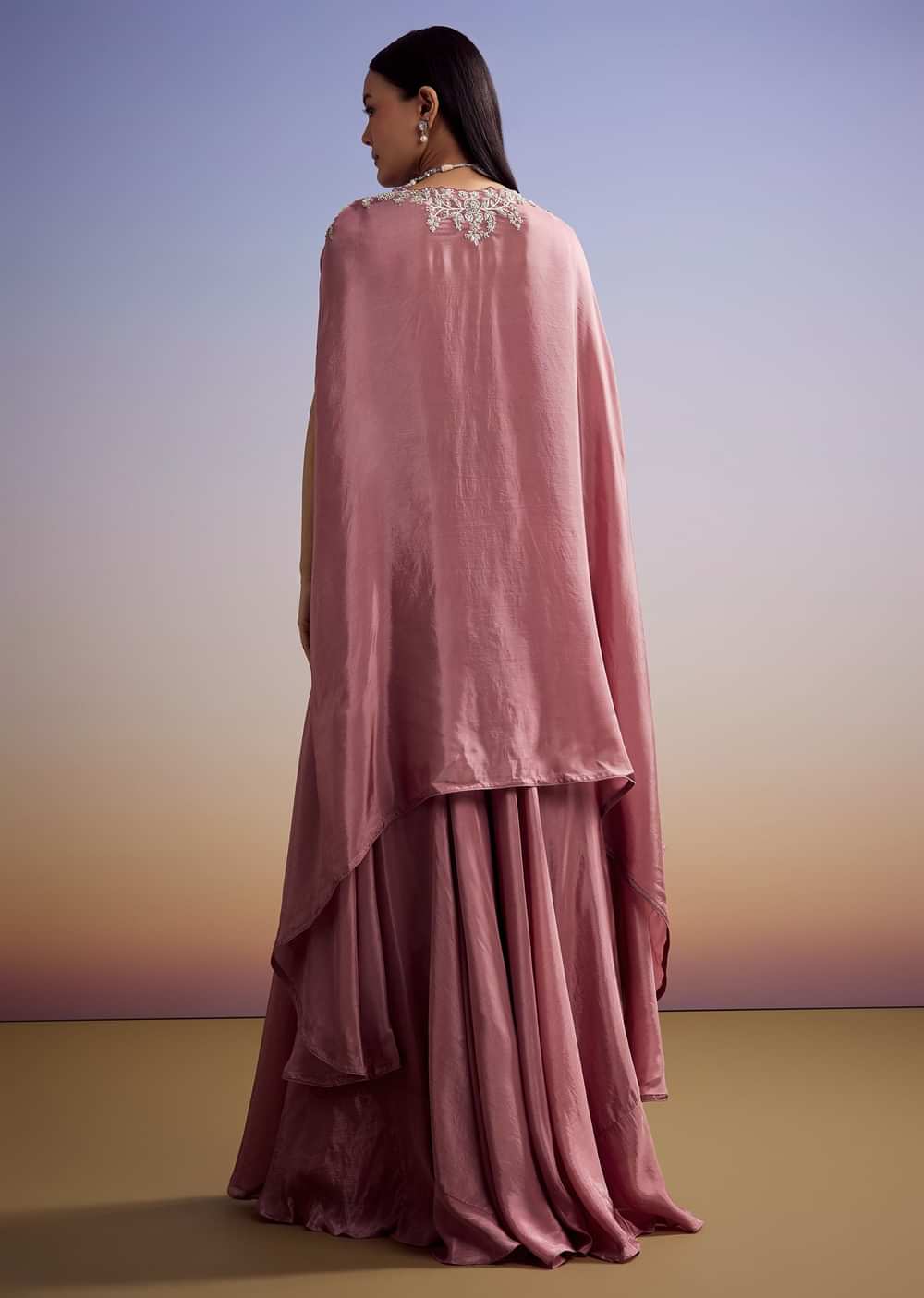 Pink Crepe Crop Top And Cape Set With Embroidery