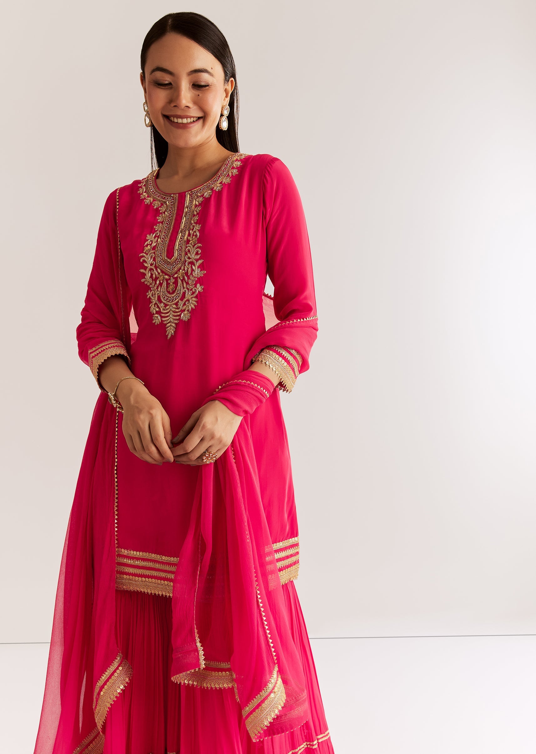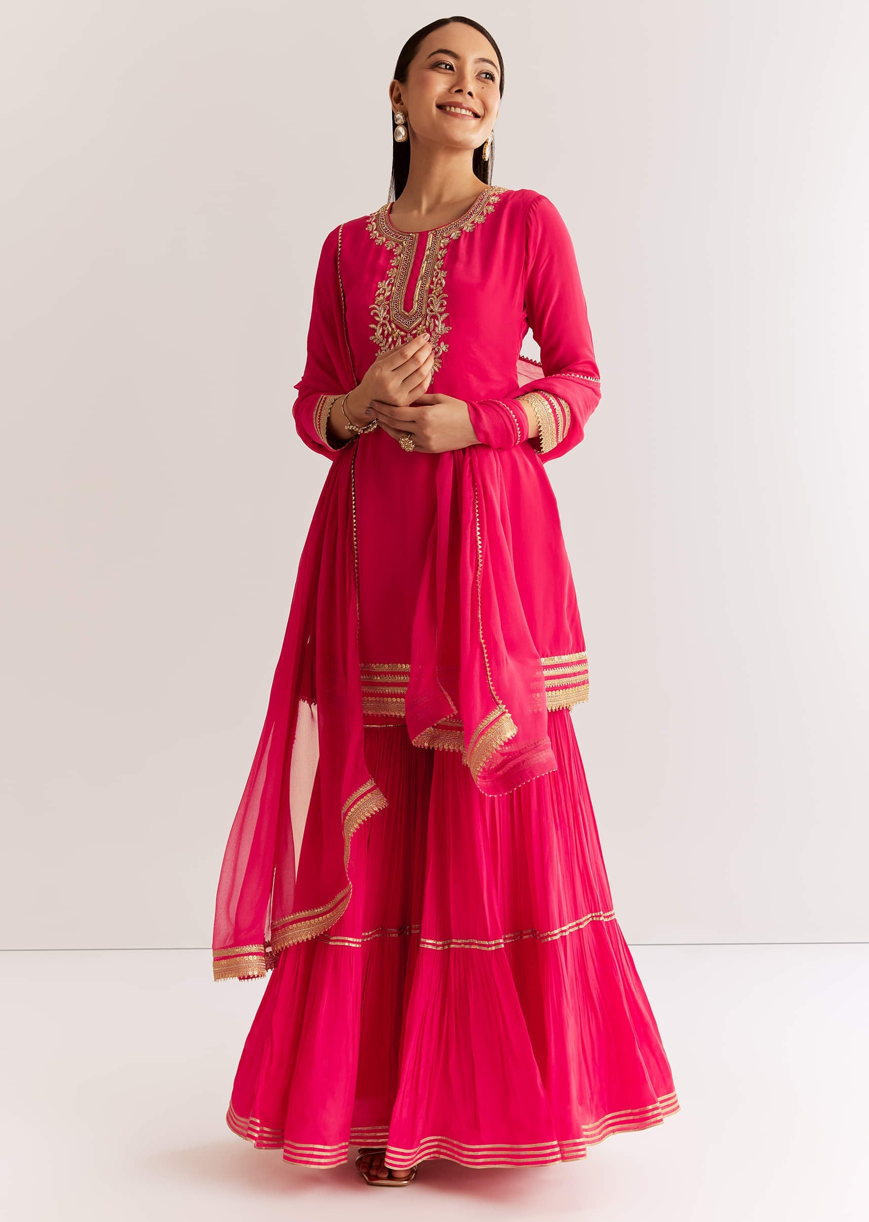Crafted in pink crepe, this kurta is embellished with zardosi and sequins work. The gotta lace bordered dupatta brings festive vibrance to life. Awarded as the Most Trusted Brand, we're... More Product Details