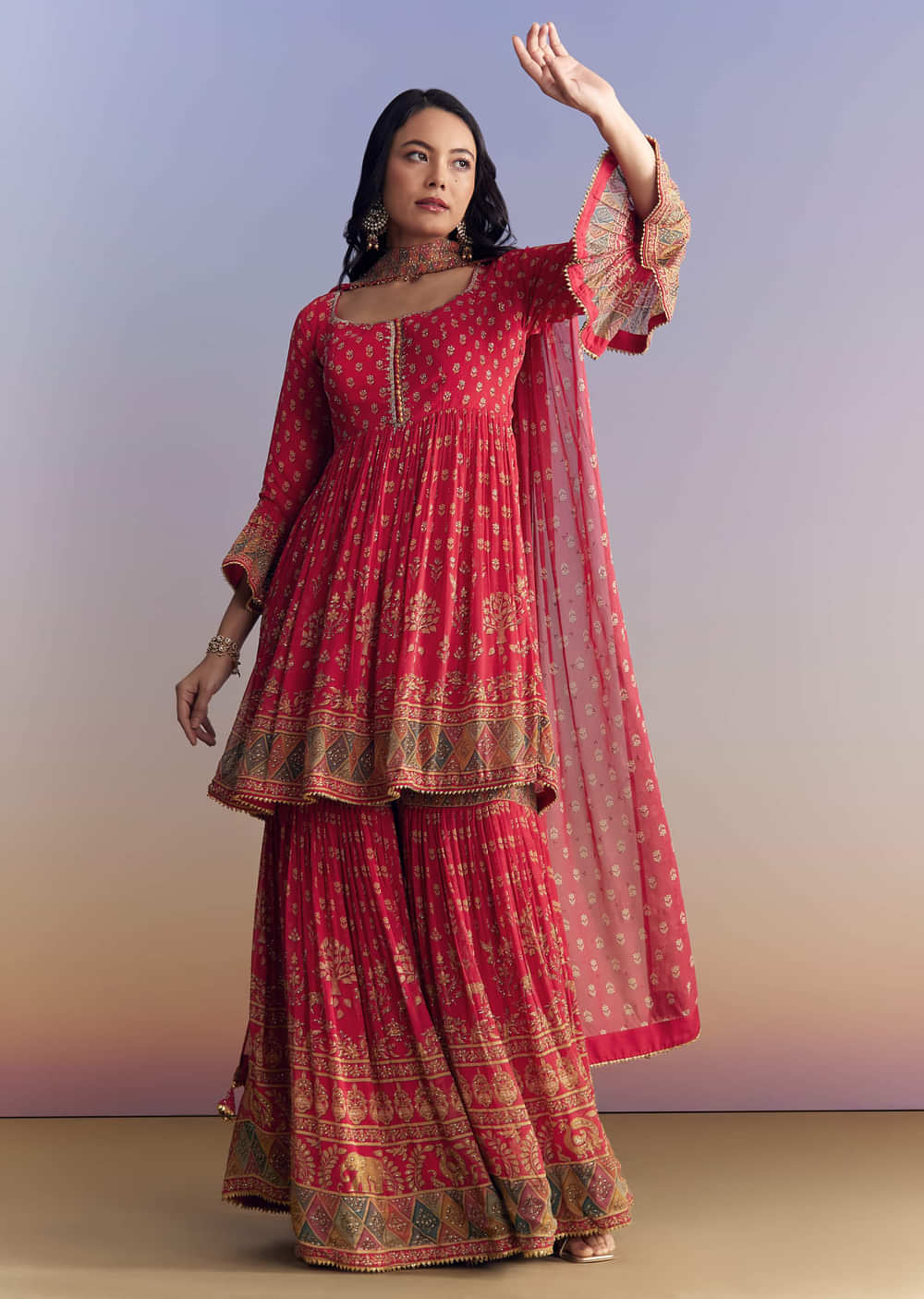 The kurta should feel easy and secure through the bodice with gentle room at the peplum, while the sharara sits mid-waist with a smooth, twirl friendly flare.